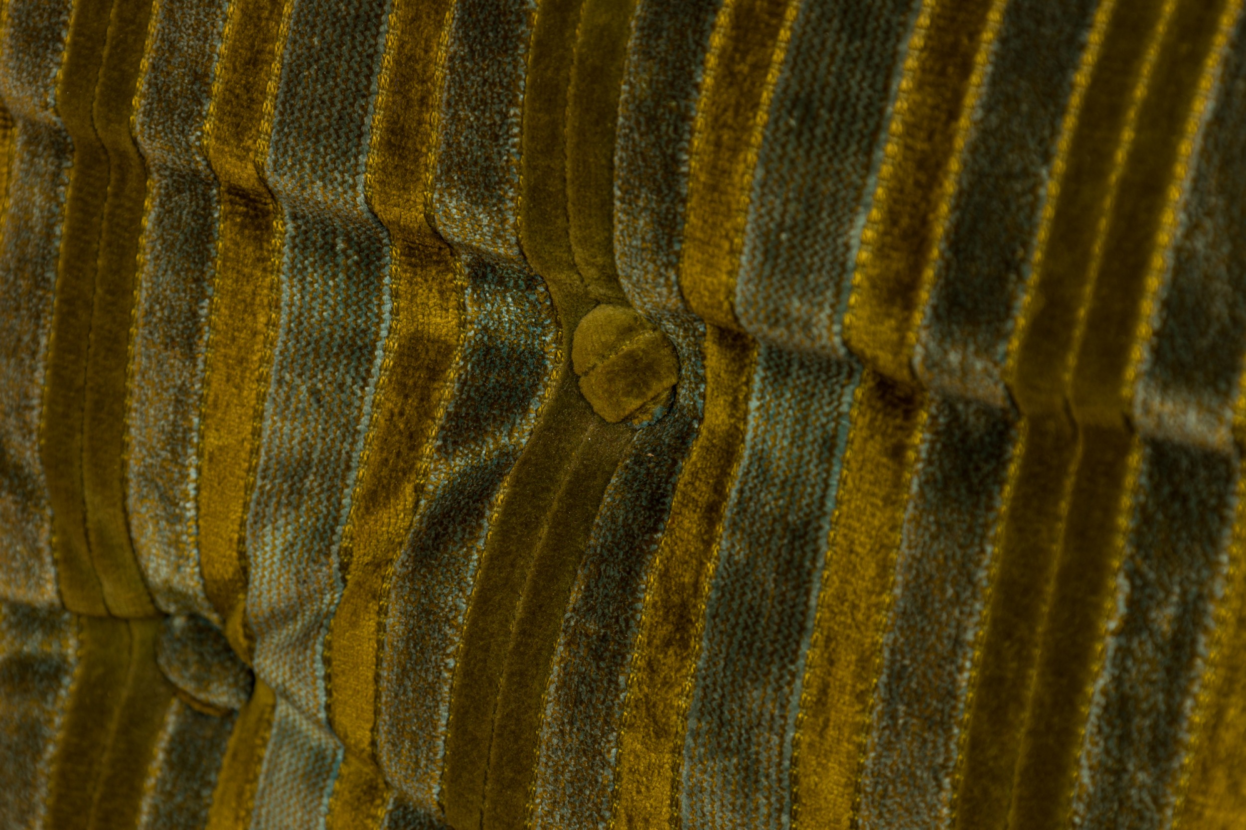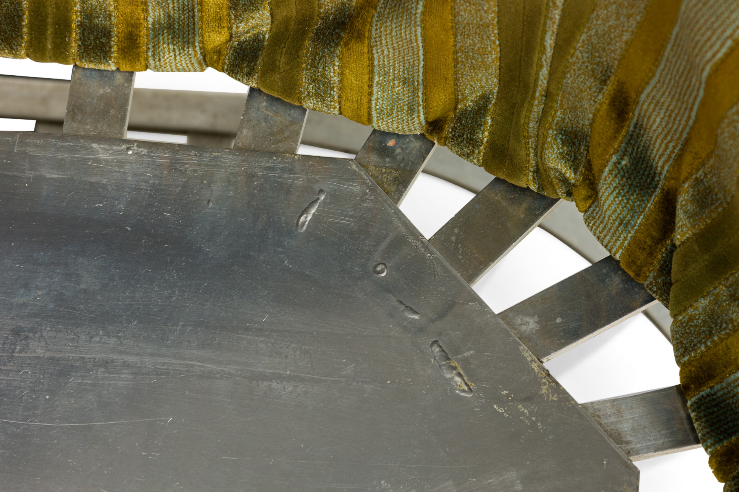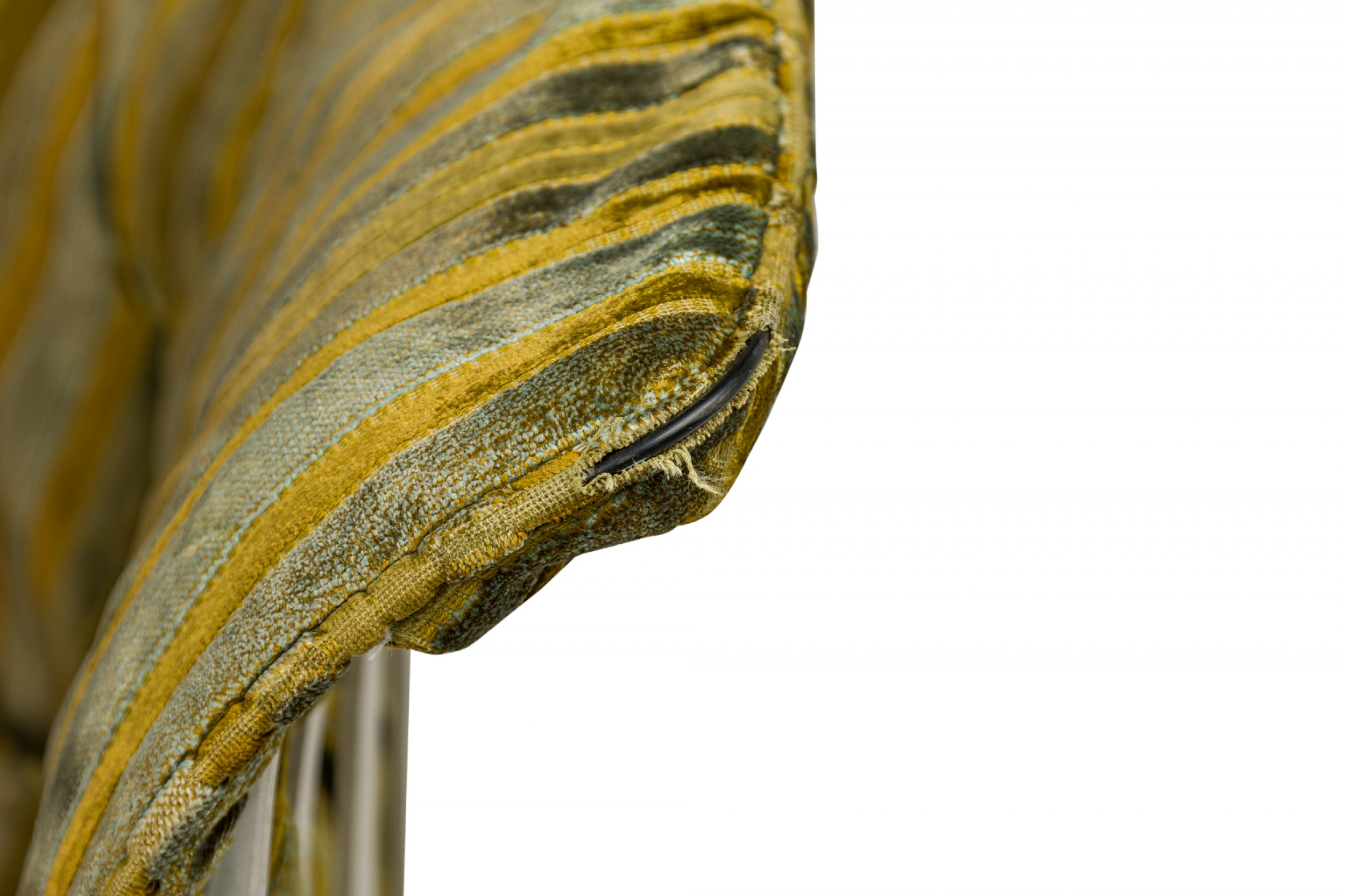 American Mid-Century settee with a form comprised or molded aluminum slats with sloped sides and a tulip base, upholstered with a button tufted multi-tonal green striped velvet fabric.