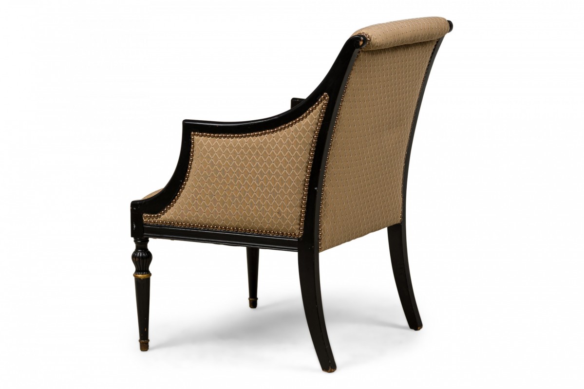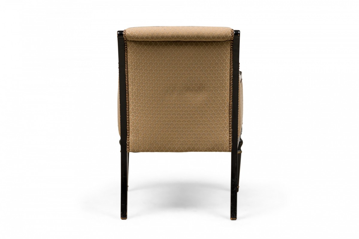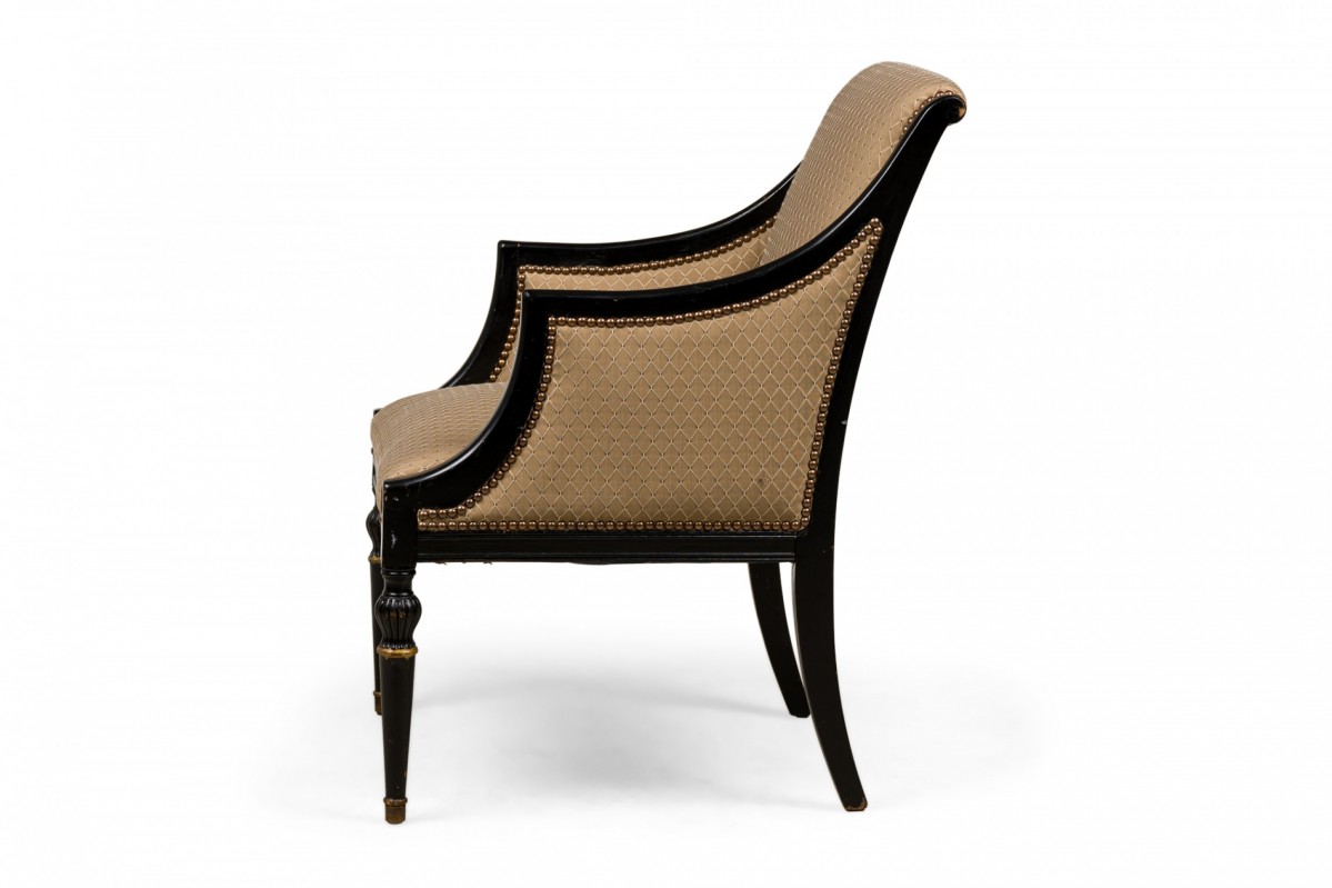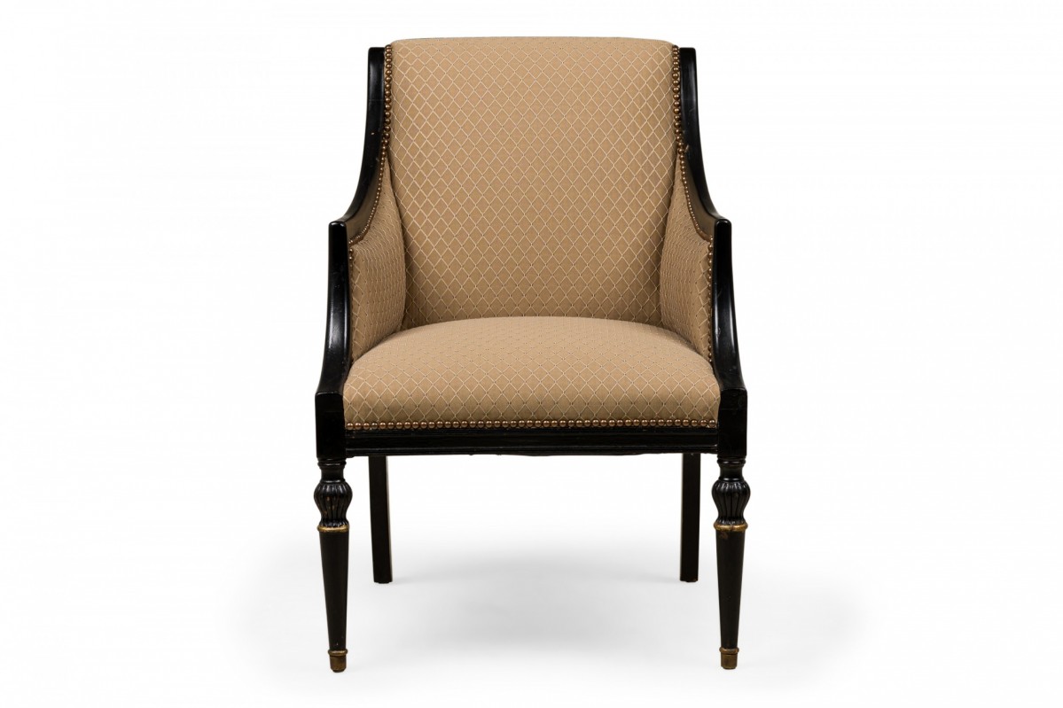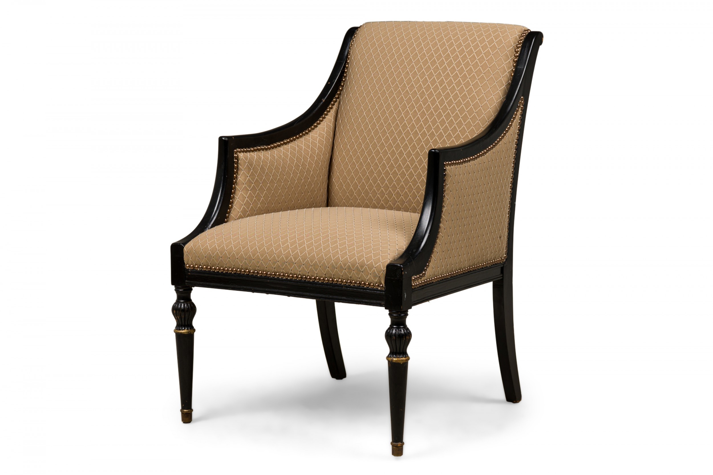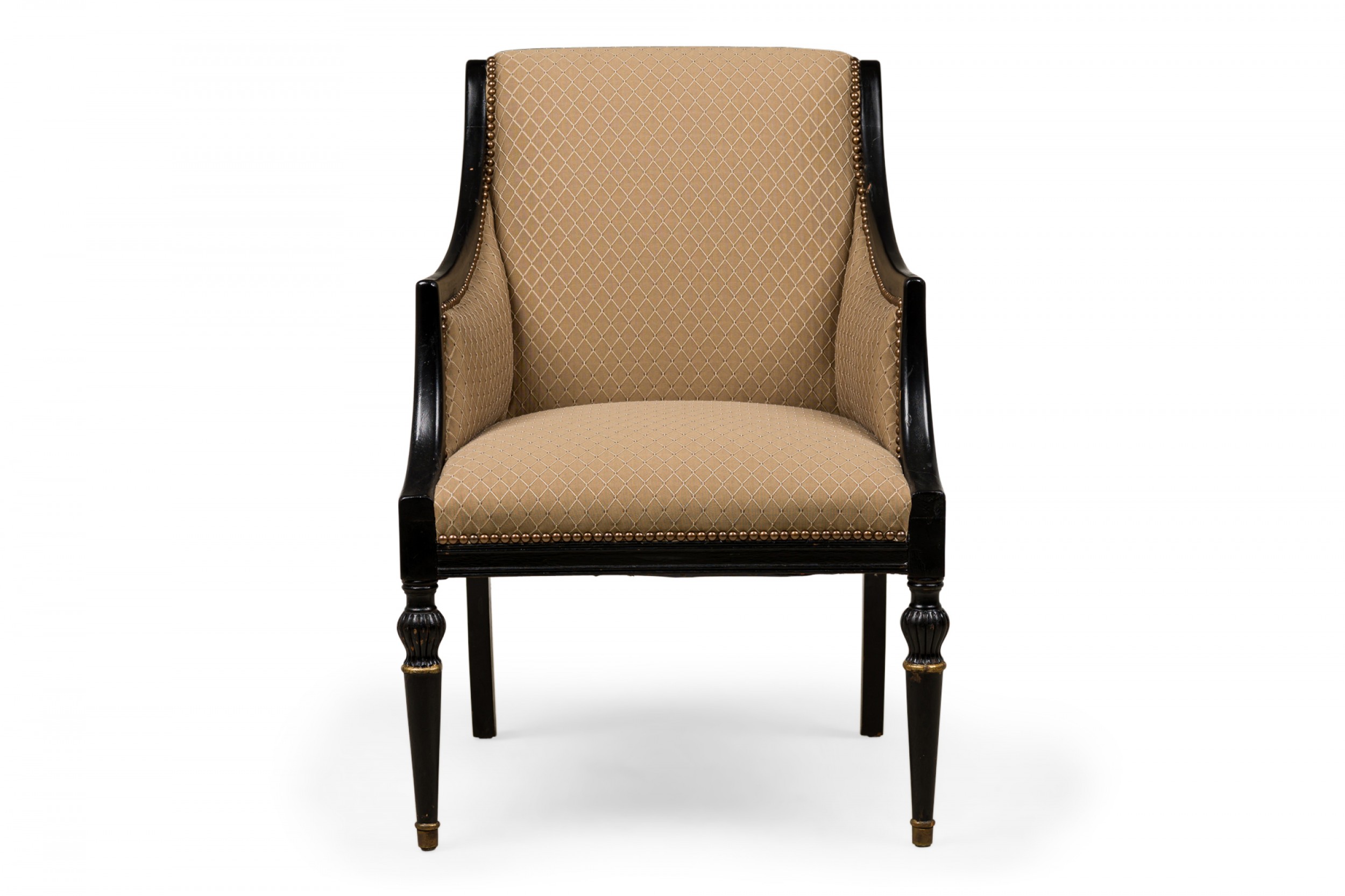 2 Mid-Century French ebonized wood frame bergere armchairs featuring gondola curved backs leading to downswept arms, upholstered with beige fabric with an embroidered lattice pattern, and nailhead trim, resting on turned front legs with gilt accents and back saber legs (PRICED EACH)