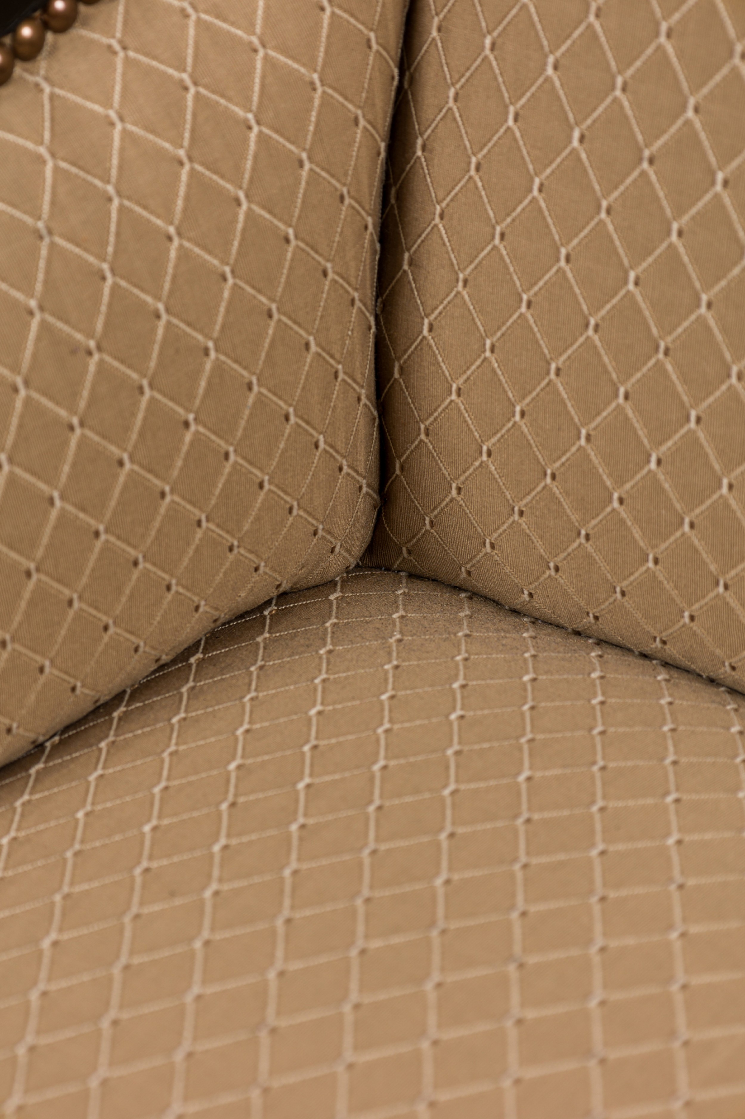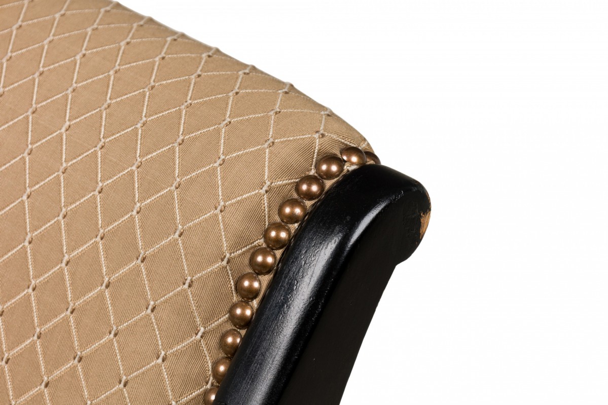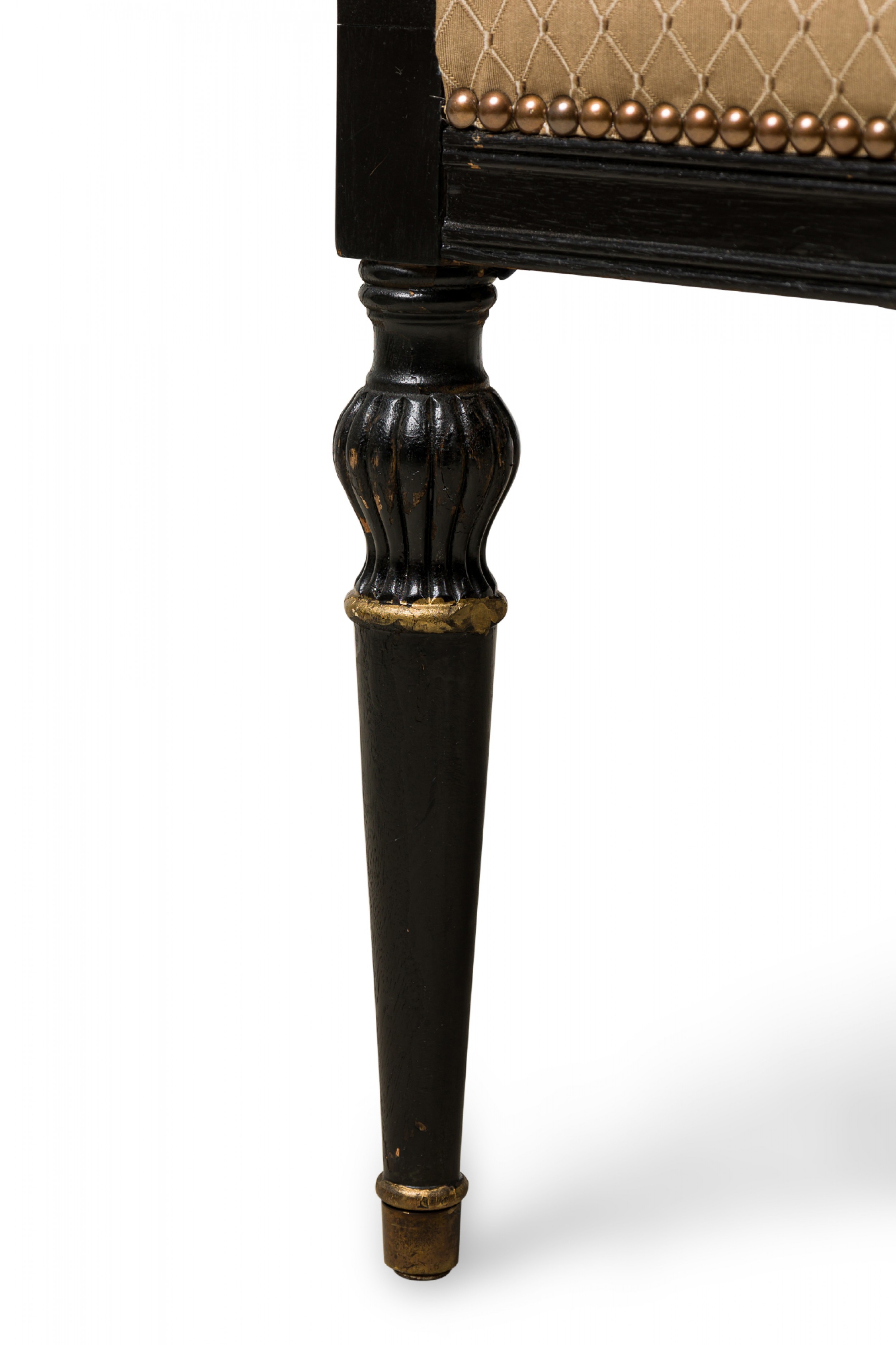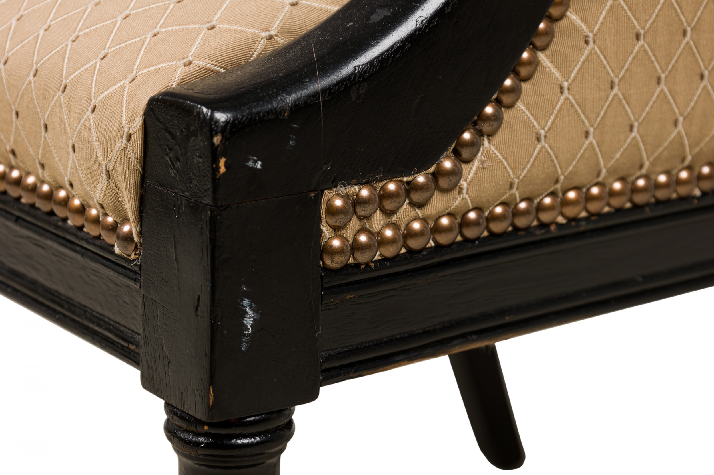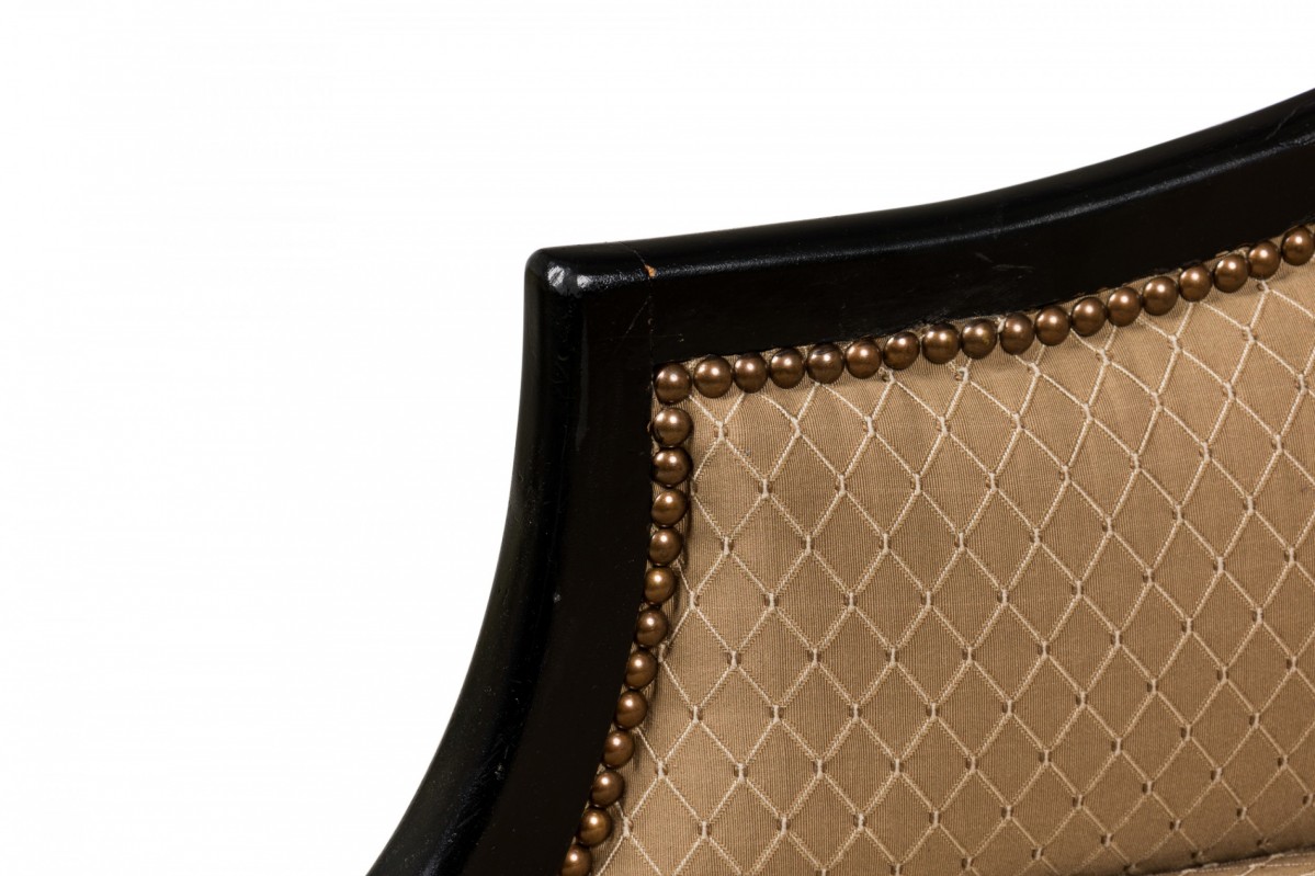 2 Mid-Century French ebonized wood frame bergere armchairs featuring gondola curved backs leading to downswept arms, upholstered with beige fabric with an embroidered lattice pattern, and nailhead trim, resting on turned front legs with gilt accents and back saber legs (PRICED EACH)
