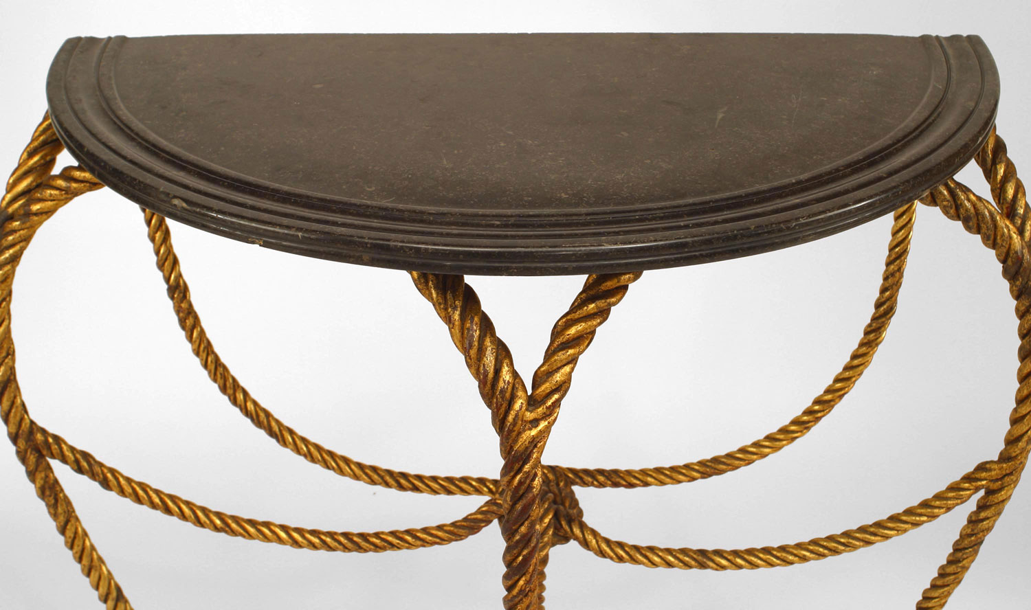 Hollywood Regency (20th Century) rope and tassel design gilt metal half round console table with marble top