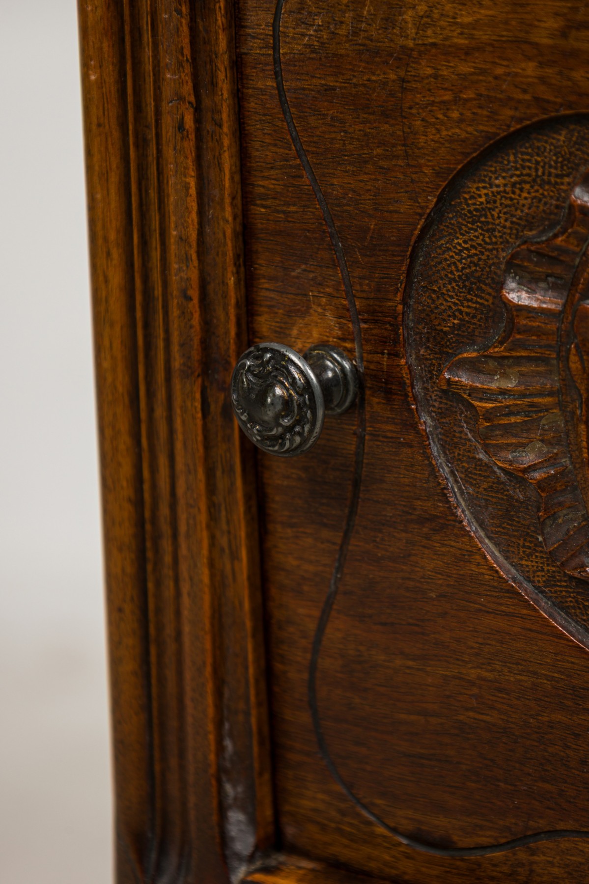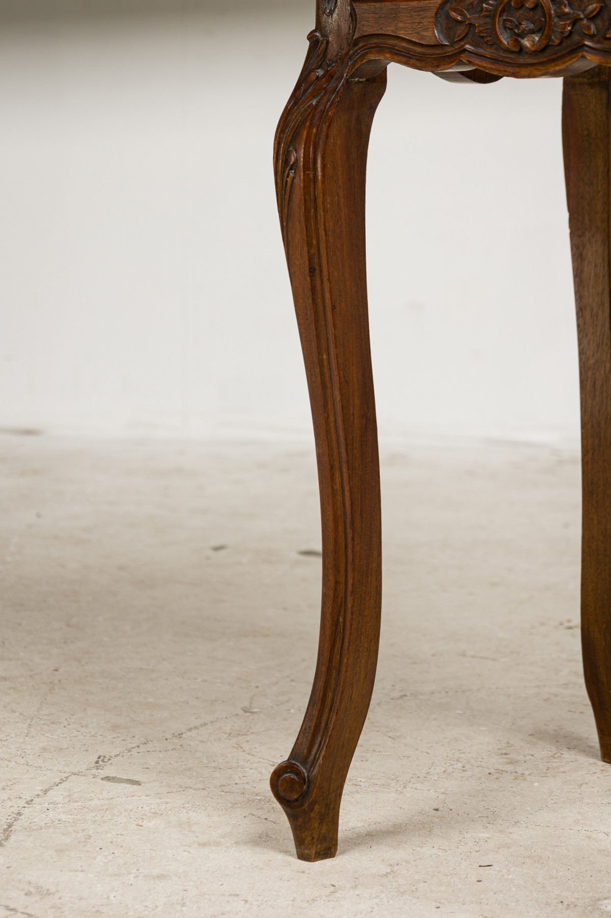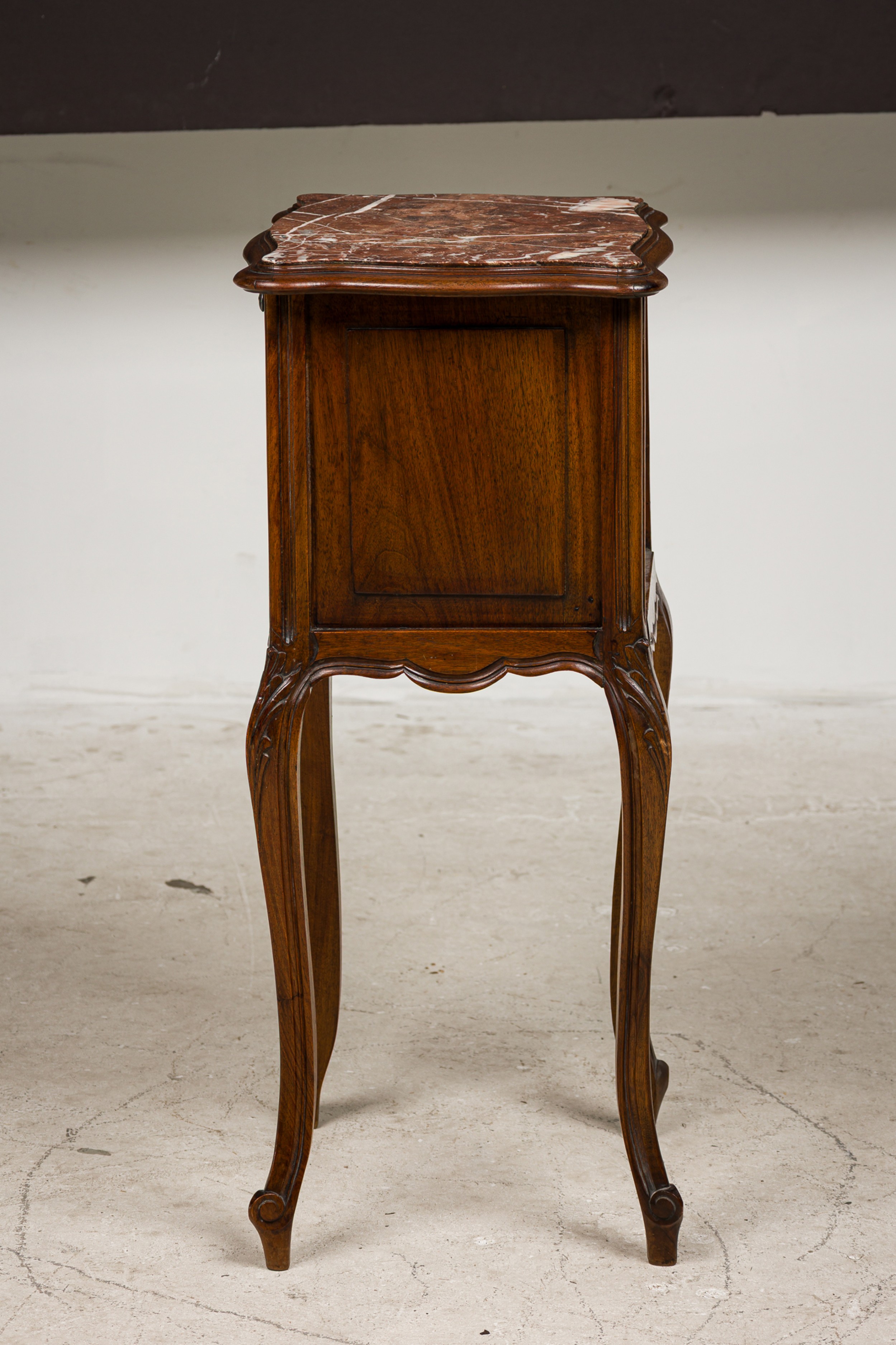 Louis XV style walnut bedside commode with a rouge shaped marble top over single drawer over a cabinet with a carved floral door front having a white porcelain insert,