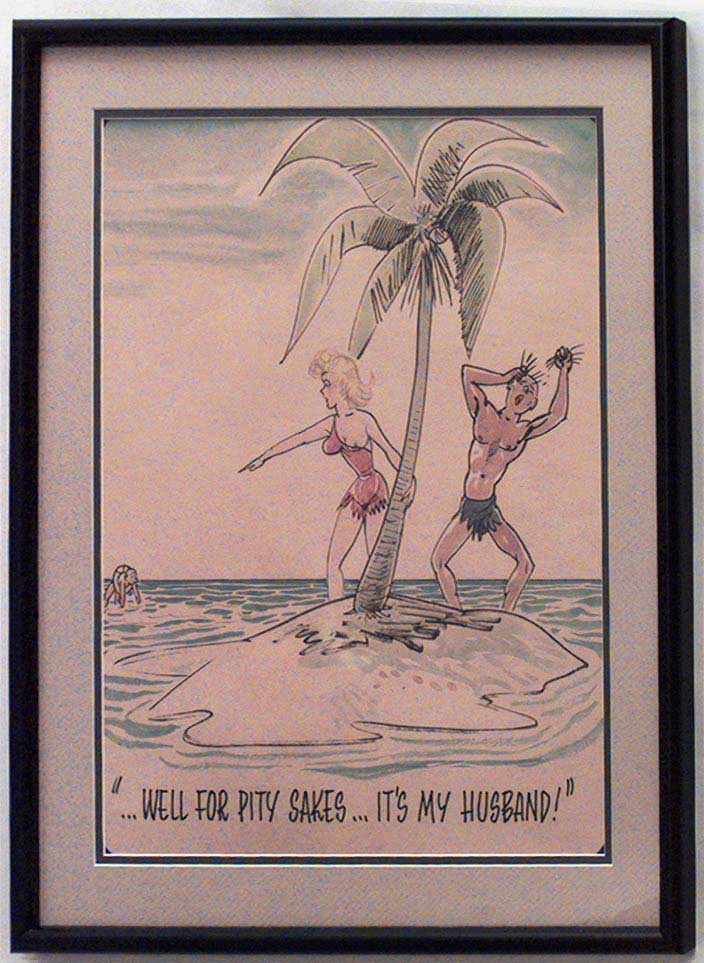 American Mid-Century (unsigned) black framed caricature watercolor of couple on deserted island ("Well for pitysakes - It's my husband!")