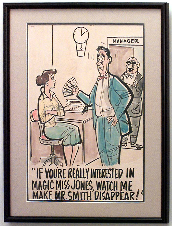 American Mid-Century (unsigned) black framed caricature watercolor of manager scolding secretary ("If you're interested in magic Miss Jones, watch me make Mr. Smith disappear")