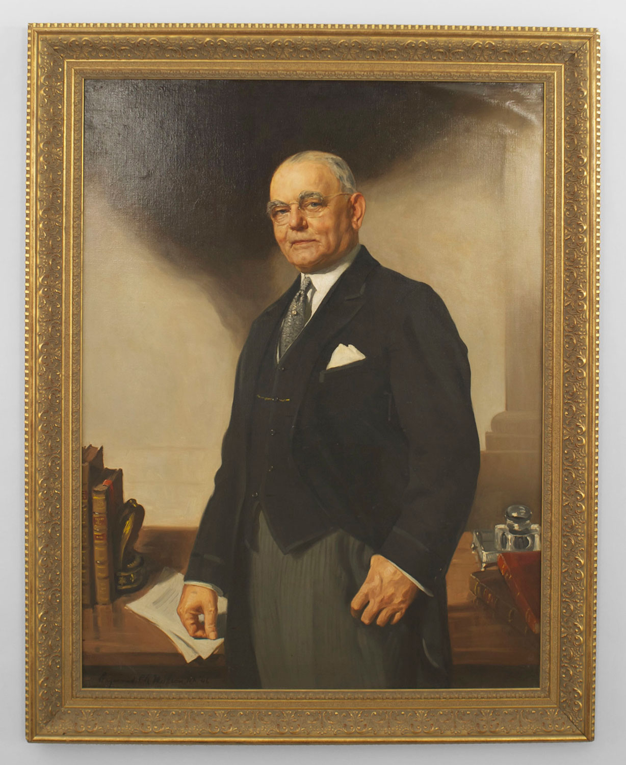 American oil portrait painting of Wilfred Kurth (Pres. of Home Ins.,1929 - 37) standing in front of desk with books and inkwell in a gold carved frame (20th Cent.)
