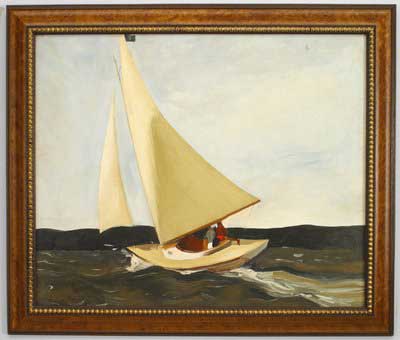 Copy of a seascape painting of a sail boat under full sail in ocean