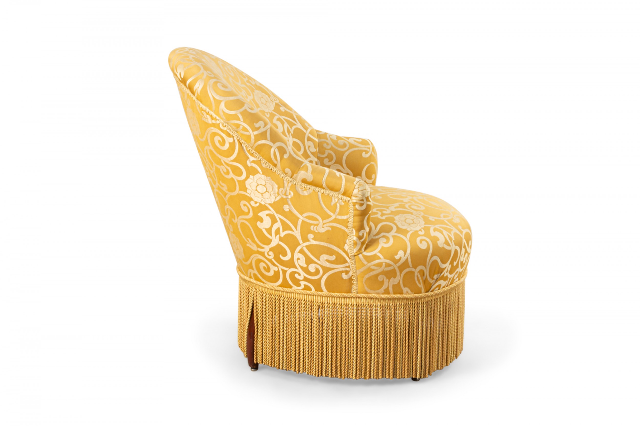 English Victorian Style boudoir tub form armchair with a round back and all upholstered in gold patterned damask with fringe along the bottom edge