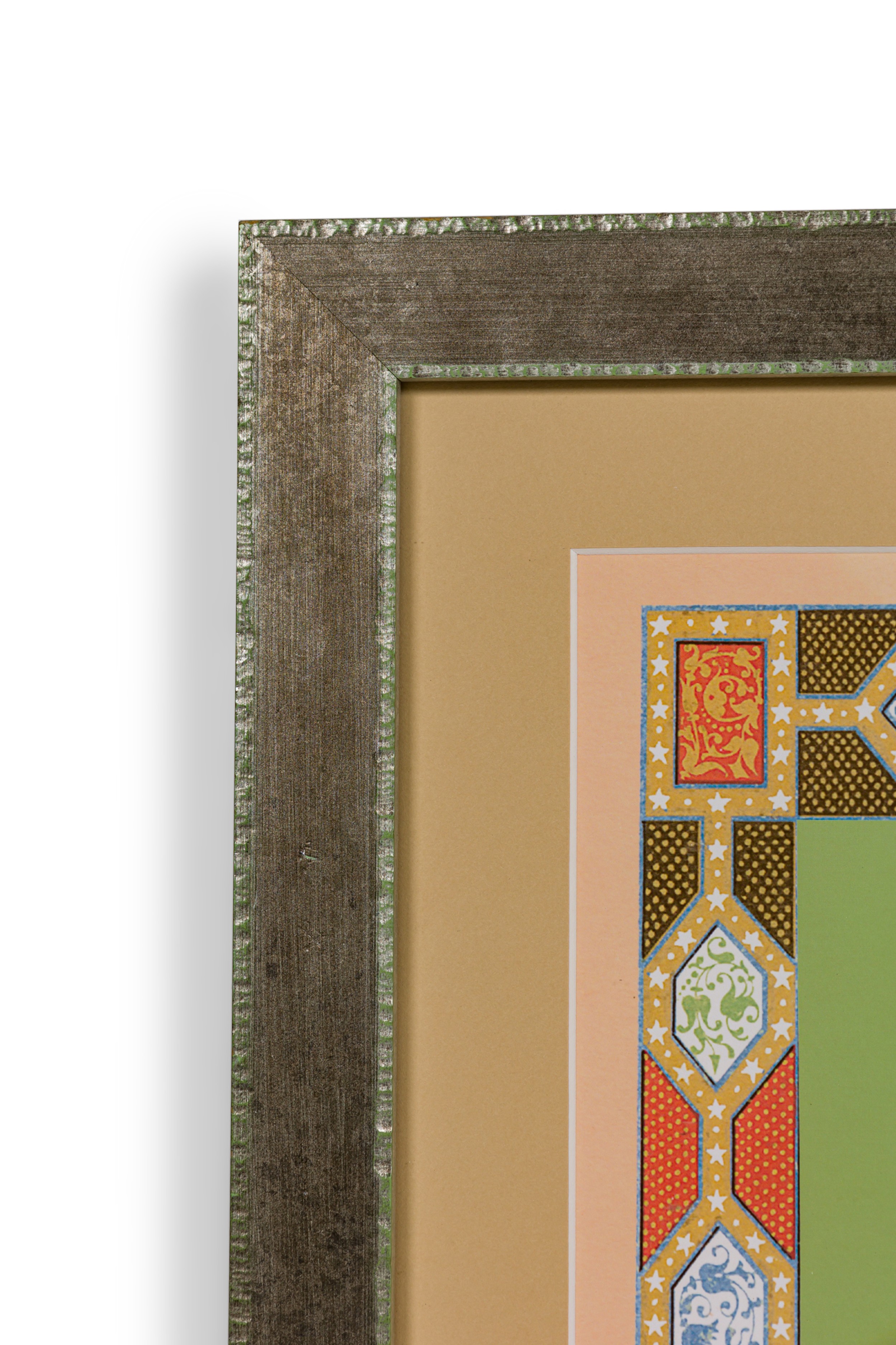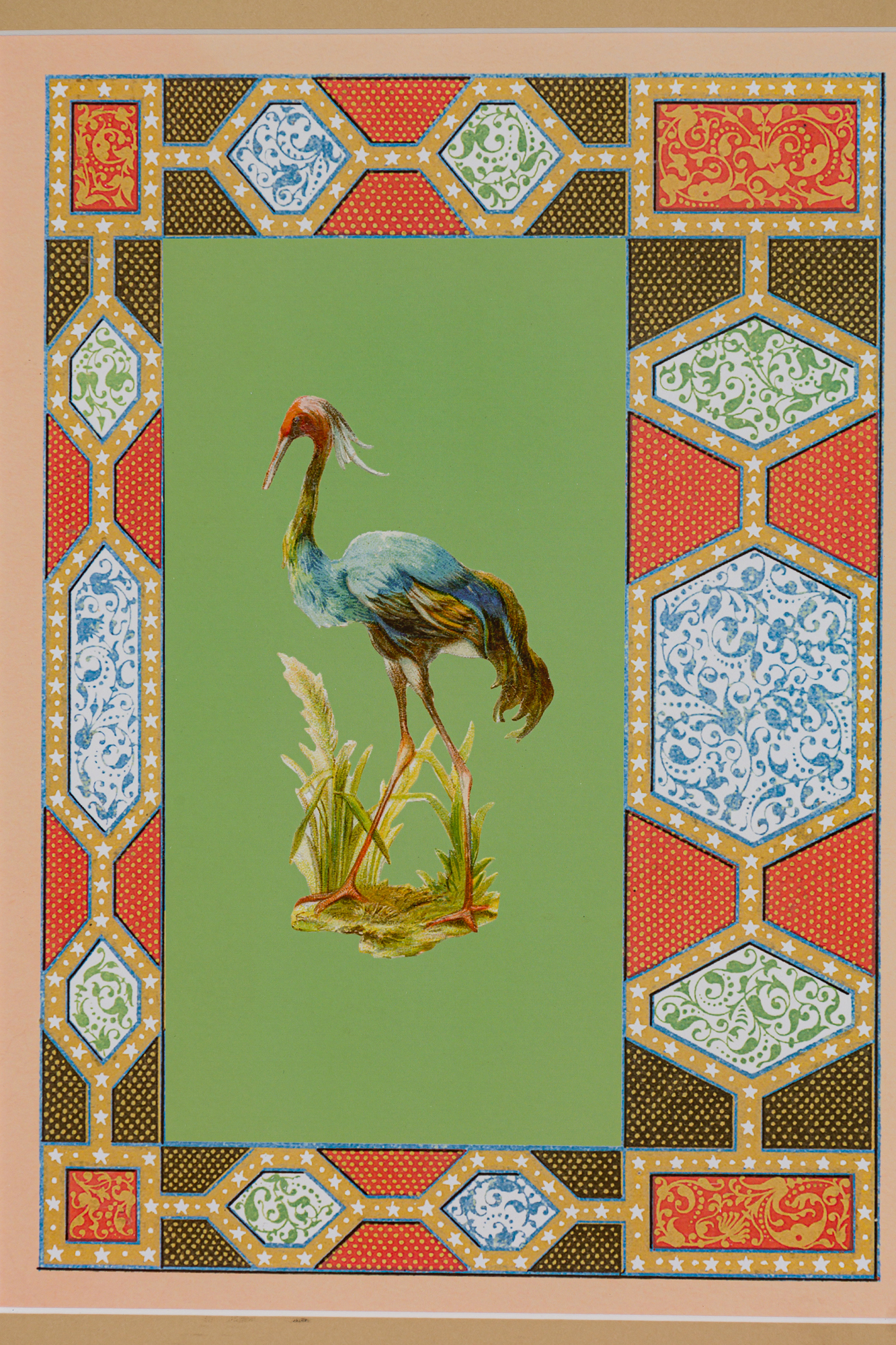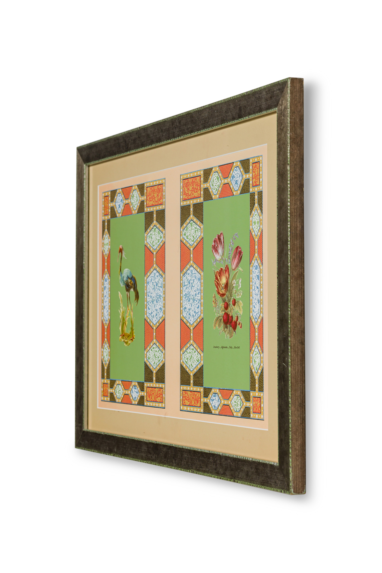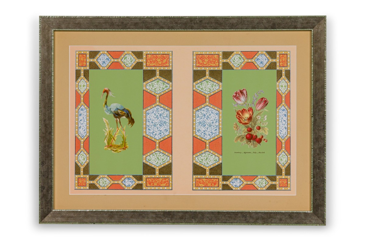 19th century print featuring a kingfisher bird and flower with an ornate border on a tan background, framed in a decorative grey frame. Companion piece: NWL8314.