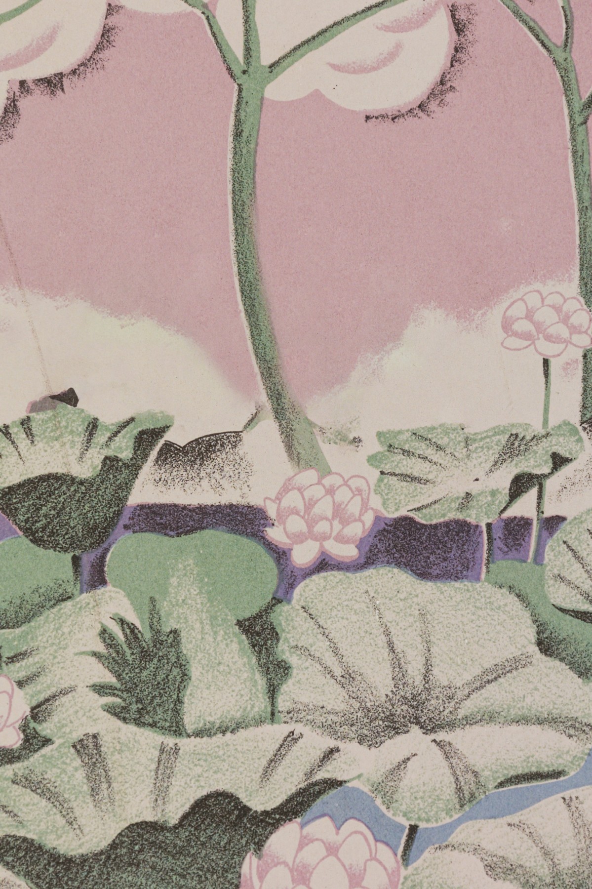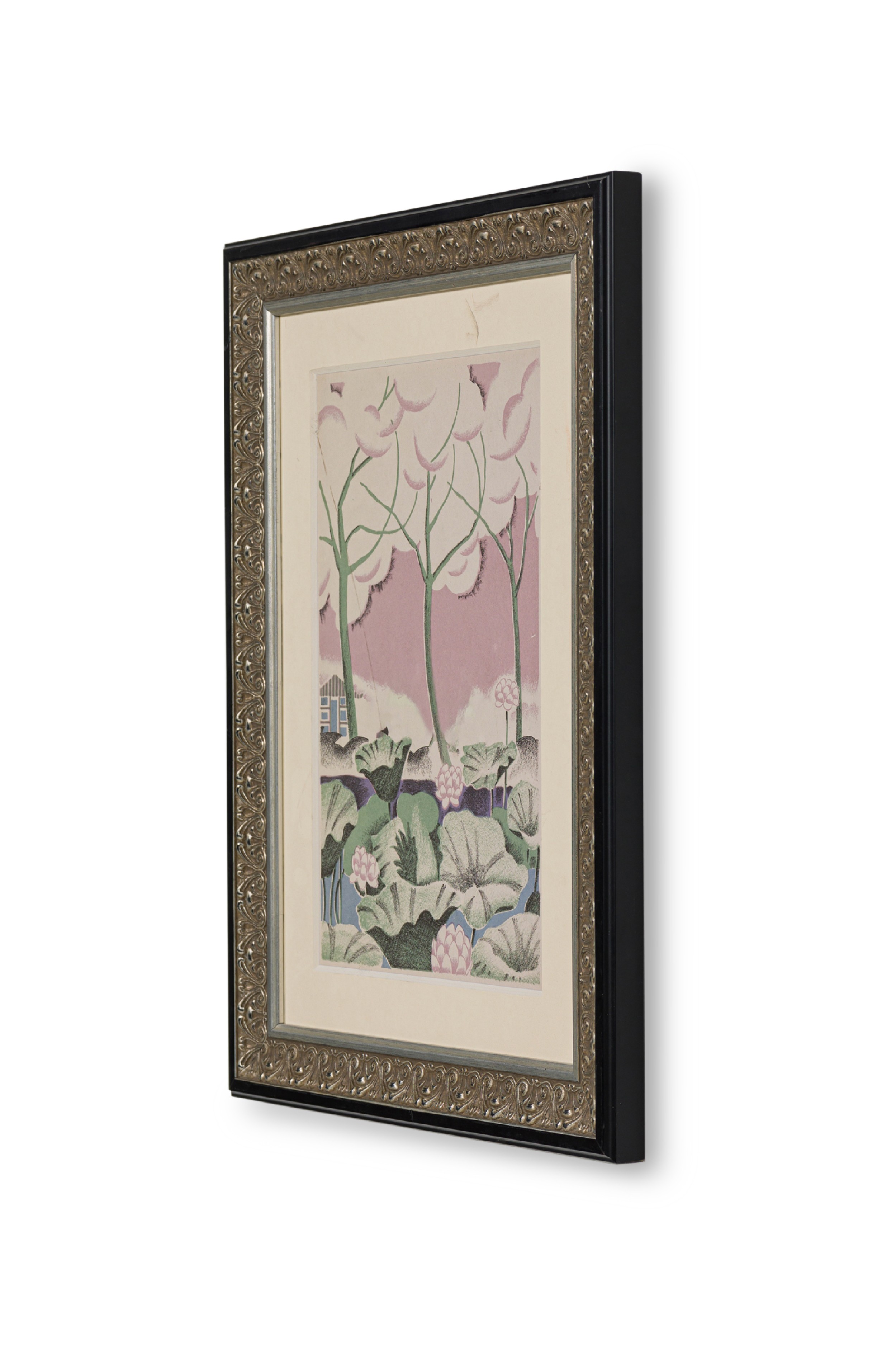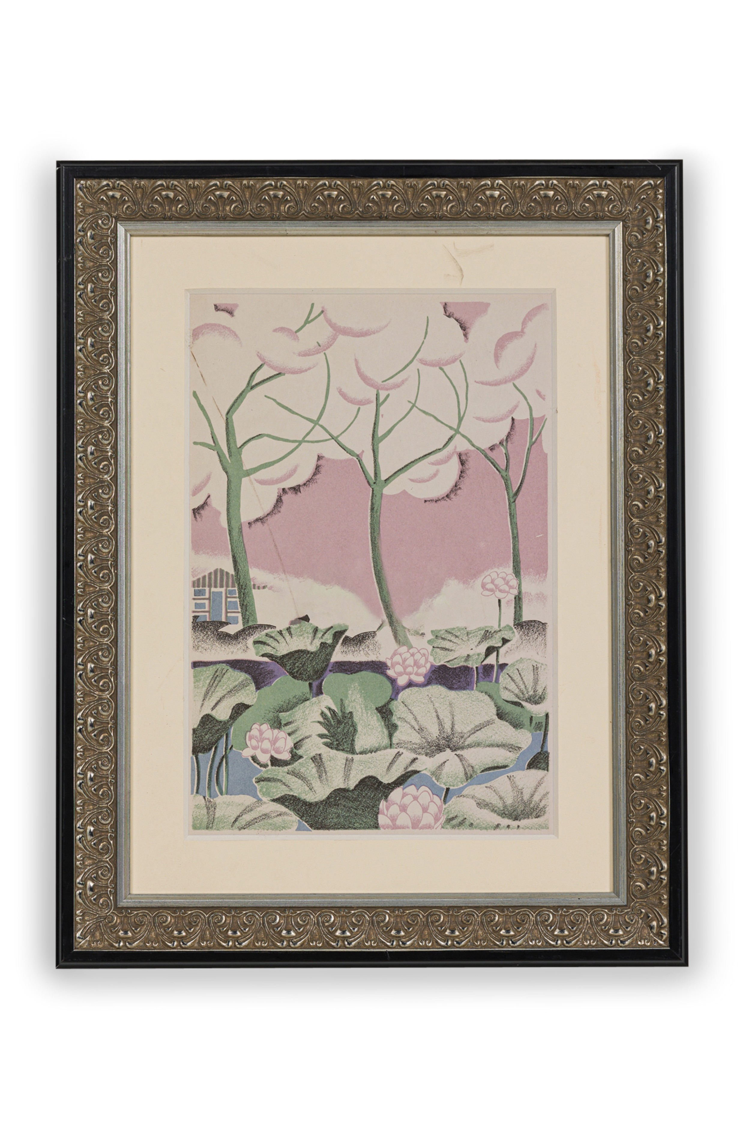 Reproduction of a 19th century lithograph print depicting water lilies and trees in pink and green tones, with cream matting and framed in a classic design.