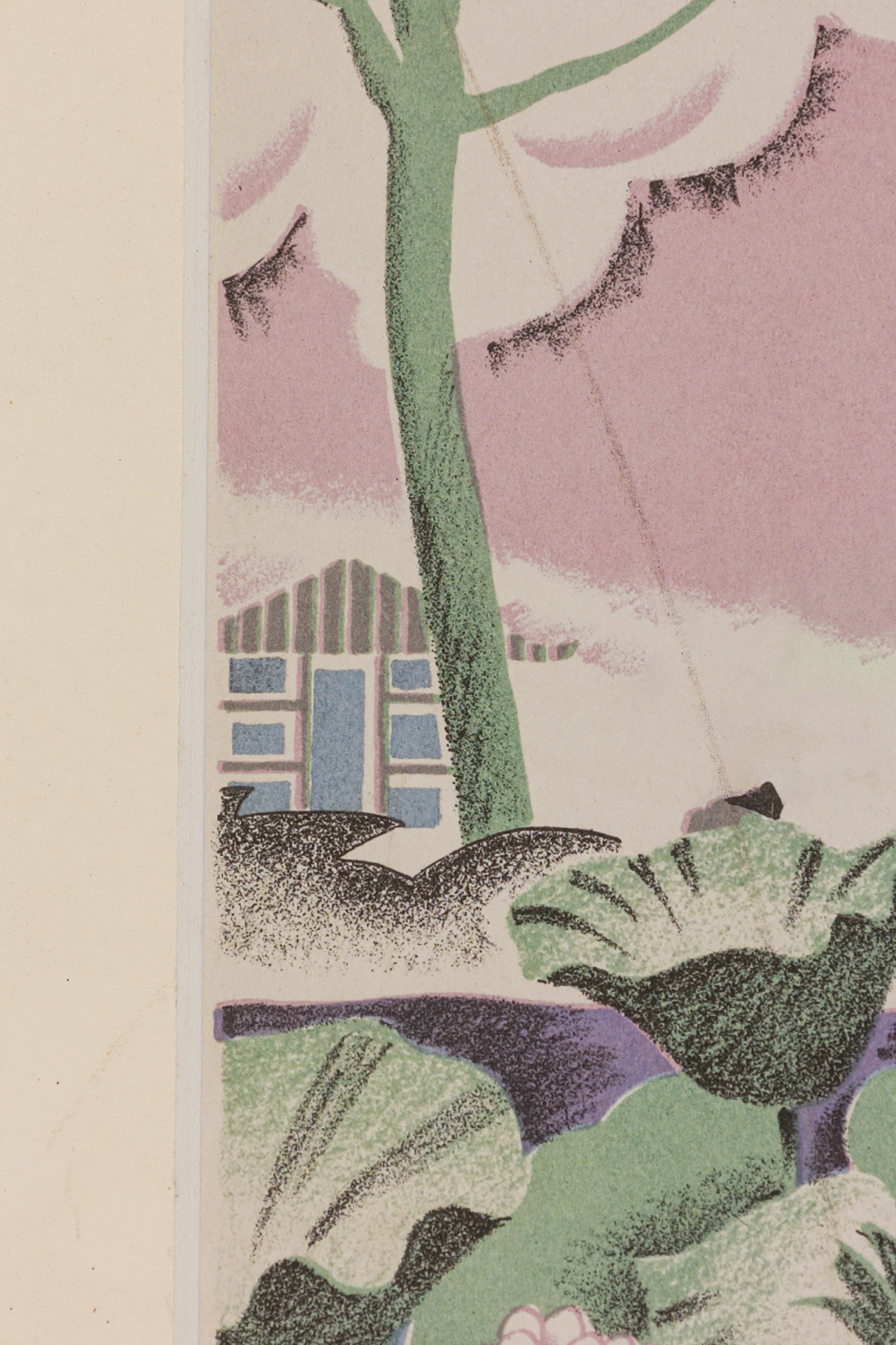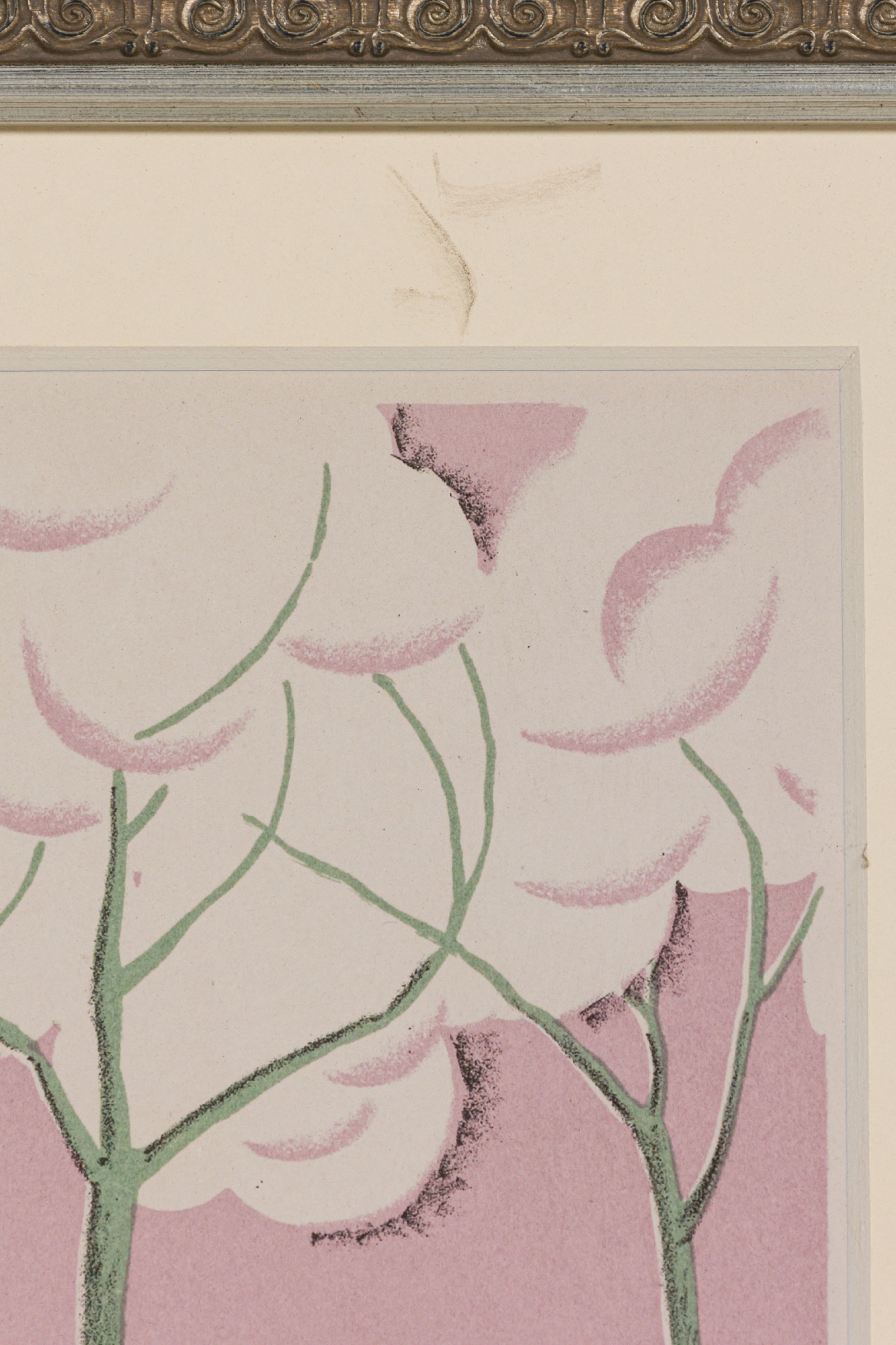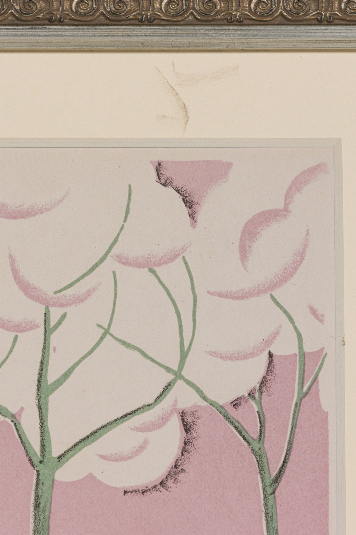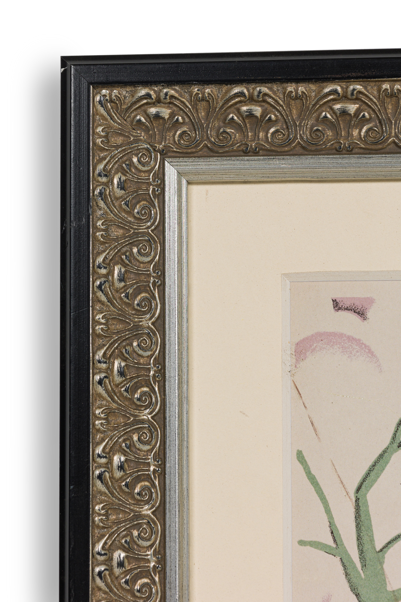 Reproduction of a 19th century lithograph print depicting water lilies and trees in pink and green tones, with cream matting and framed in a classic design.