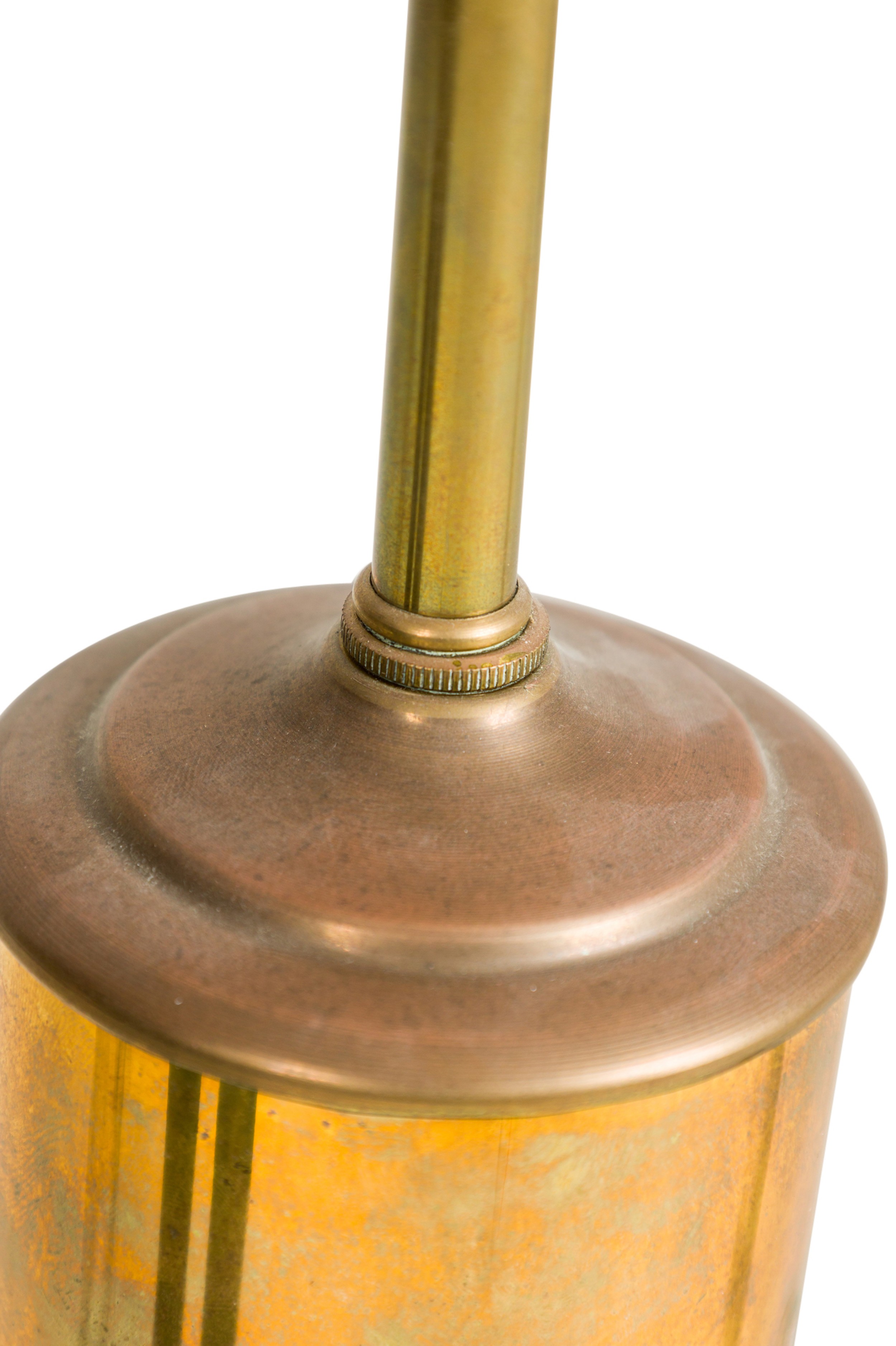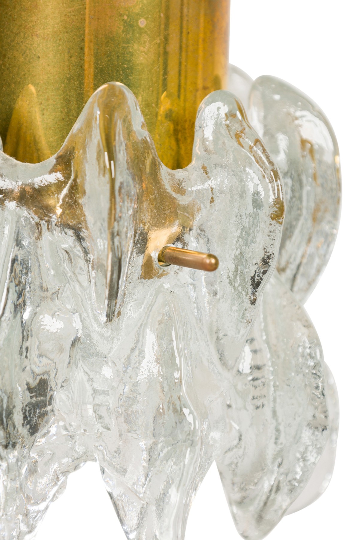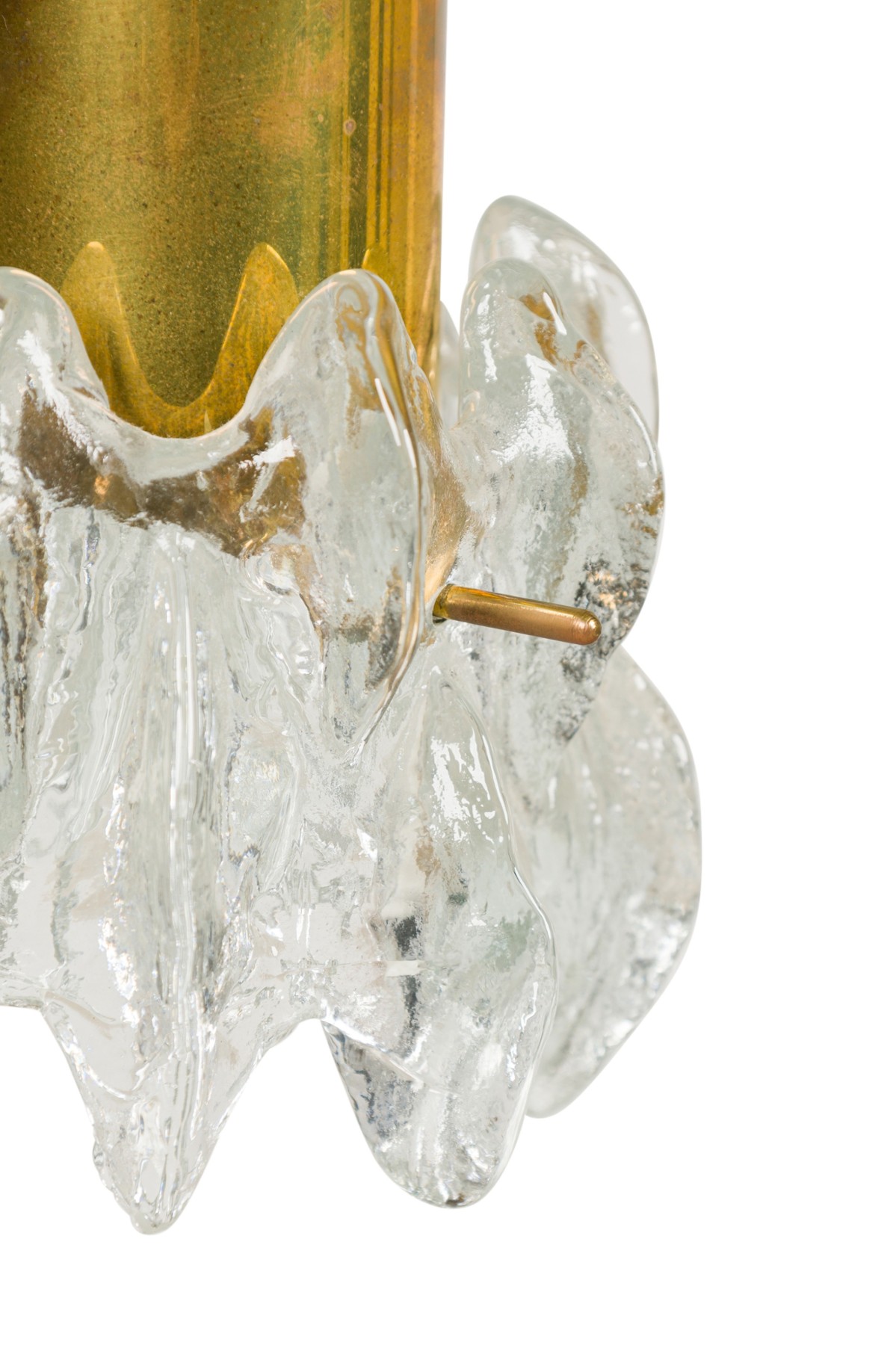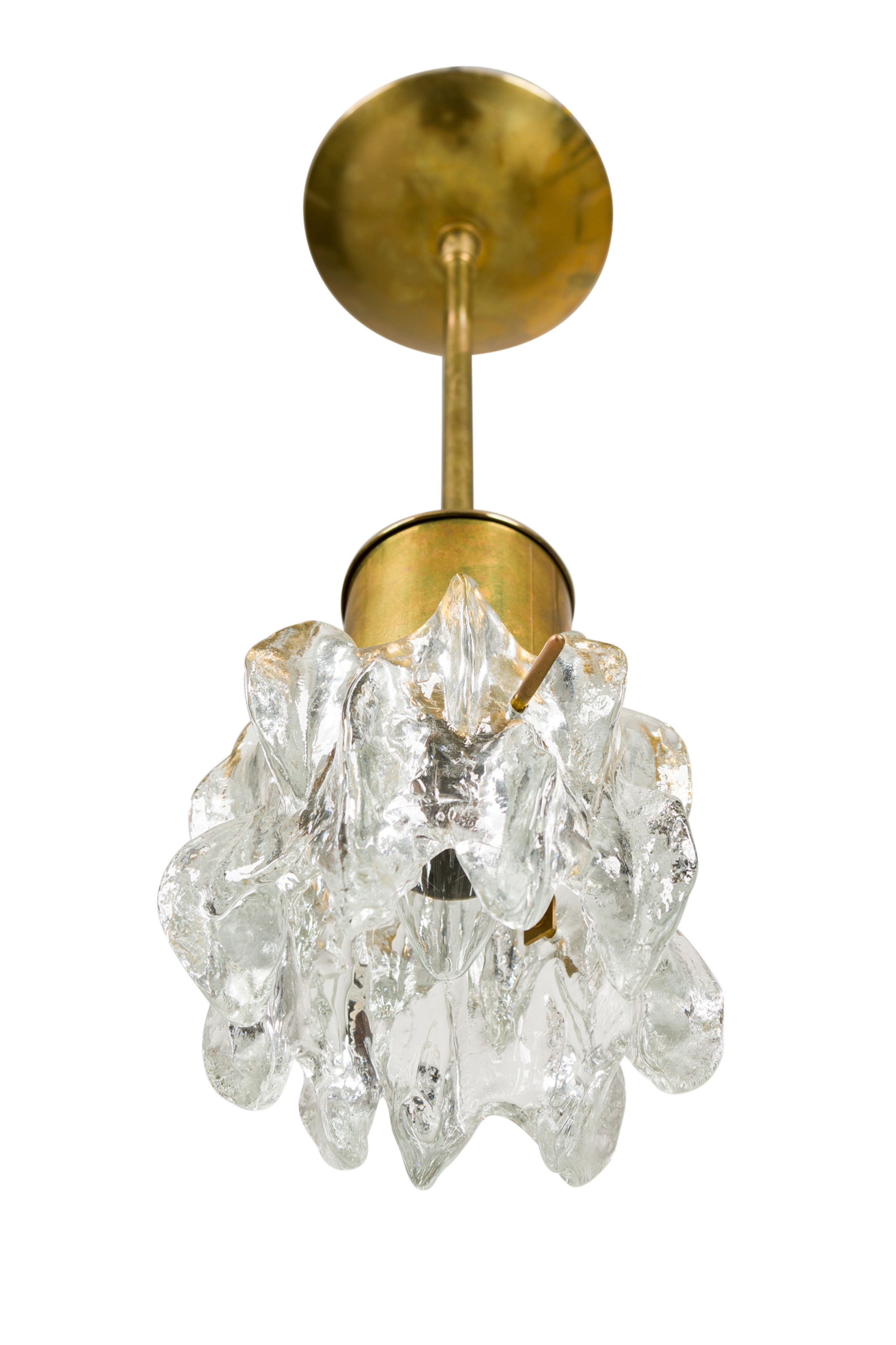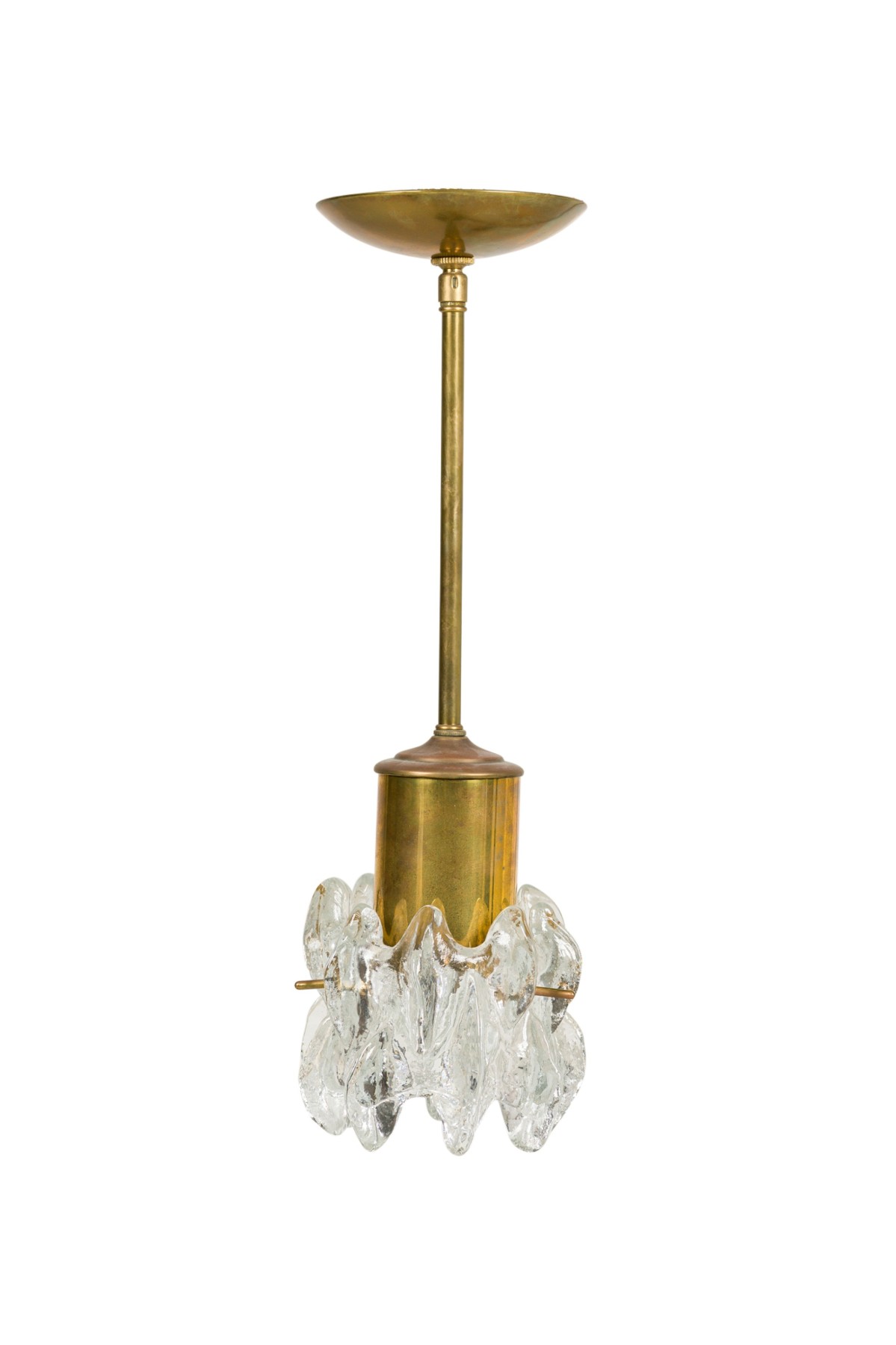 2 Mid-Century chandeliers with cylindrical brass body supporting a clear freeform glass bottom shade (PRICED EACH)