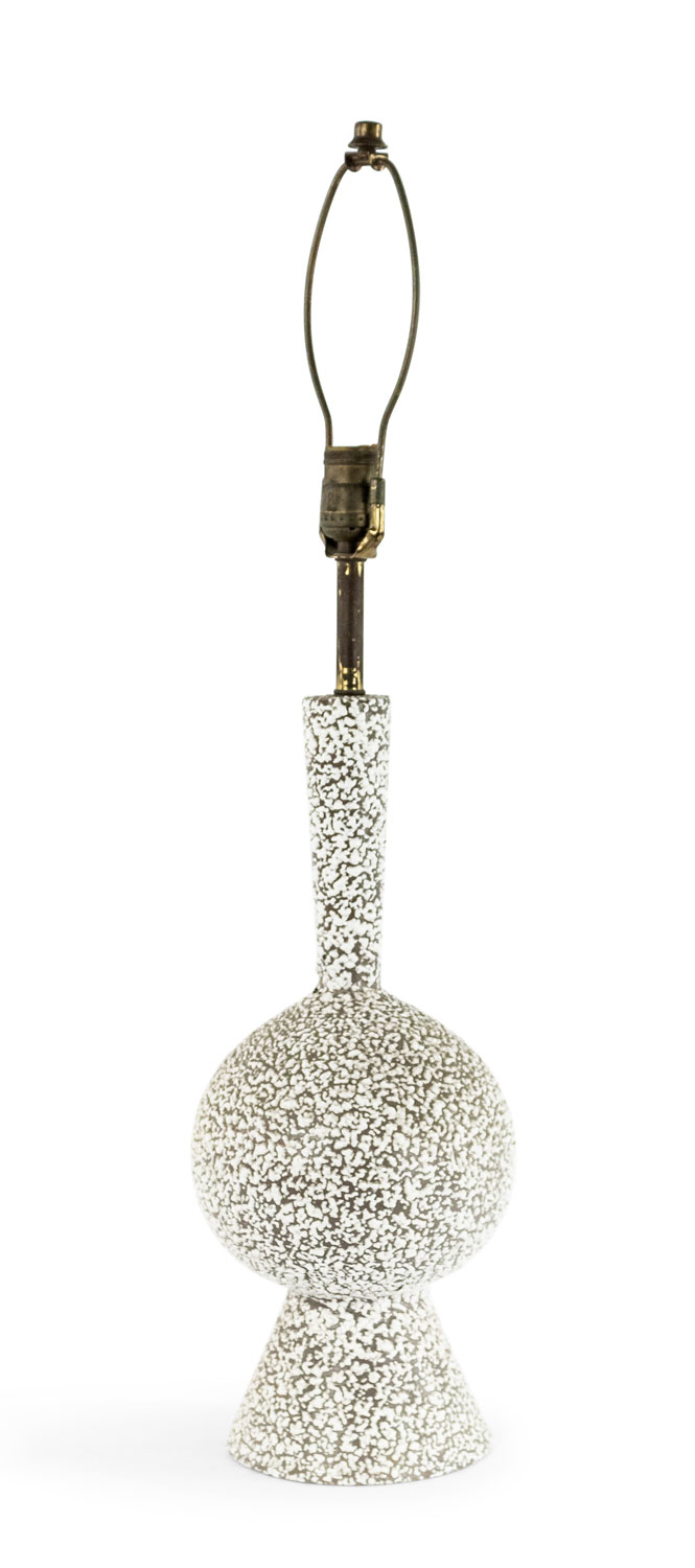 American Mid-Century white textured table lamp with a round ball center and a tapered narrow neck