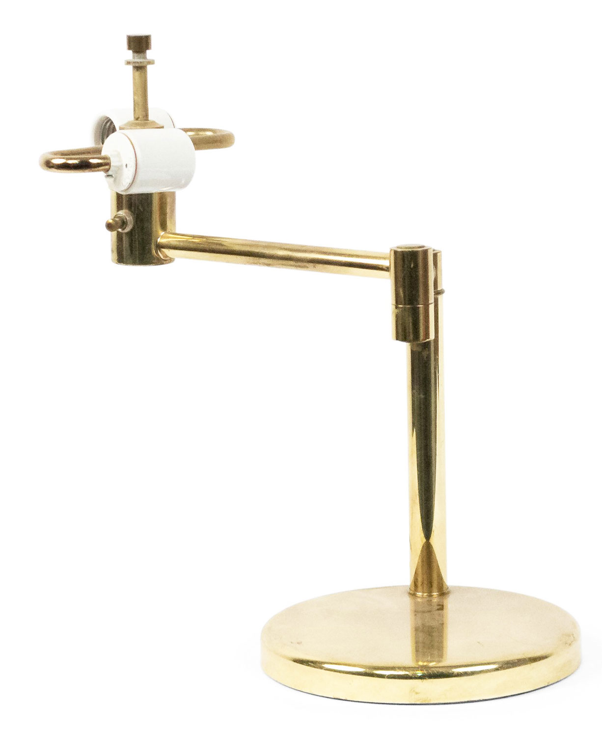 American Mid-Century brass swivel arm desk lamp with a round base.