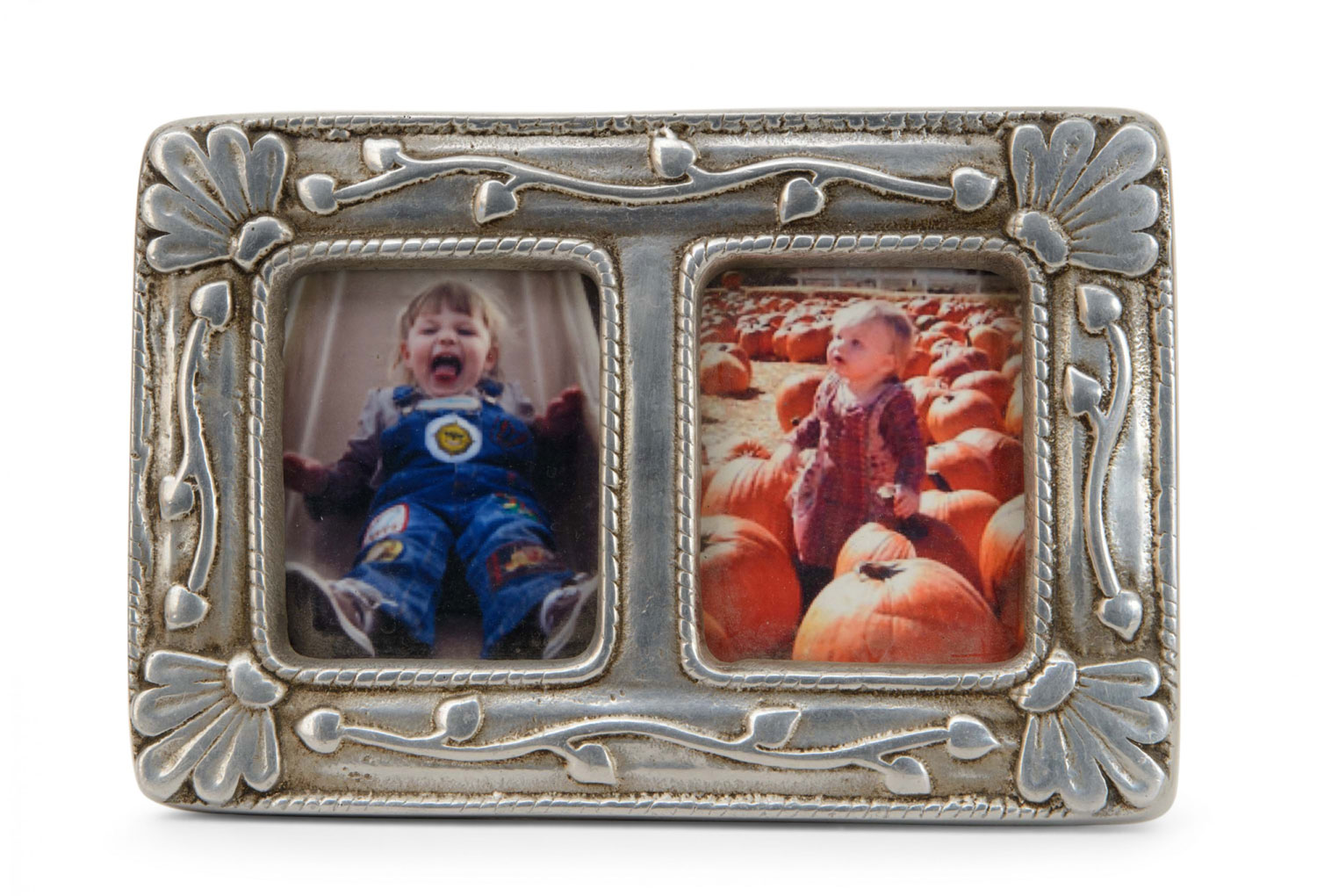 Contemporary rectangular embossed thick metal frame with 2 openings for pictures.