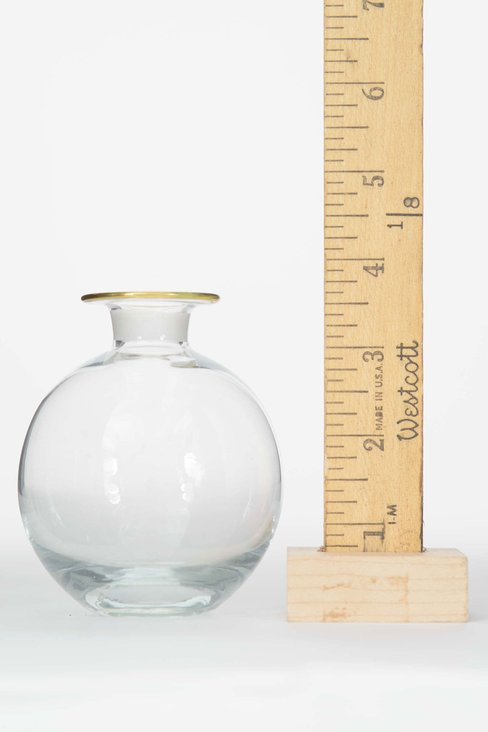 Bulbous-shaped glass bud vase with a gold rim
