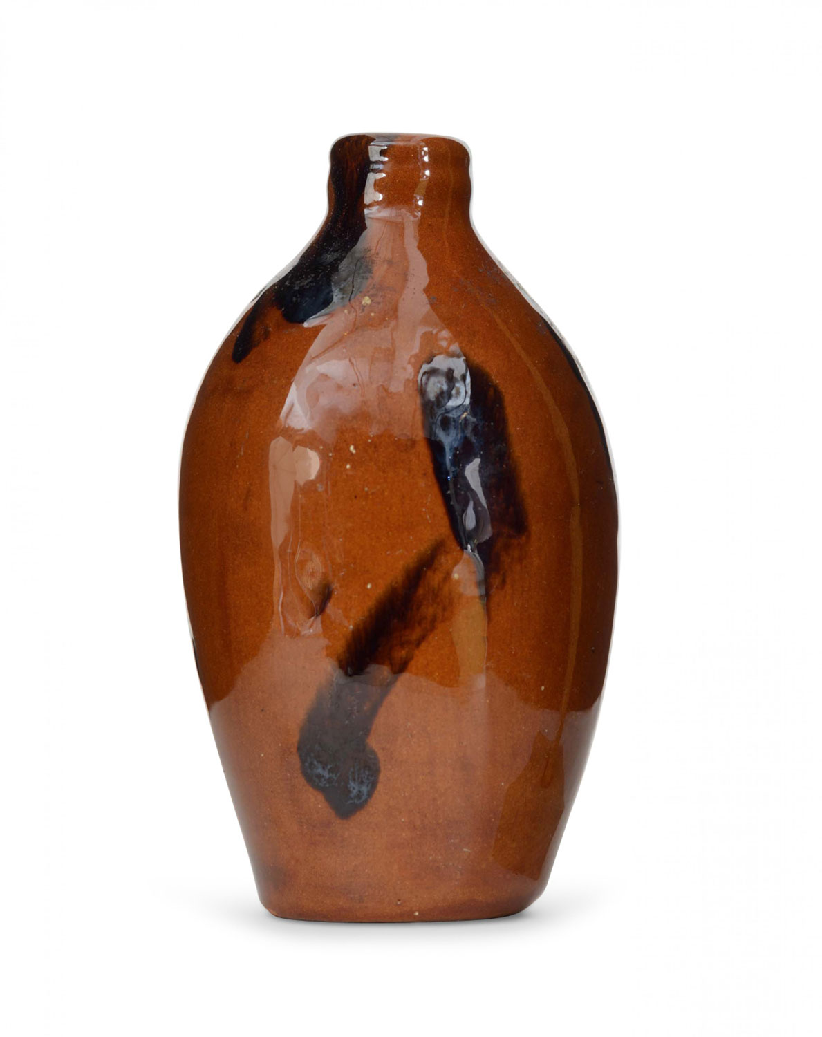 Oval, rust-colored glazed ceramic vase with a short neck and black streaks