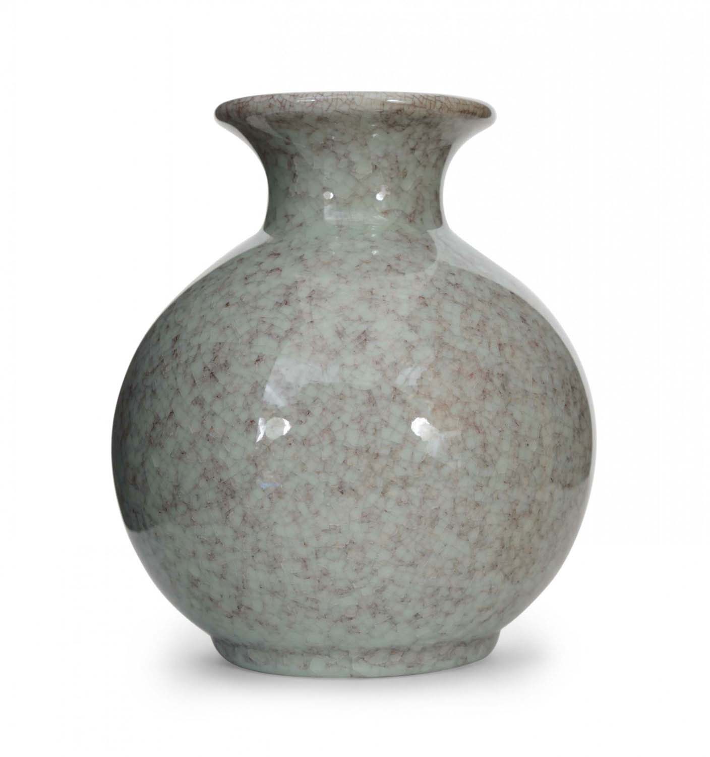 Globular mint-color glazed ceramic vase with a flared neck and a purple crackle finish