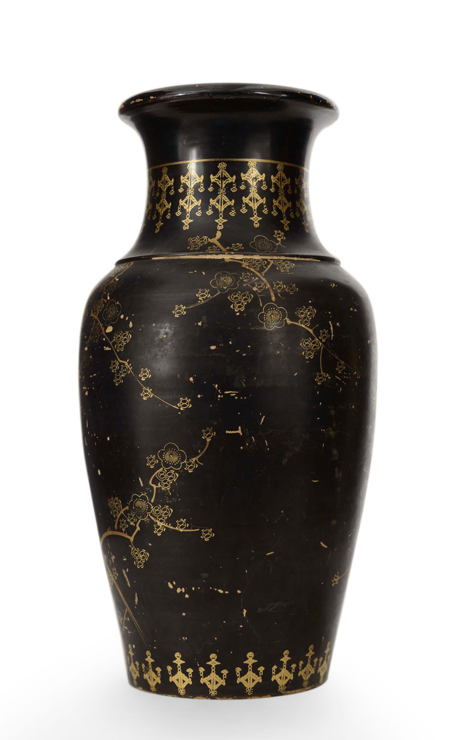 Asian Chinese style vintage urn-shaped black glazed ceramic vase with a gilded cherry blossom design