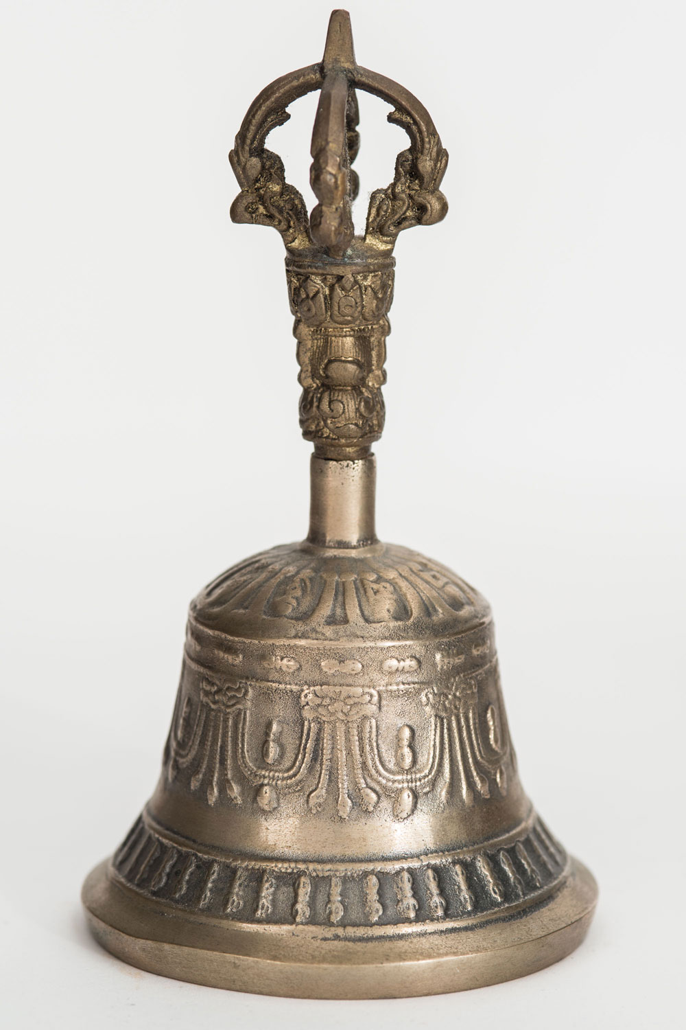Vintage Tibetan Buddhist embossed brass prayer bell with ornate handle featuring the face of Buddhist goddess Prajnaparamita