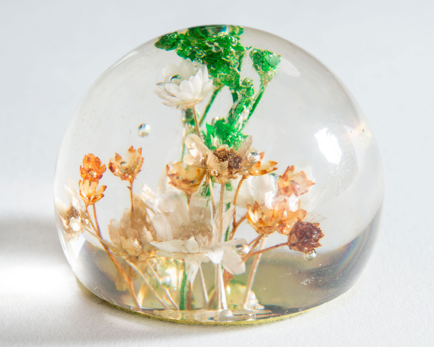 Dome-shaped clear acrylic paperweight with flowers inside