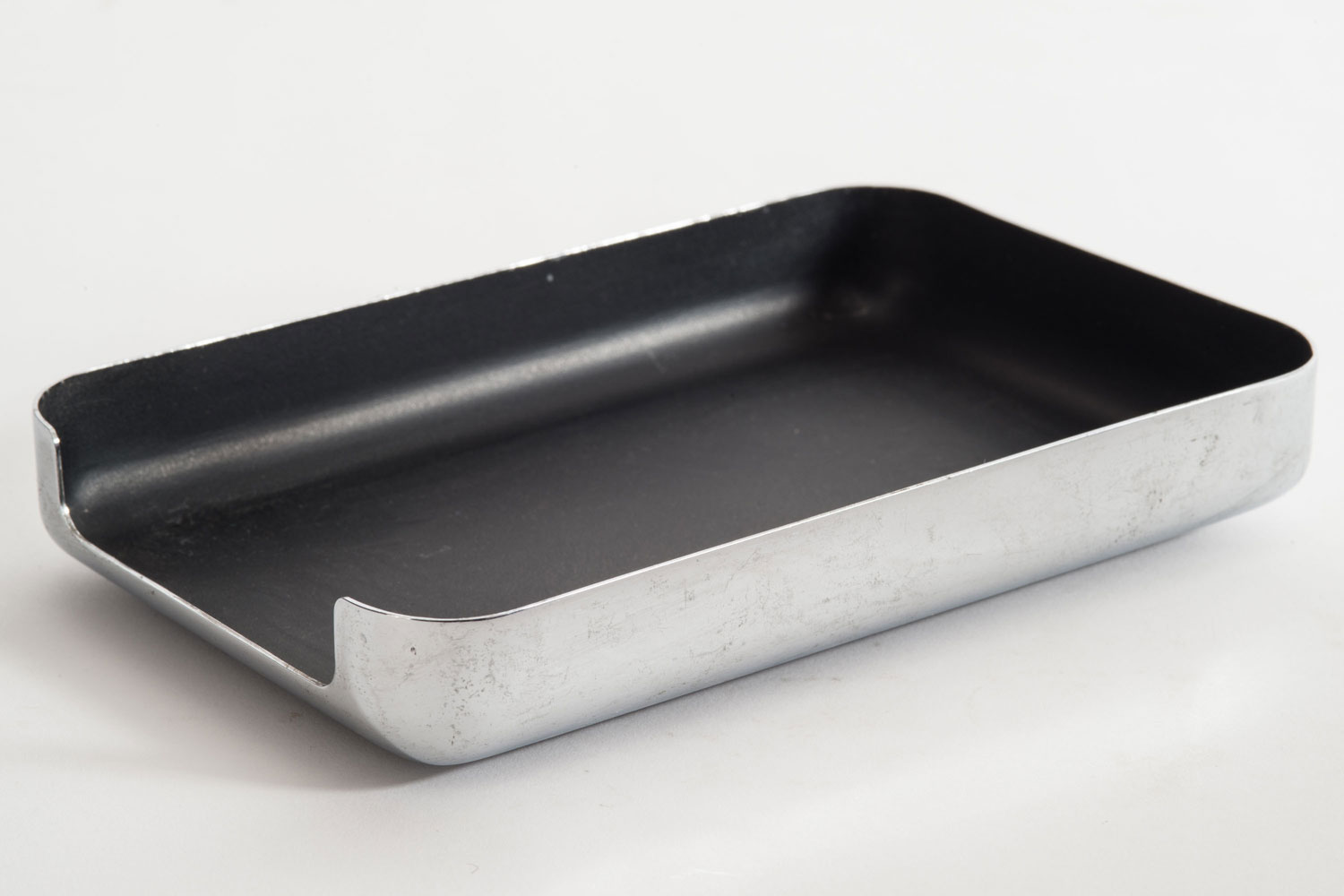 Contemporary rectangular chrome stationery holder with black interior and rounded corners