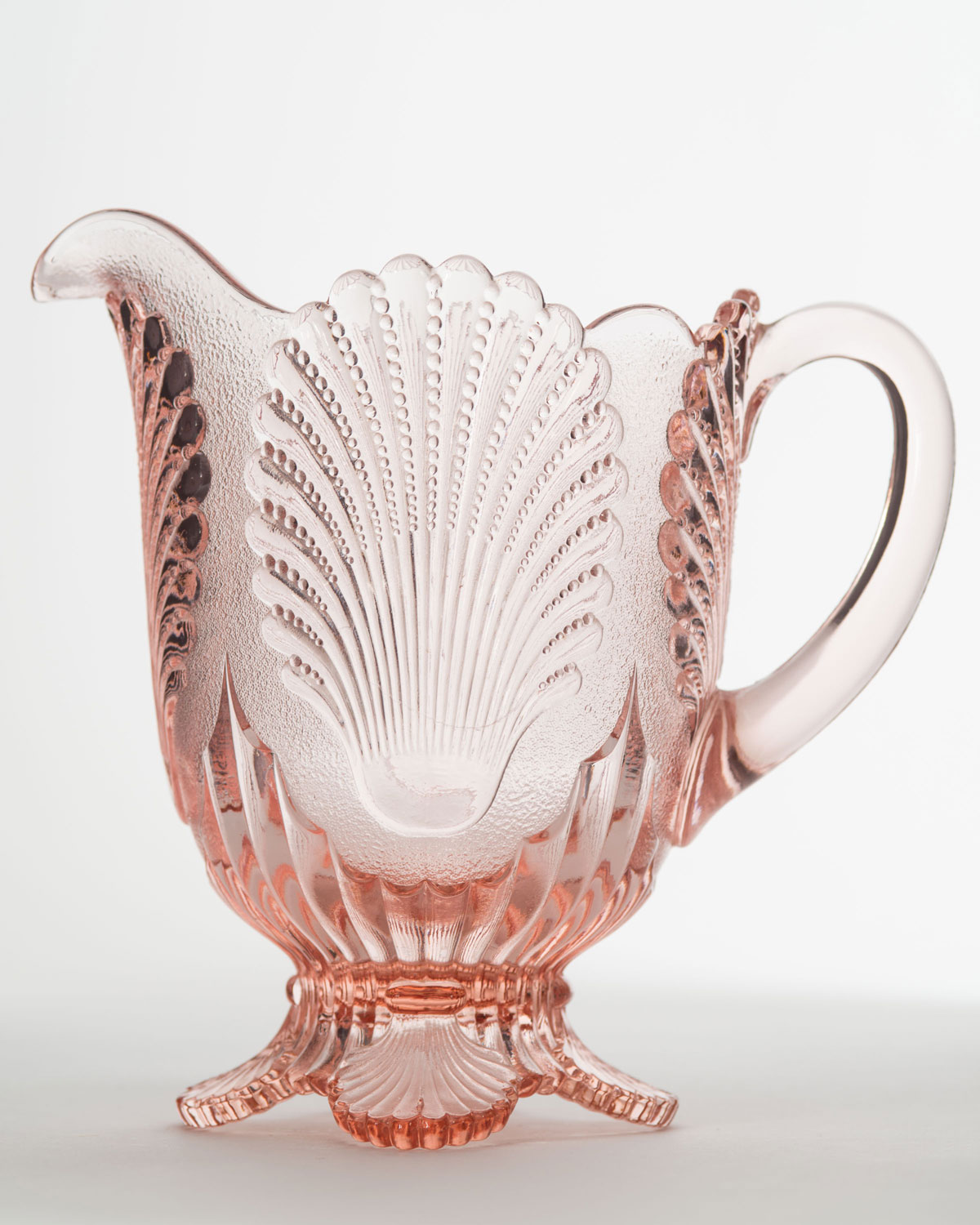Vintage footed clear glass pitcher with a raised and textured design around the body
