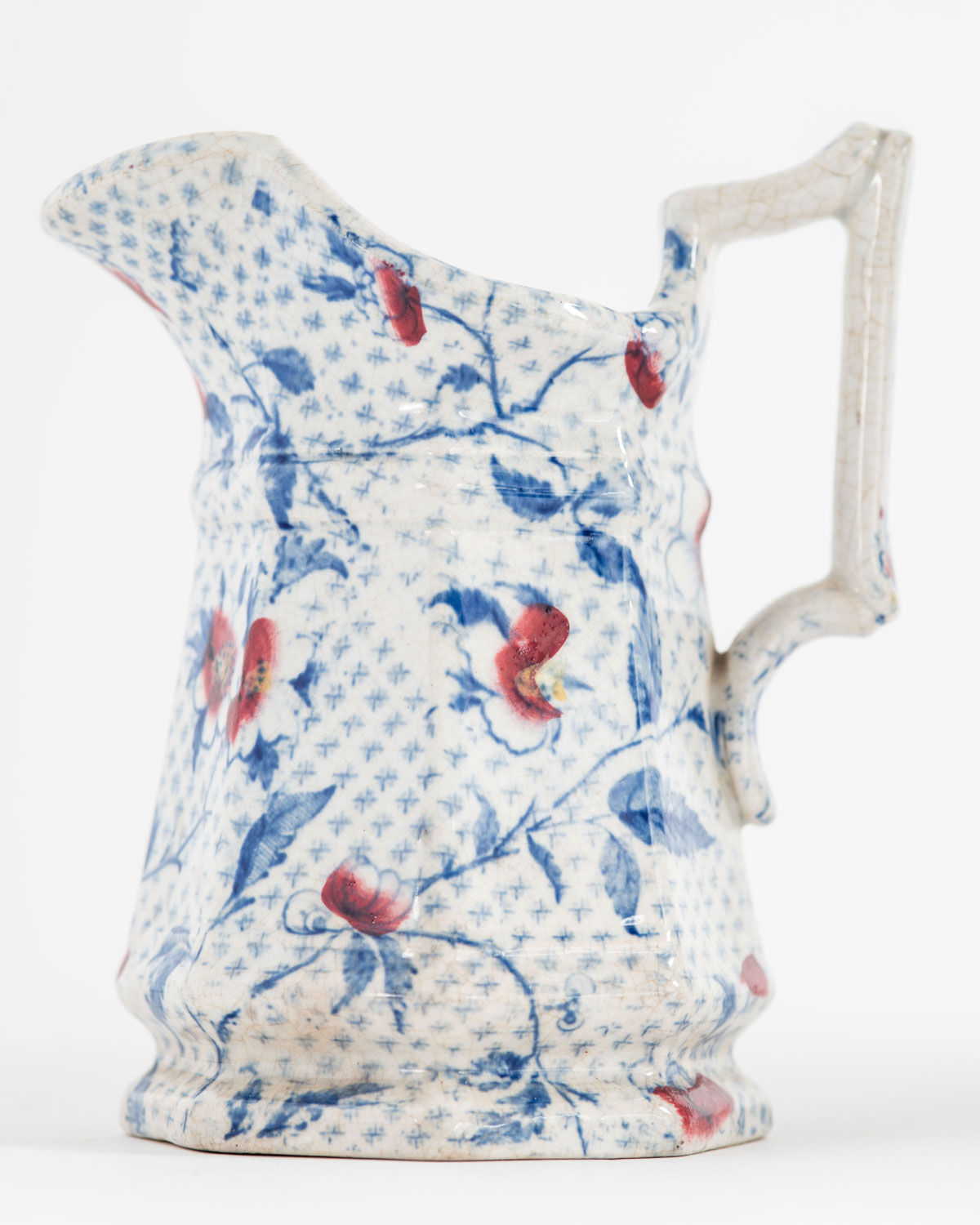 Vintage white glazed ceramic pitcher with blue and red floral design