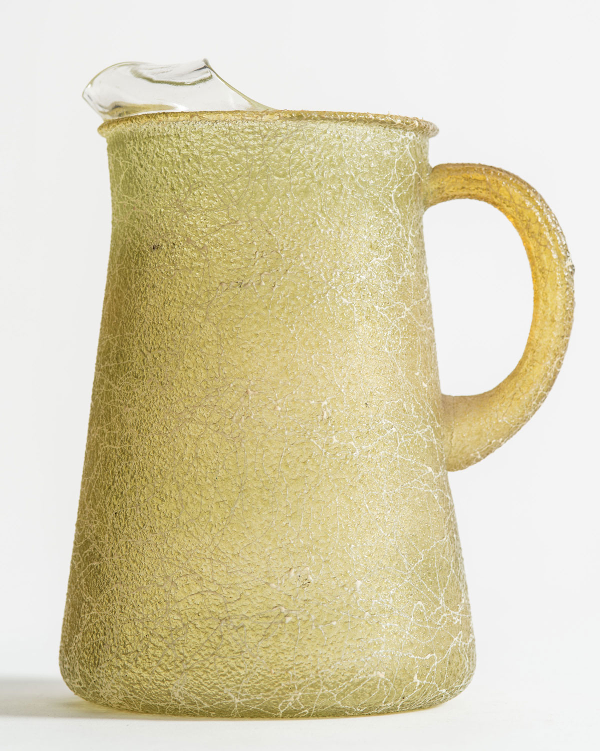 Vintage tapered green tinted textured glass pitcher with a white spaghetti string design