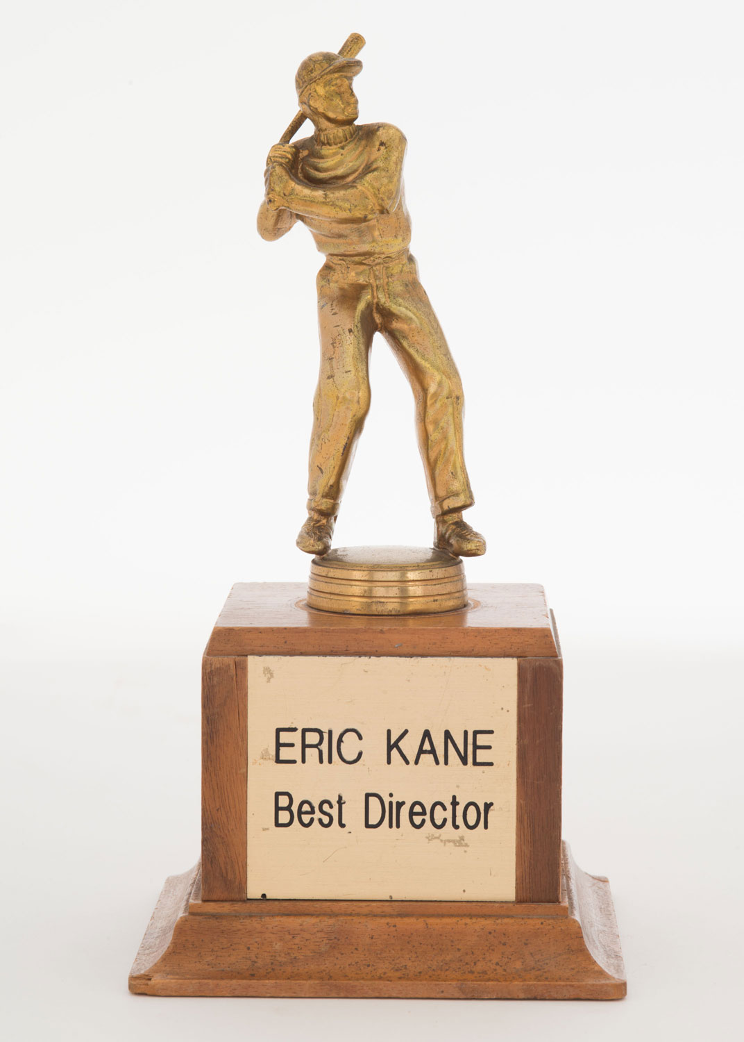 Gilded metal baseball trophy on a square wood base with a "ERIC KANE, BEST DIRECTOR" plaque
