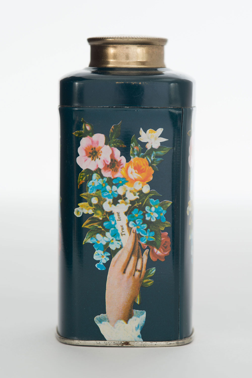Square dark green metal talcum powder container with a multicolored design of a woman's hand holding a bouquet of flowers and a brass cap (PENHALIGON'S)