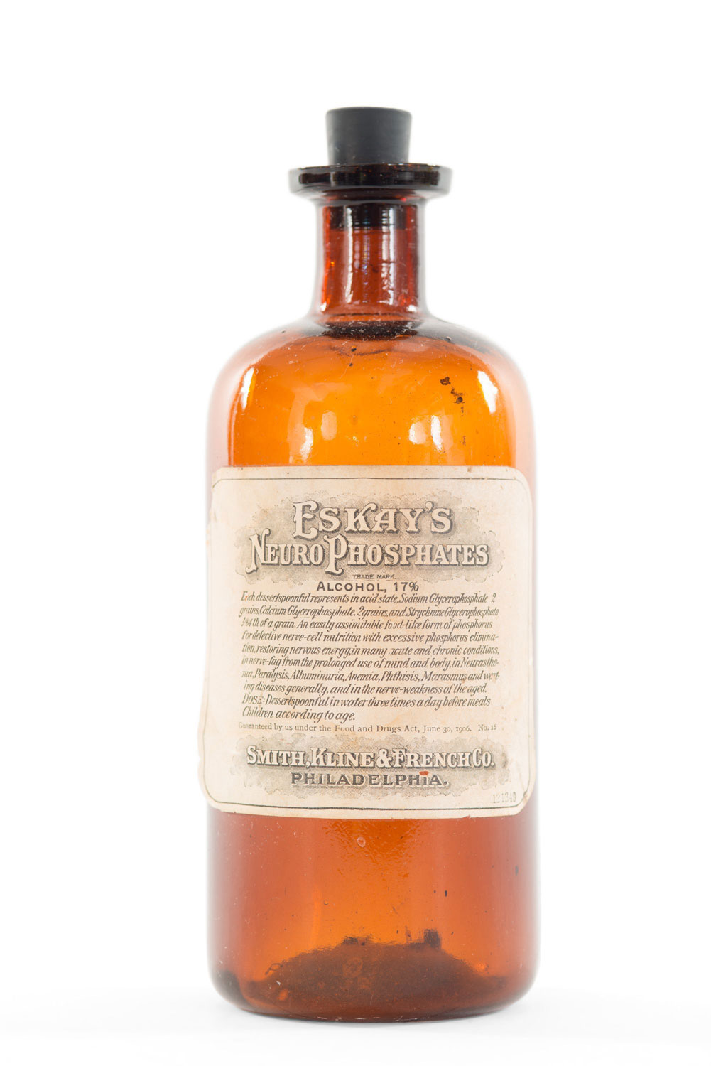 Vintage amber-tinted glass apothecary medicine bottle with neuro phosphates label and rubber stopper