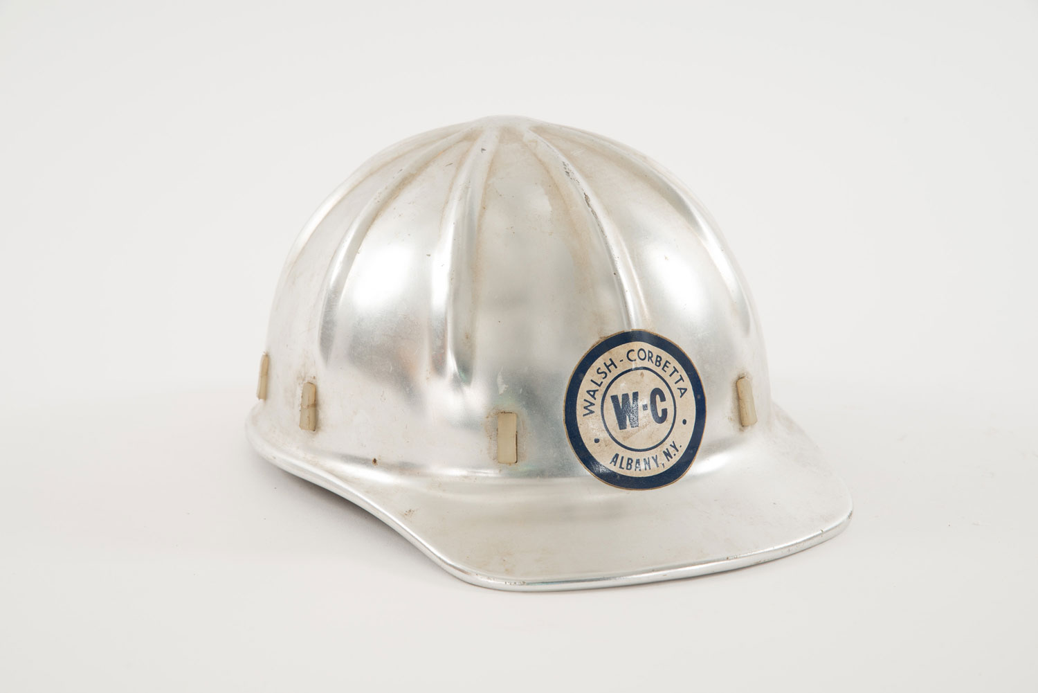Burnished silver metal construction helmet with white and blue round Walsh-Corbetta logo sticker on the front and a brown perforated leather fit band around the interior.