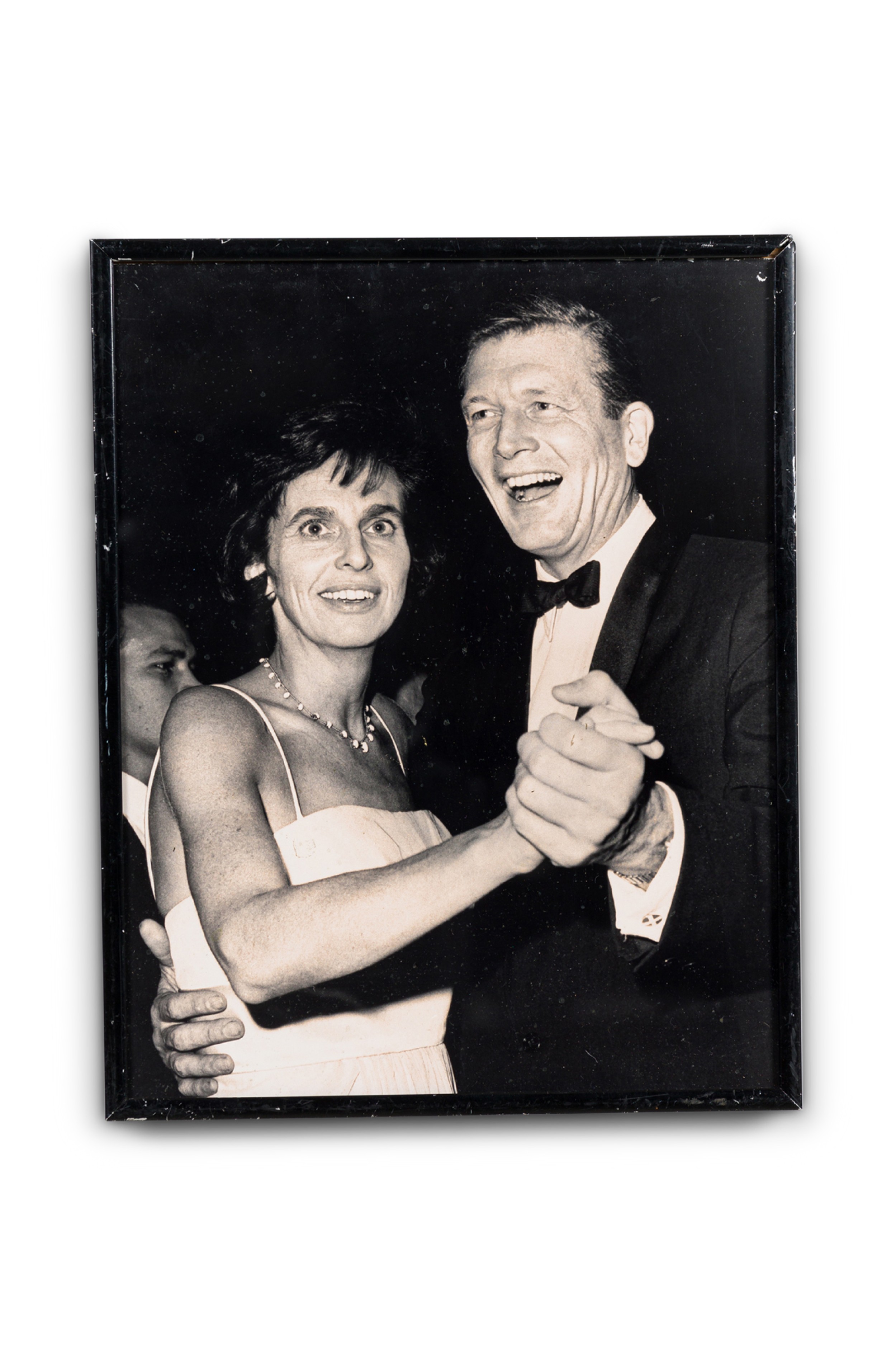 Vintage black and white photograph of a woman and man dancing in a black metal frame