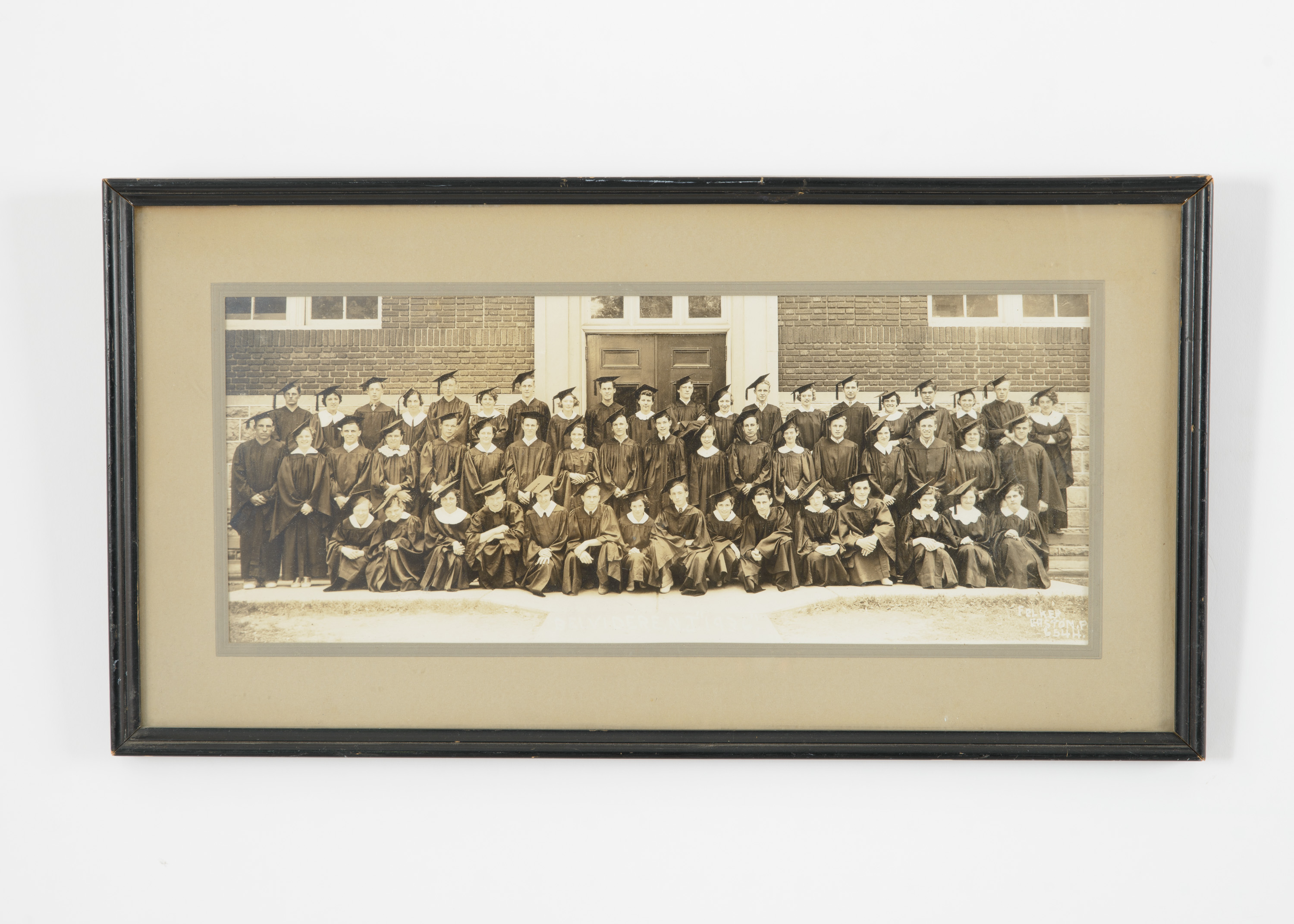 Vintage black and white photograph of a graduating class in gray matting and a black painted wooden frame