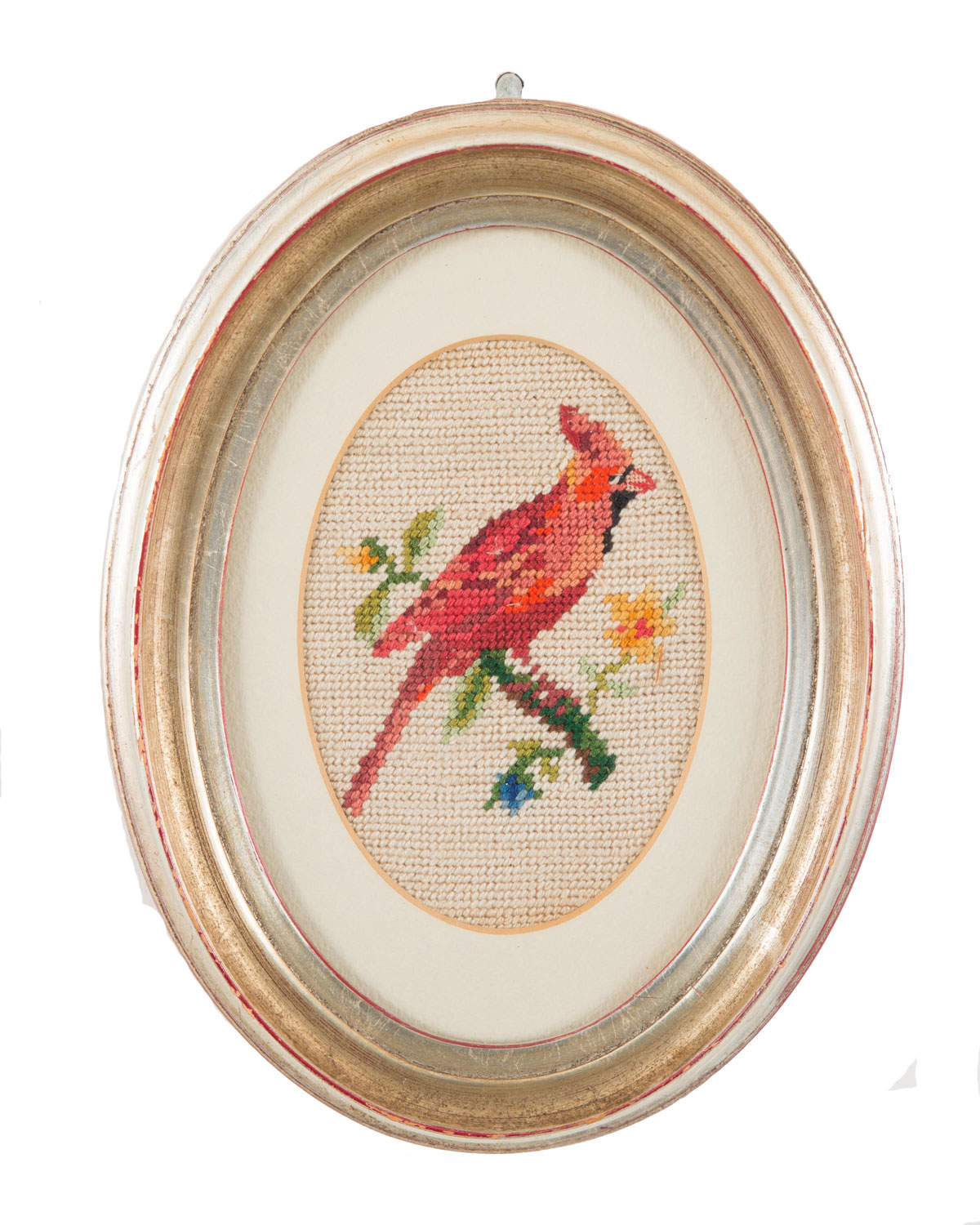 Cross-stitched picture of a cardinal on a branch on tan aida cloth in an oval gilt wood frame