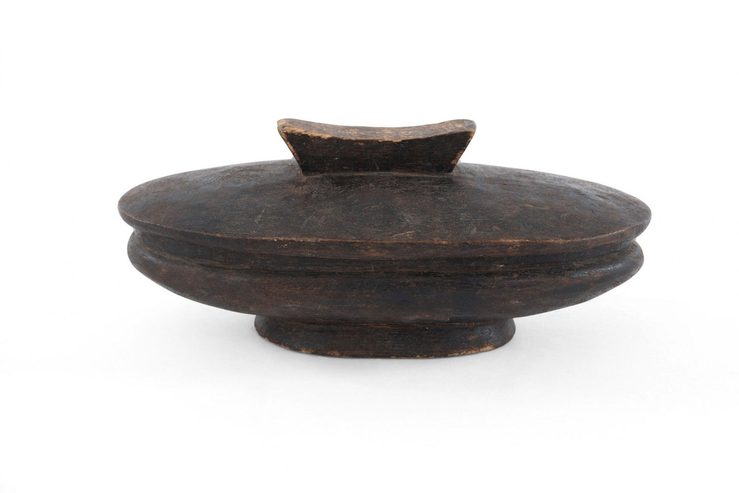Rustic African-style carved dark wood oval bowl box with a matching lid, trapezoidal handle, and oval foot