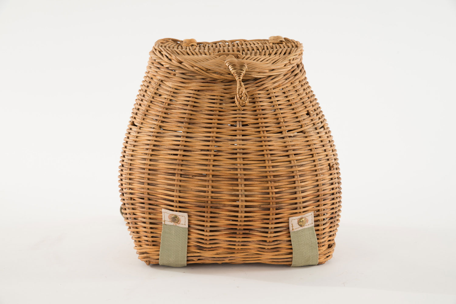 Vintage wicker fisherman's basket with two green webbing backpack straps, and a wicker hinge, latch and lid.
