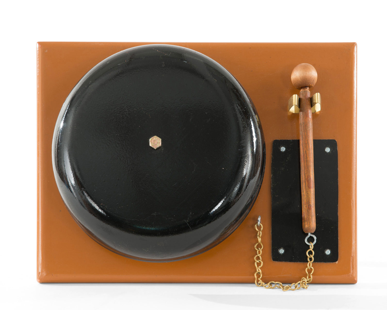 Black painted boxing round bell with a wooden mallet mounted with a gold chain on a brown painted rectangular wooden plaque