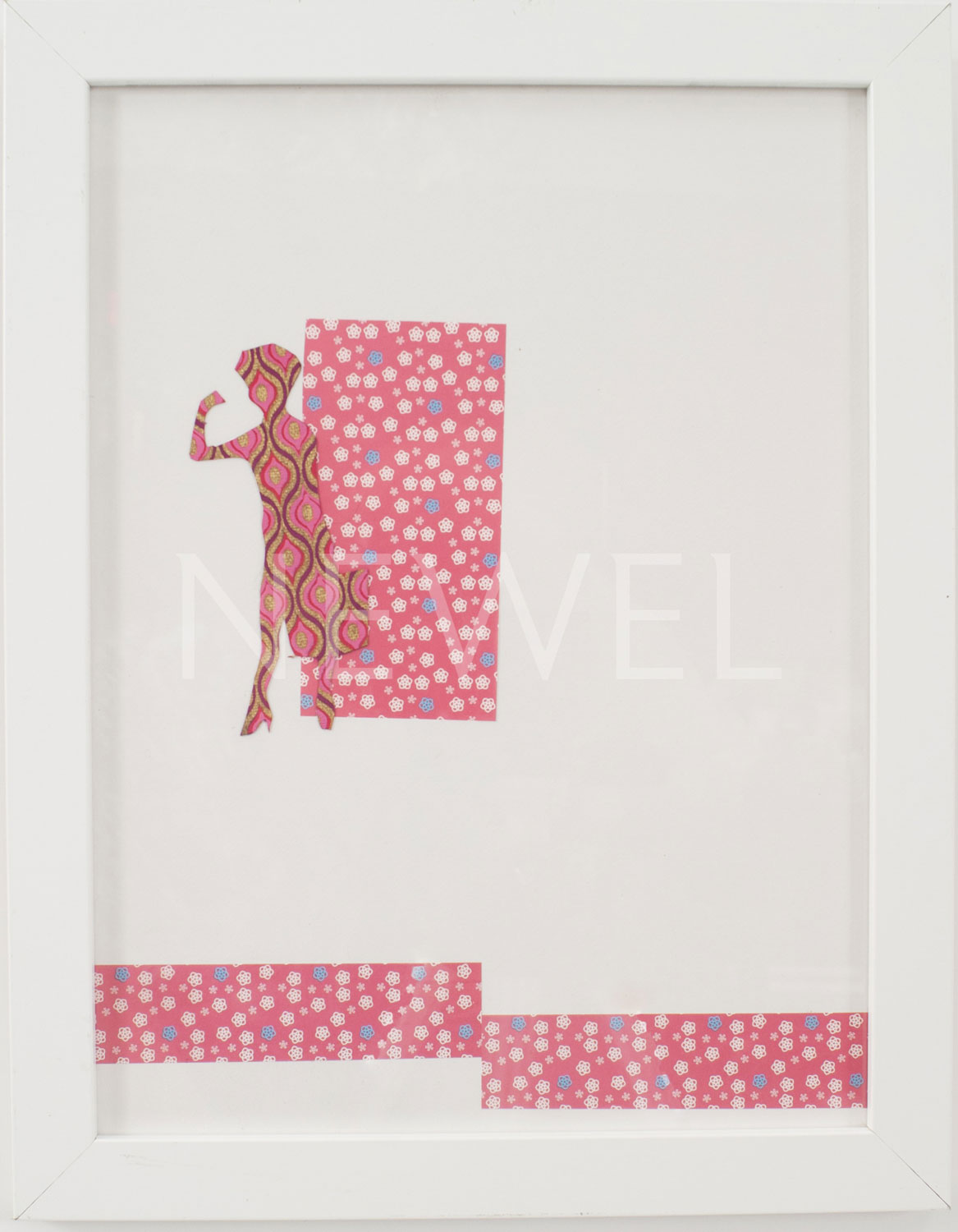 Contemporary pink and purple patterned origami paper collage featuring a human silhouette and geometric shapes on a white background in a white rectangular frame (Companion pieces: AAP215, AAP216)