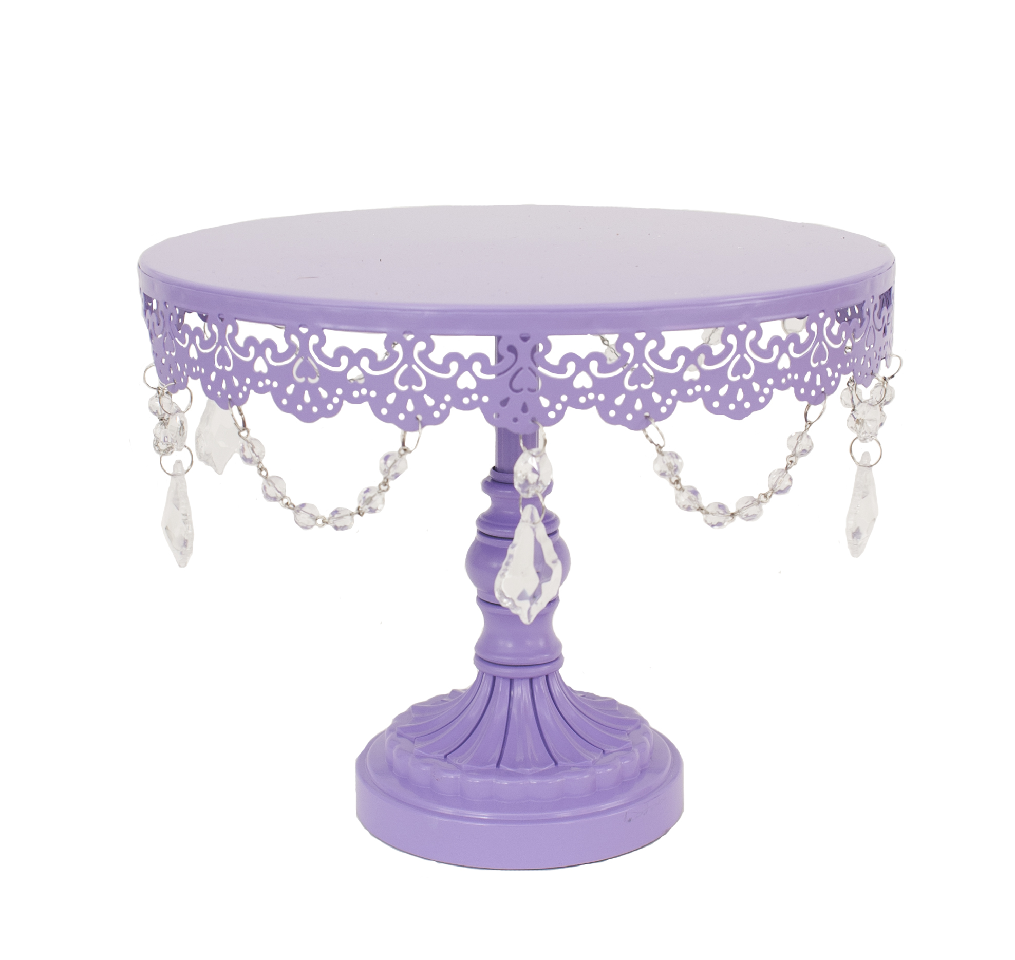Contemporary purple metal cake stand with scalloped reticulated border design and faux teardrop crystals