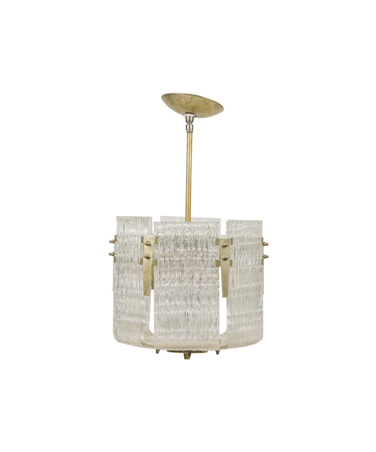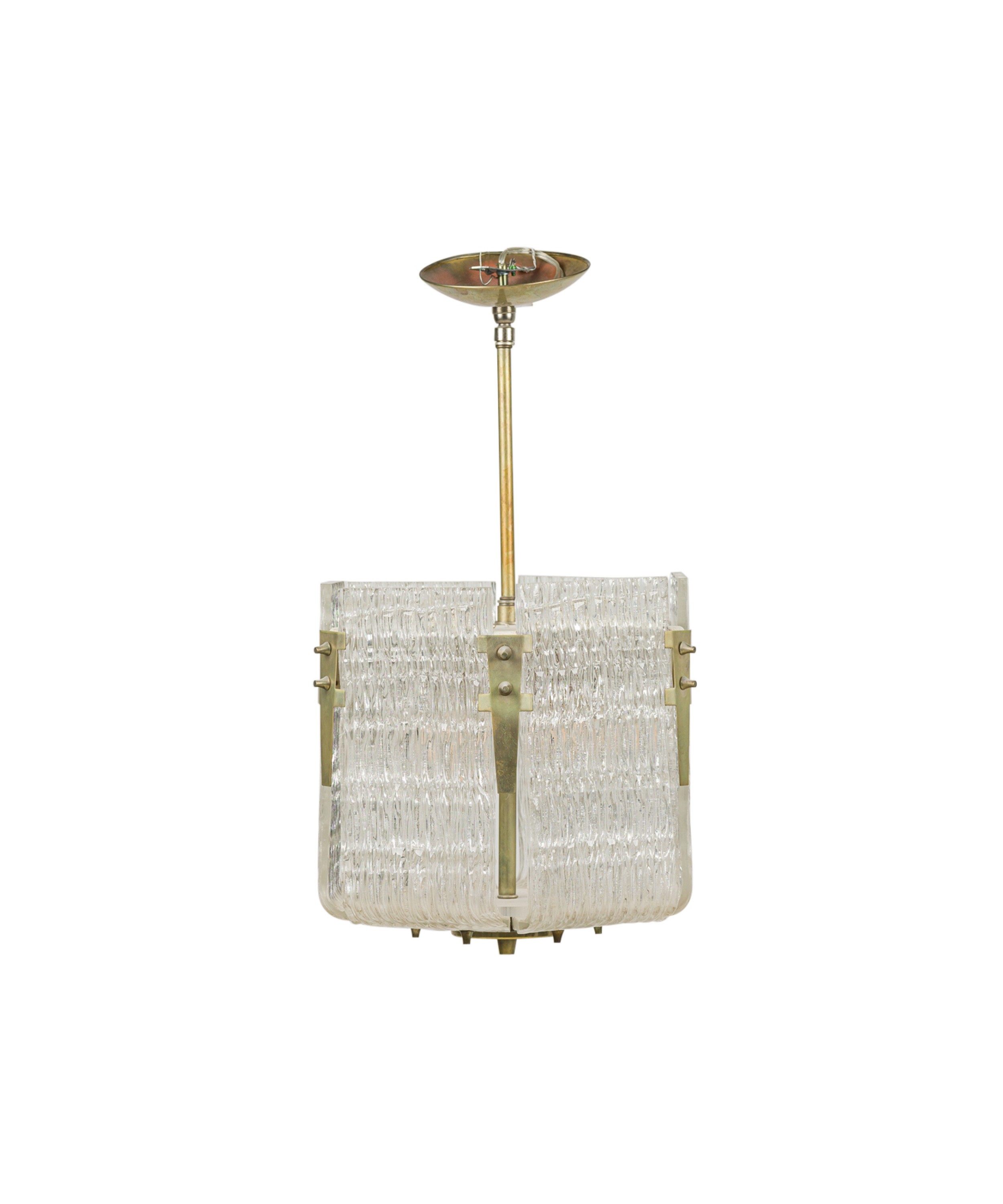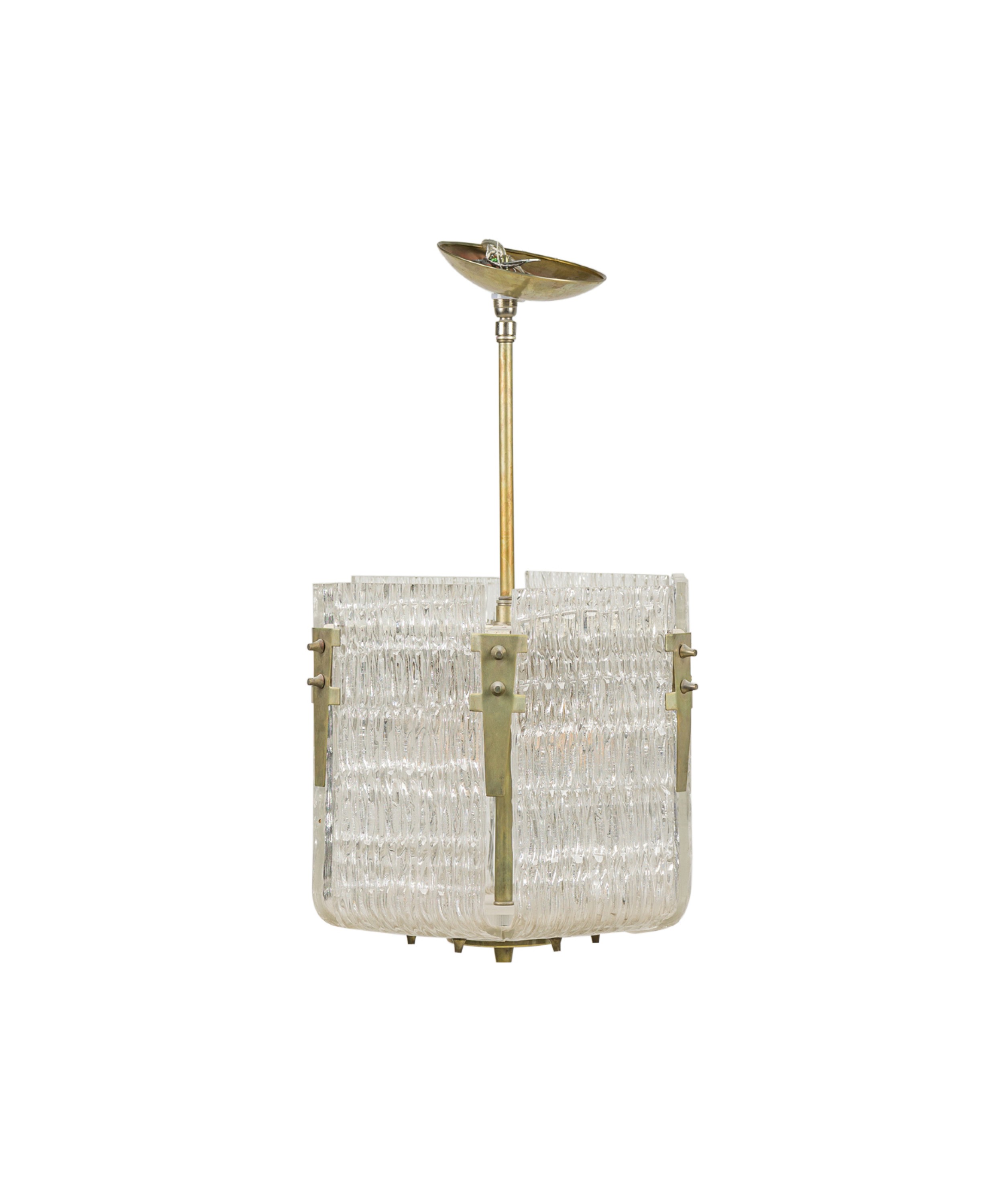 3 Mid-Century (possibly Scandinavian) chandelier with 6 clear textured rectangular shaped panels with a tiered design supported in a brass frame with a round bottom finial (PRICED EACH)