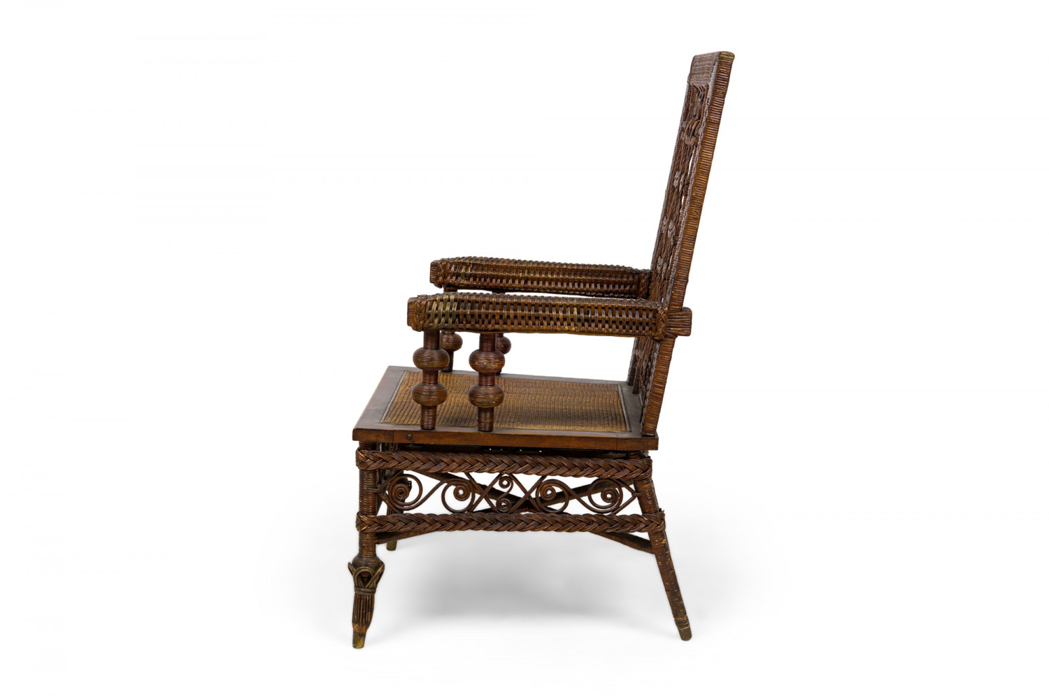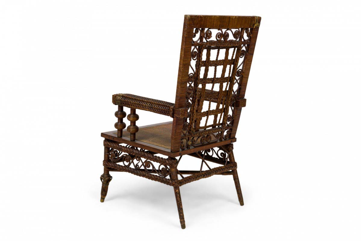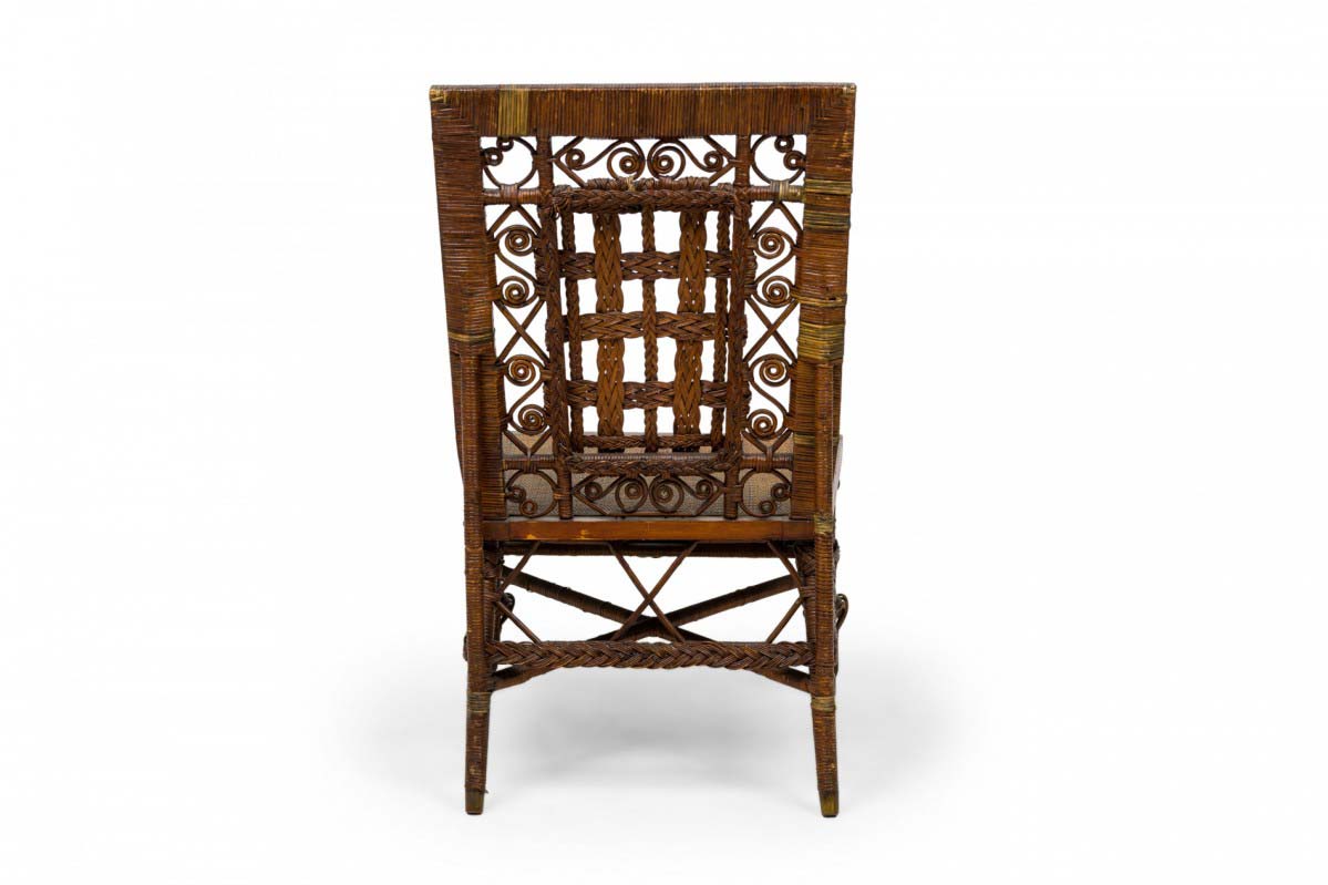 3 Piece American Victorian Wicker salon / seating set including a settee, armchair and side chair with basket weave wrapped frames, braided decorative lattice weave backs, and scroll decorations, each with a primary pastel floral upholstered seat cushion concealing woven caned seats. (PRICED AS SET) (Available individually: settee: 063494A, armchair: 063494B, side chair: 063494C)