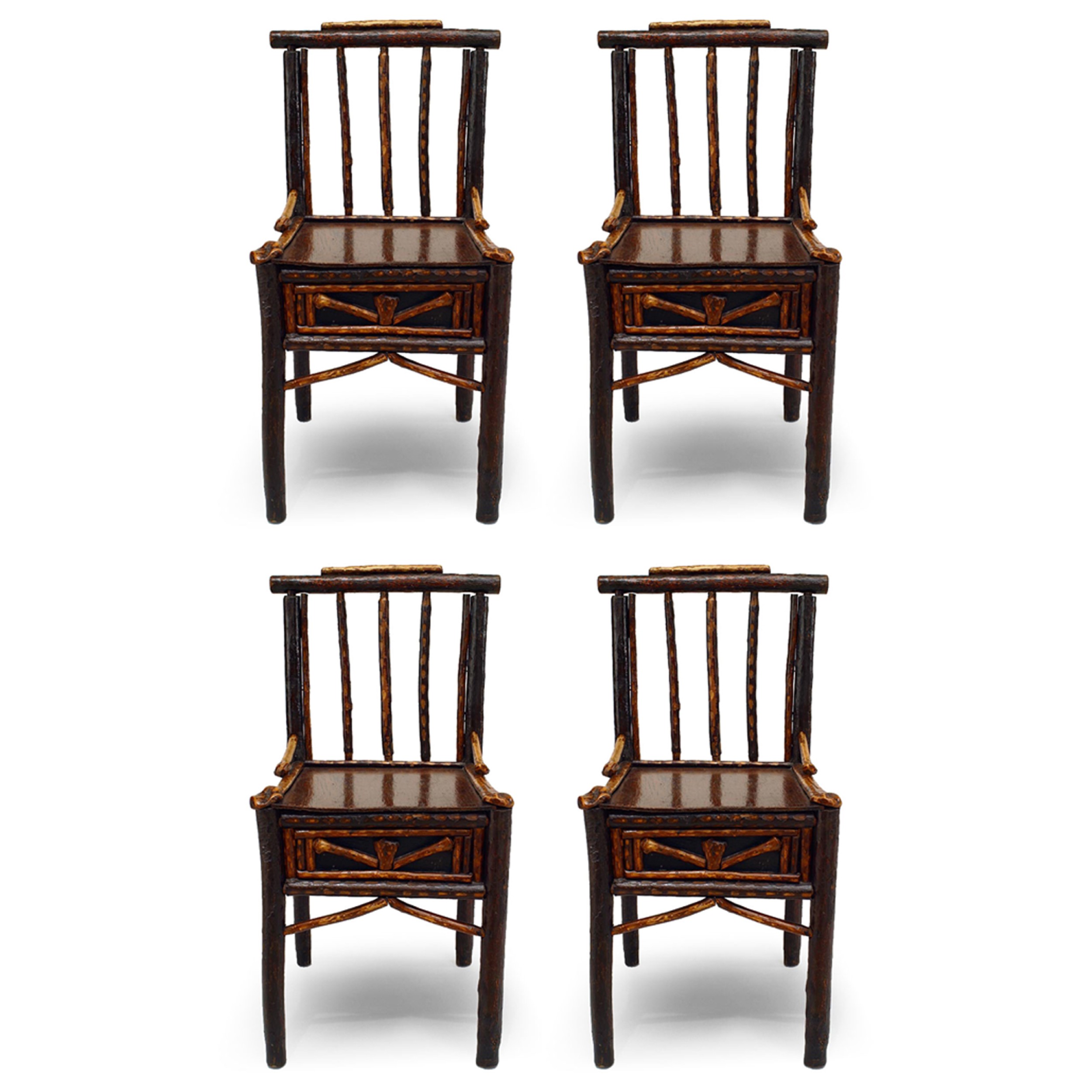 4 American Rustic Adirondack side chairs with spindle back and knotted trim (att: Ben Davis) (PRICED EACH