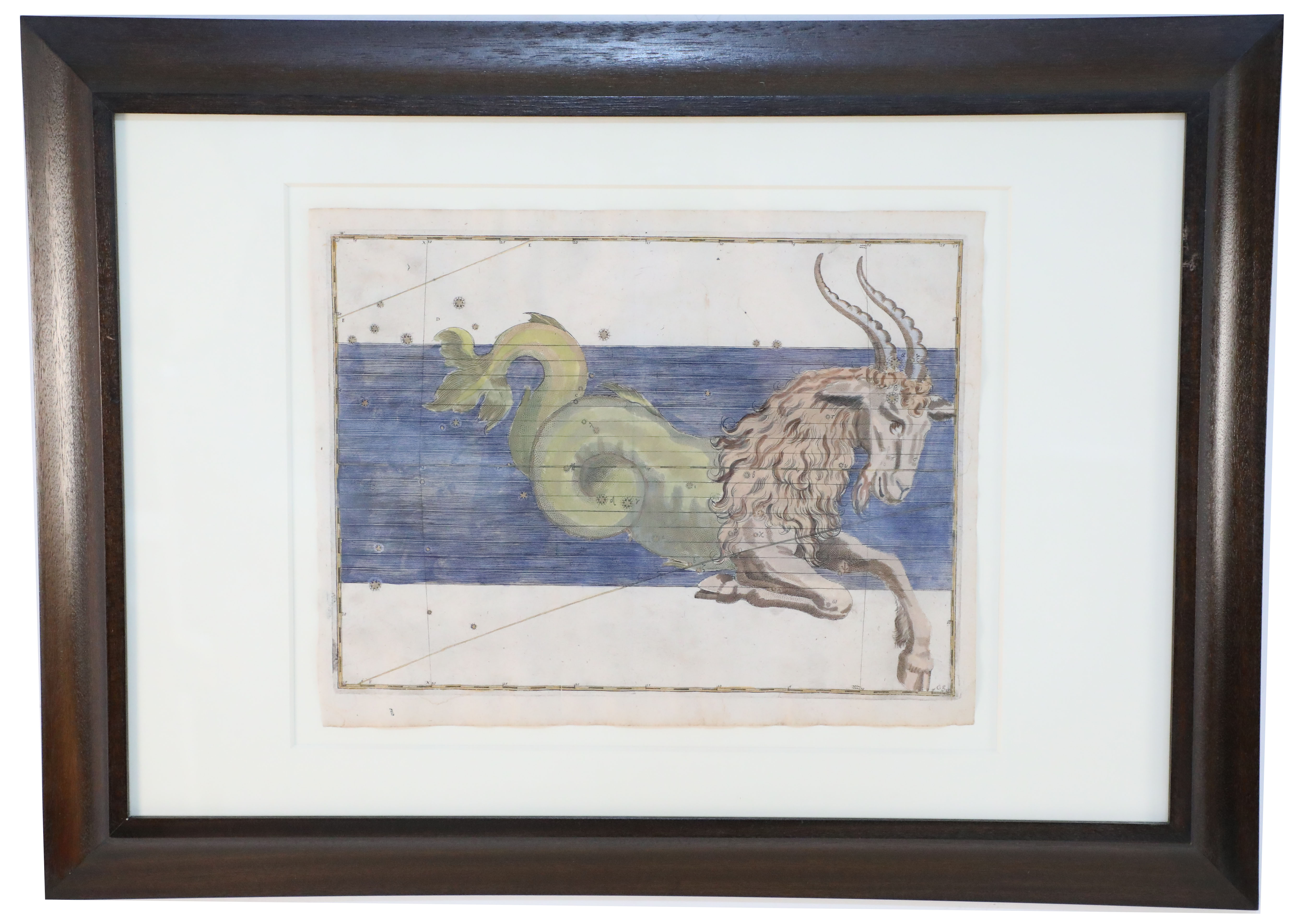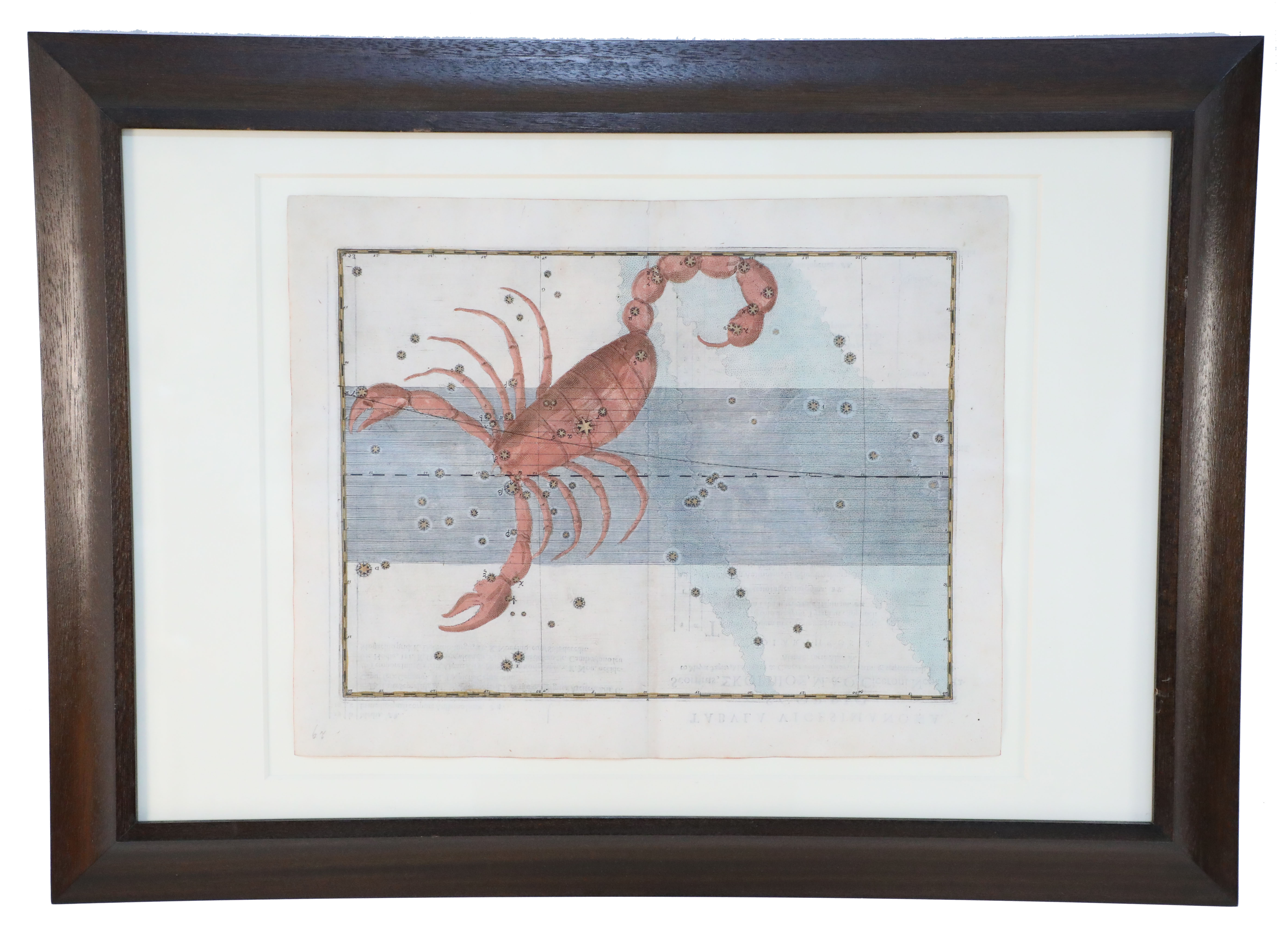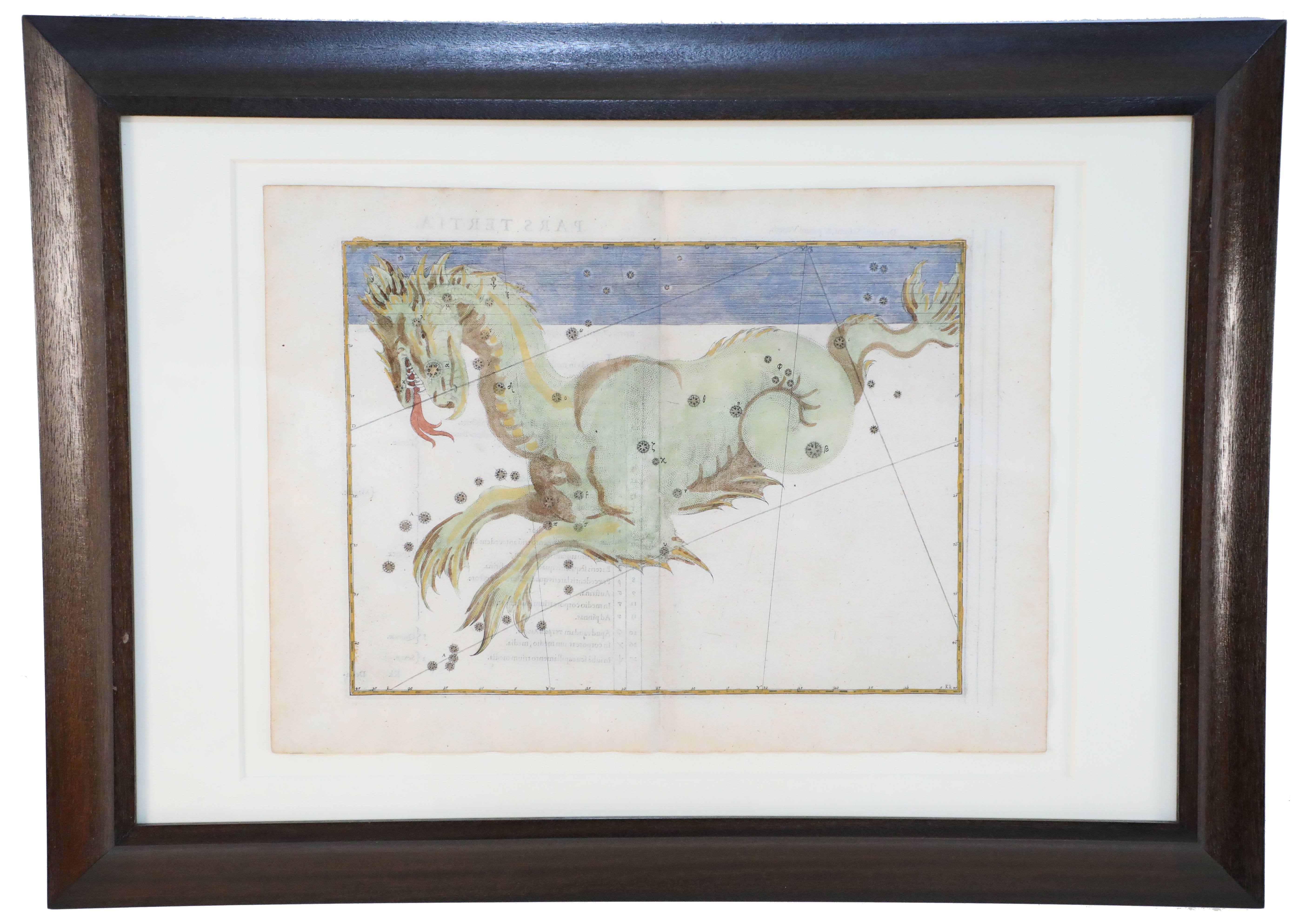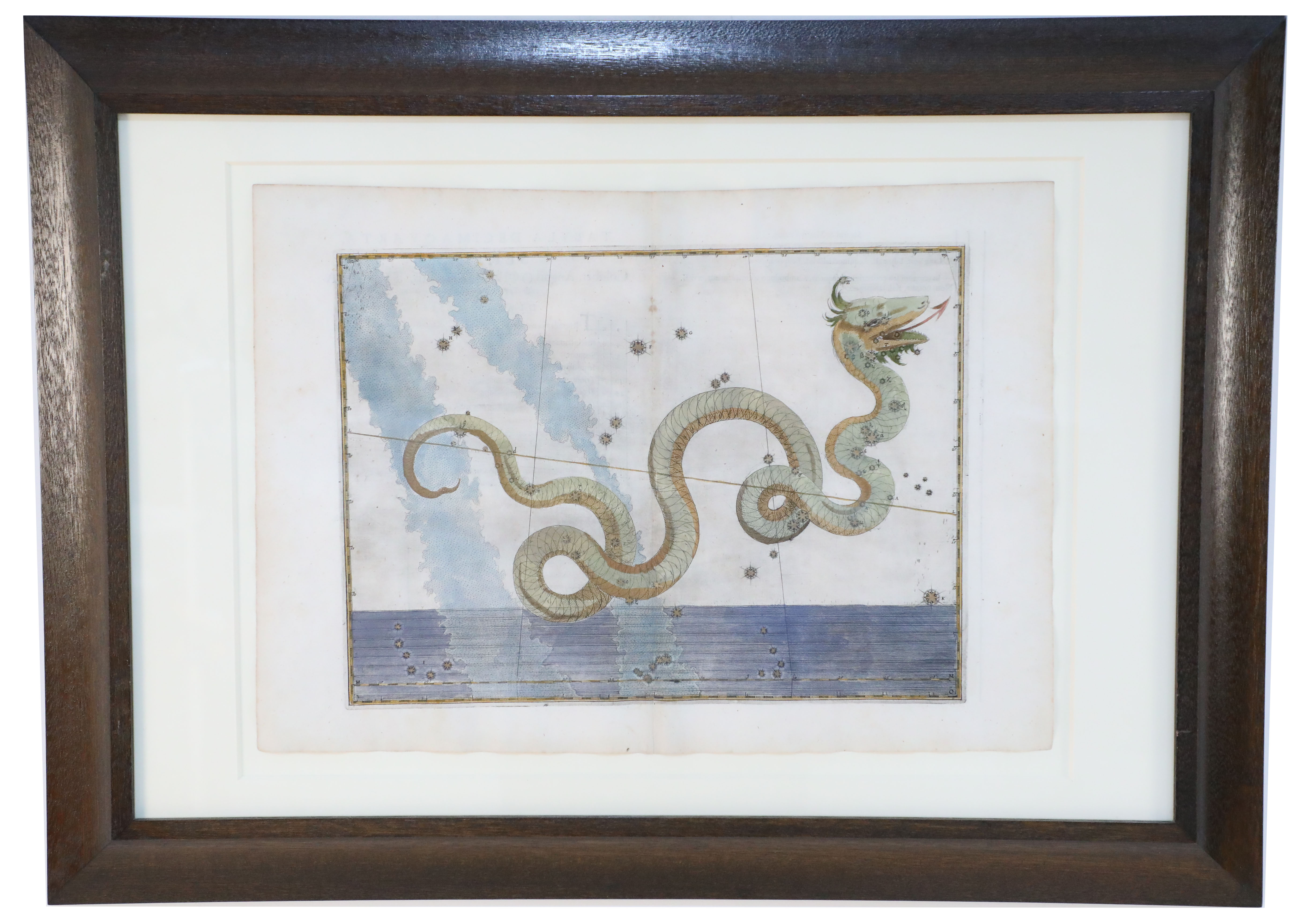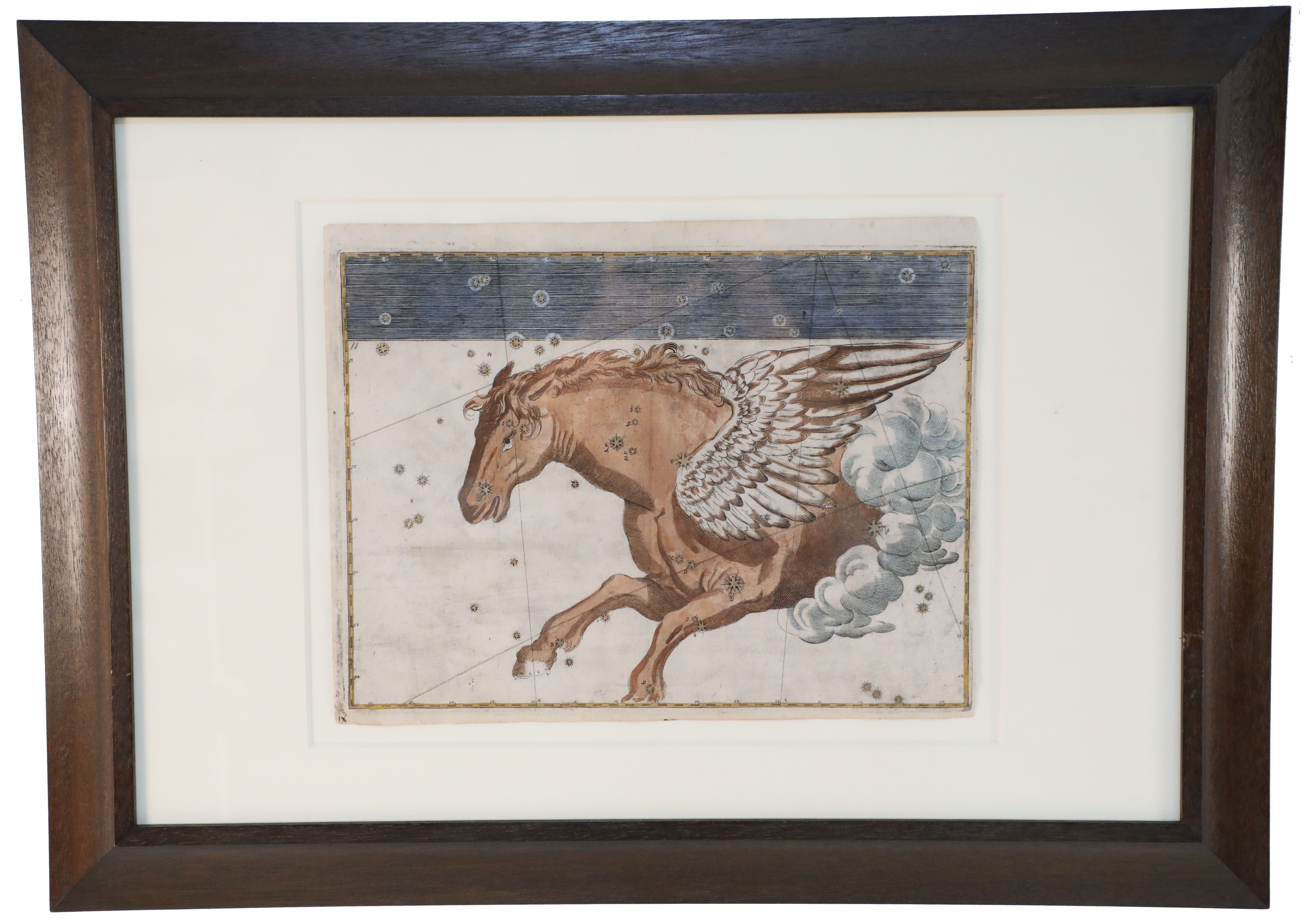 SET of 20 Renaissance (17th Century) engraved, hand-colored etchings for Johann Bayer's book 'Uranometria', a star atlas, in wooden frames with white mat. Plates are taken directly from the book. (ALEXANDER MAIR)(Available individually: NWL6291A-T)