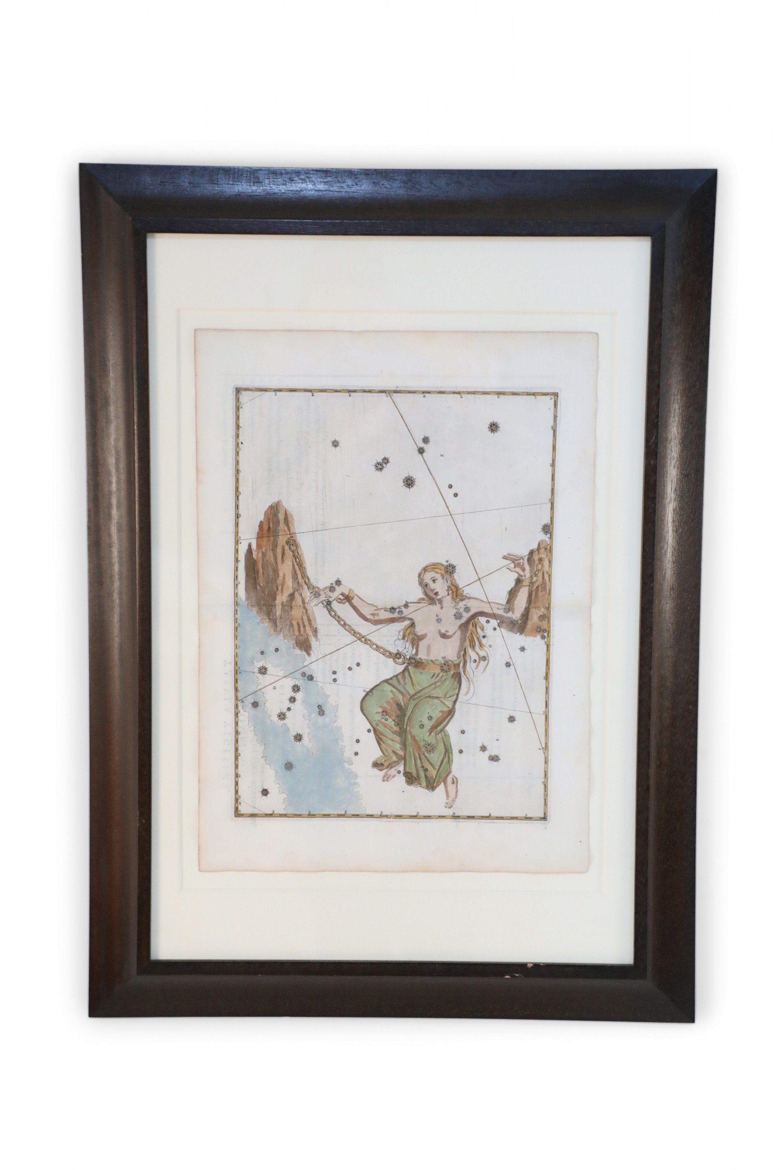 Renaissance (17th Century) engraved, hand-colored etching for Johann Bayer's book 'Uranometria', a star atlas, in rectangular wooden frame with white mat. Plate is taken directly from the book. (ALEXANDER MAIR)(Others in series: NWL6291A-NWL6291T)