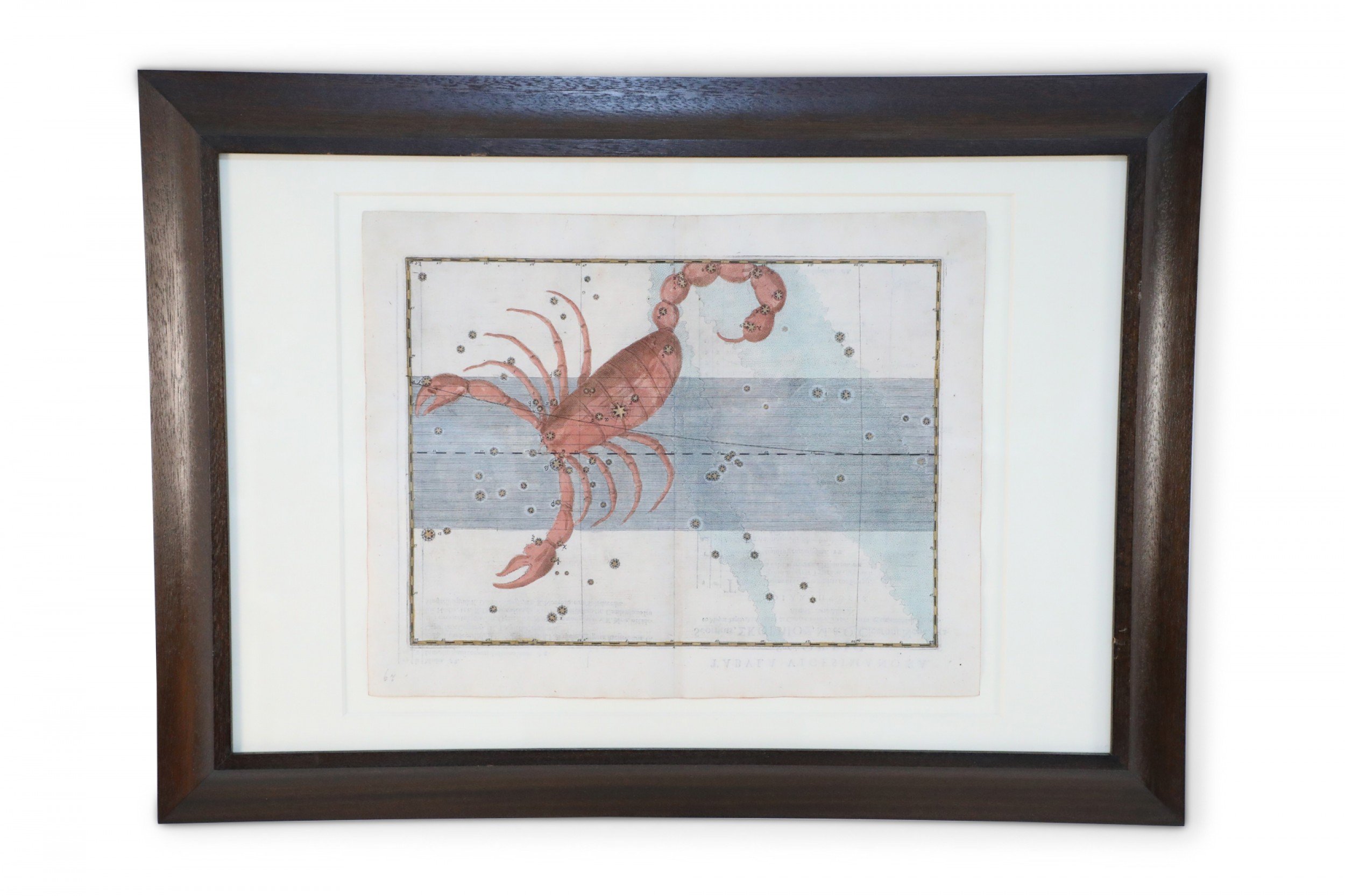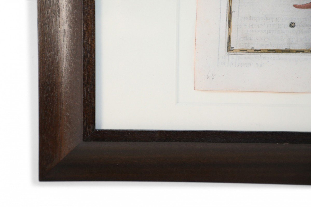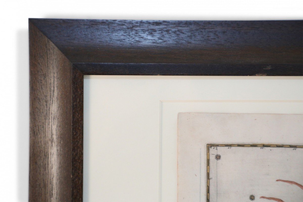 Renaissance (17th Century) engraved, hand-colored etching for Johann Bayer's book 'Uranometria', a star atlas, in rectangular wooden frame with white mat. Plate is taken directly from the book. (ALEXANDER MAIR)(Others in series: NWL6291A-NWL6291T)