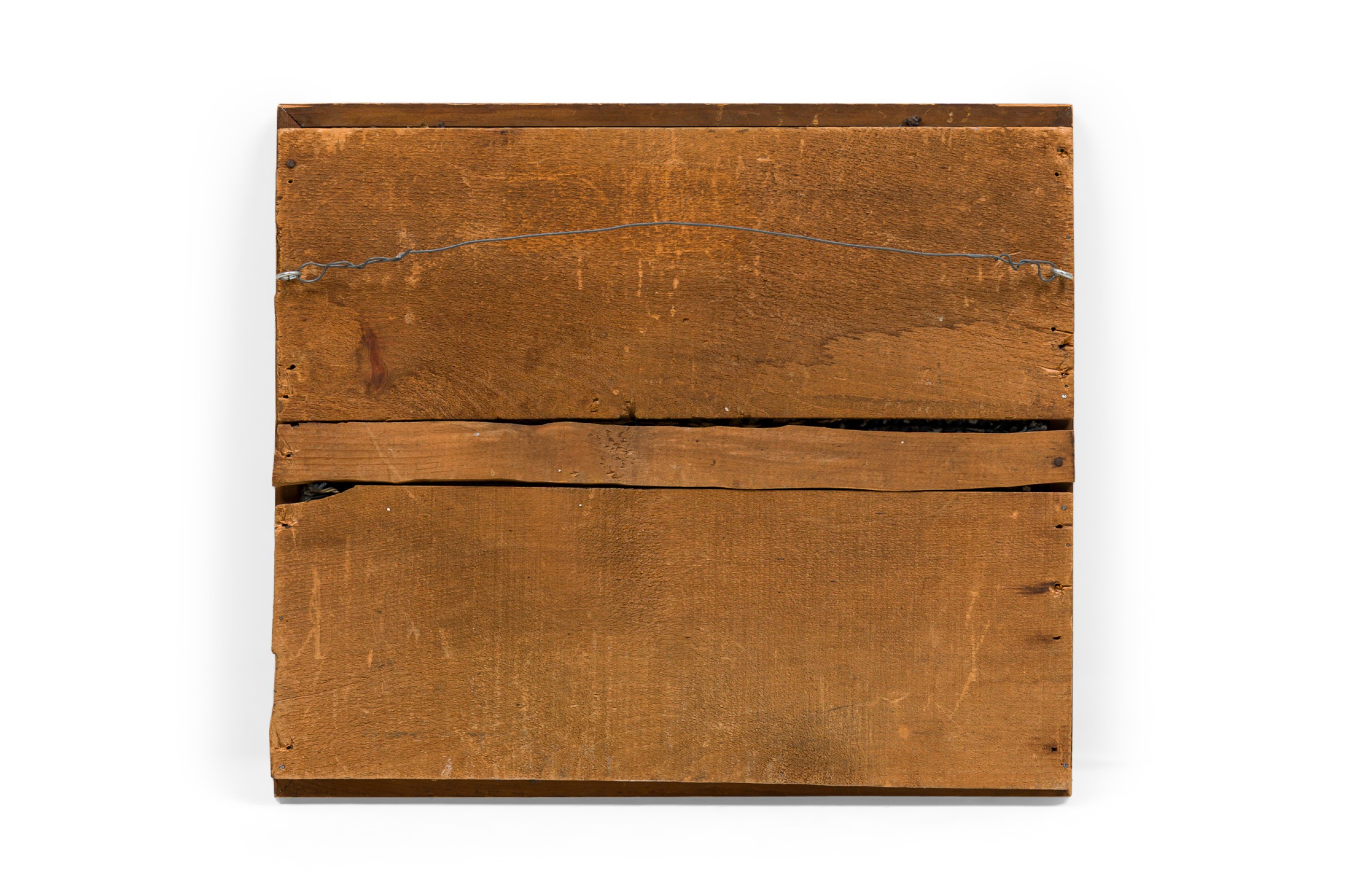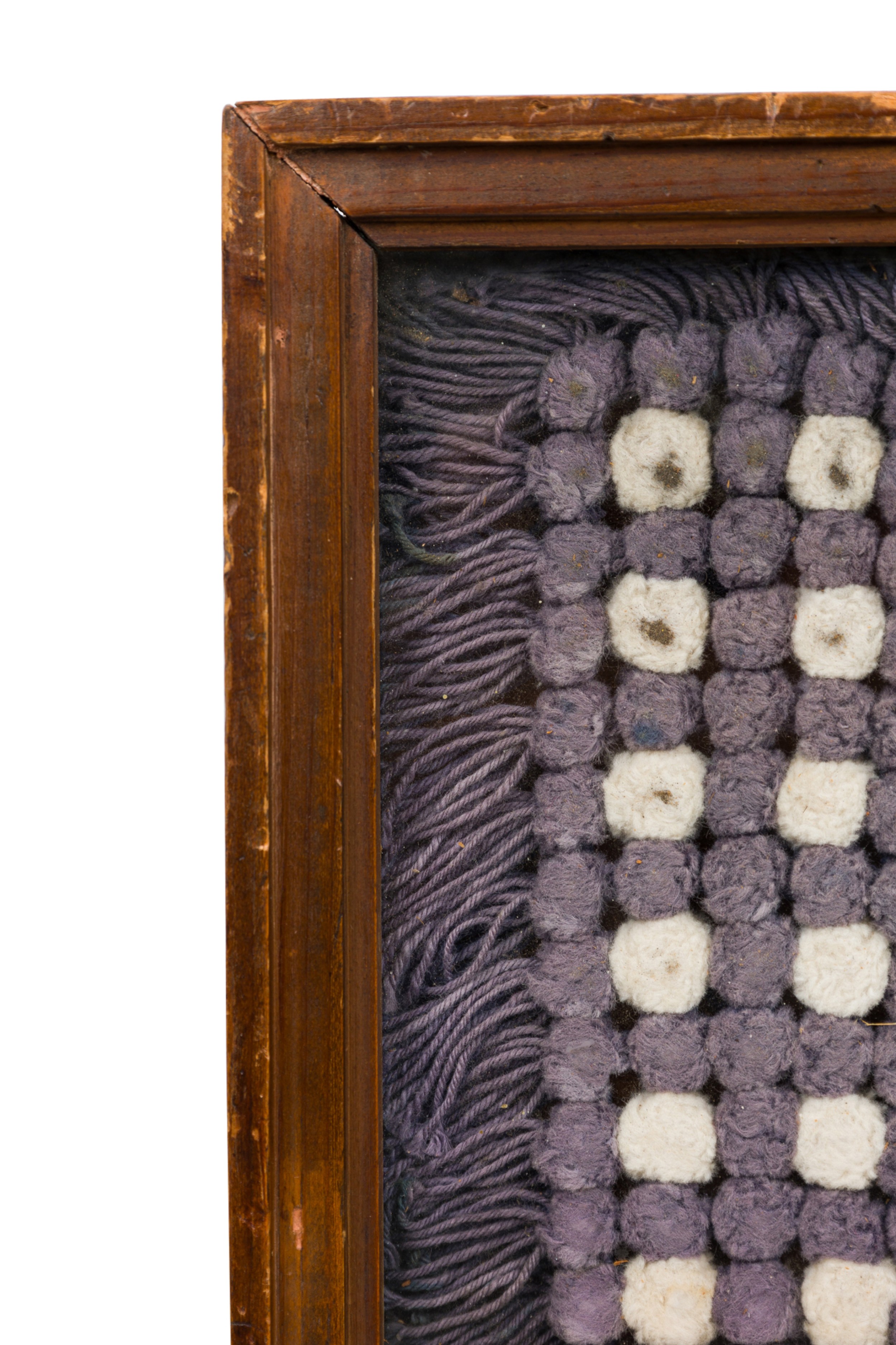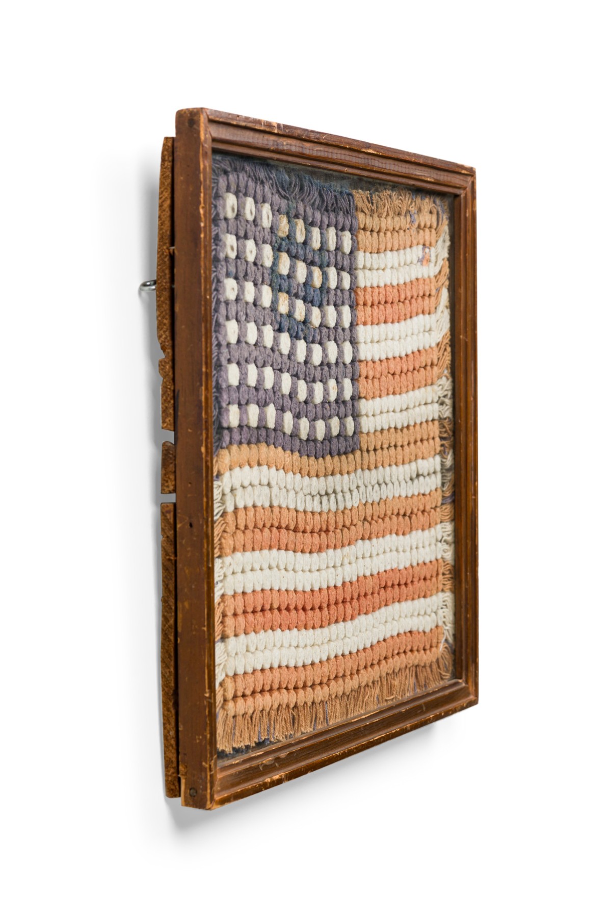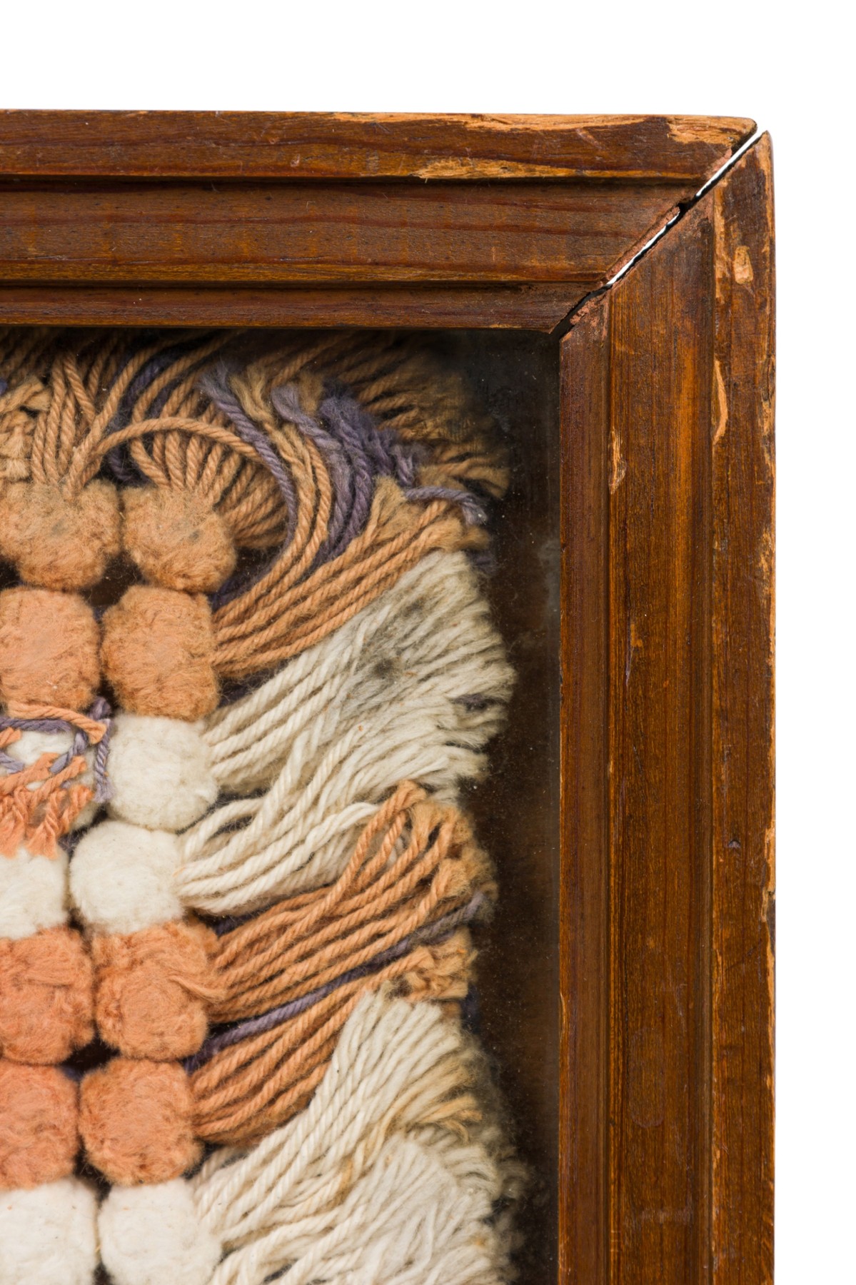 American Country (early 20th Century) folk art embroidery of a US flag portrayed with small pompoms in a wood frame behind glass.