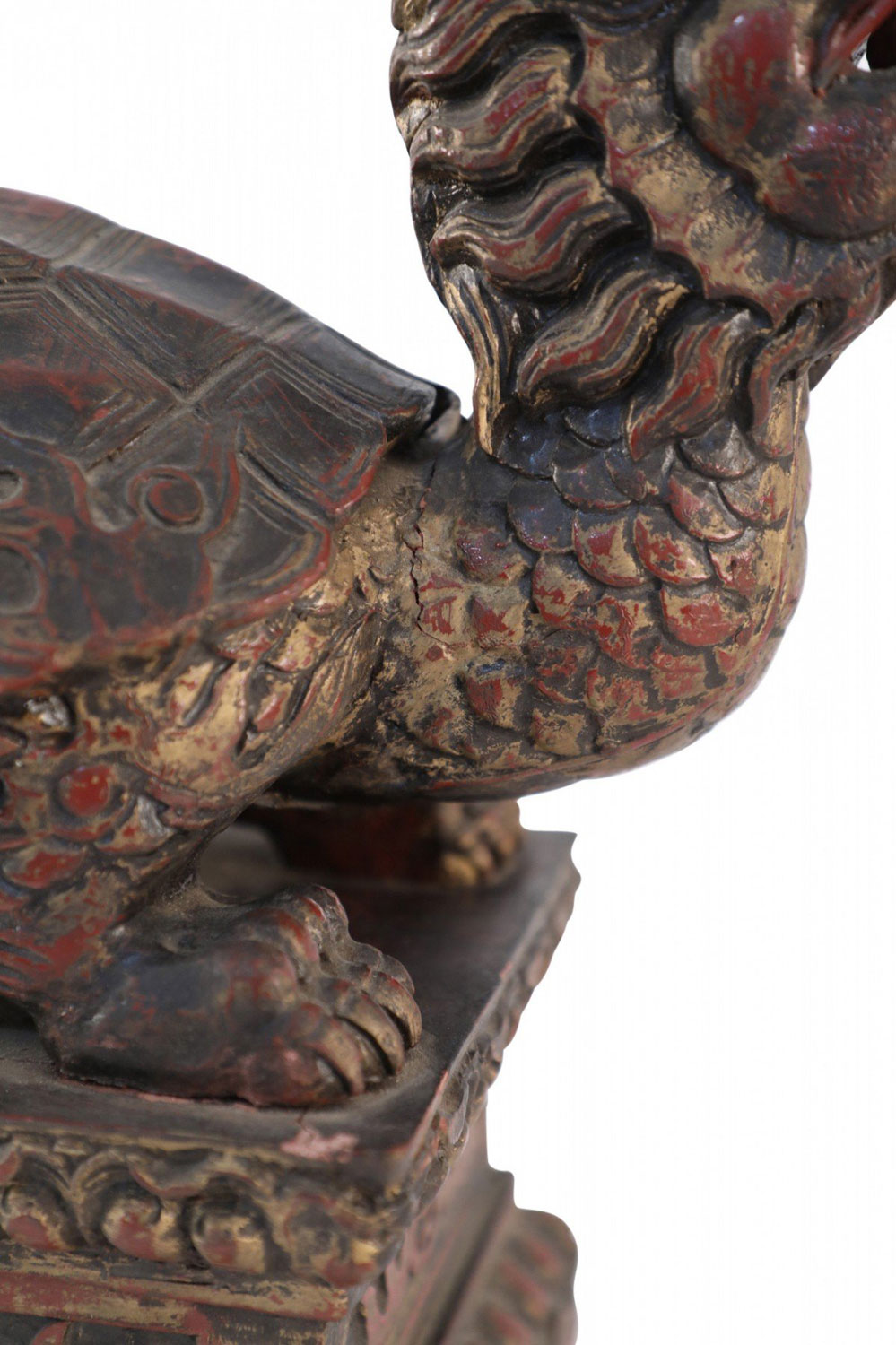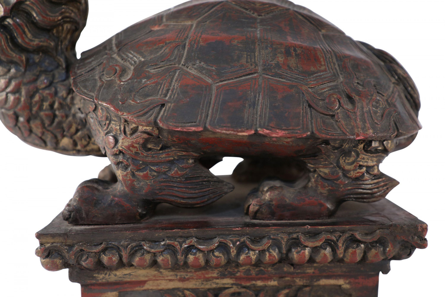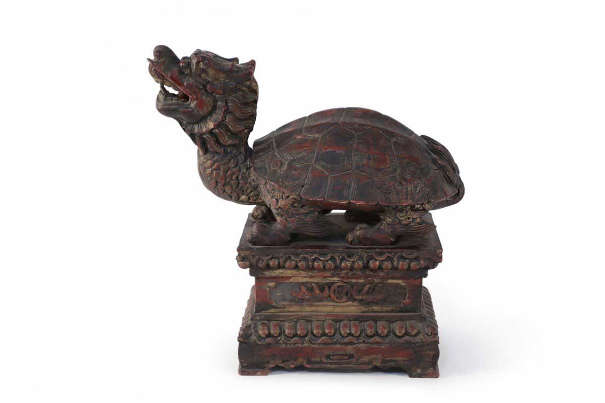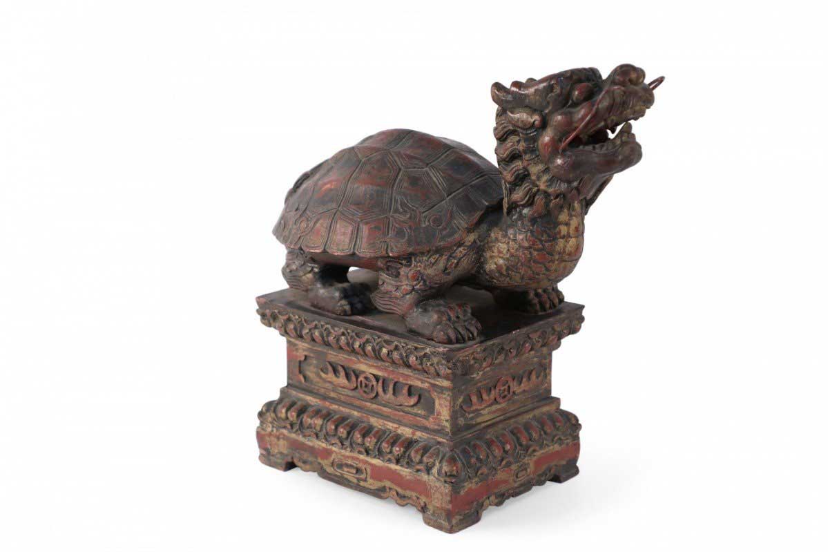 Antique Chinese carved wooden sculpture of a Longgui or (dragon turtle) holding a coin in its mouth on an ornately carved wooden base.