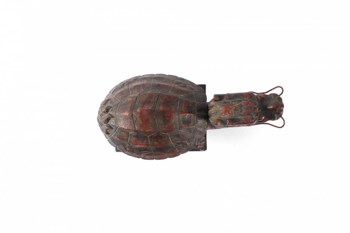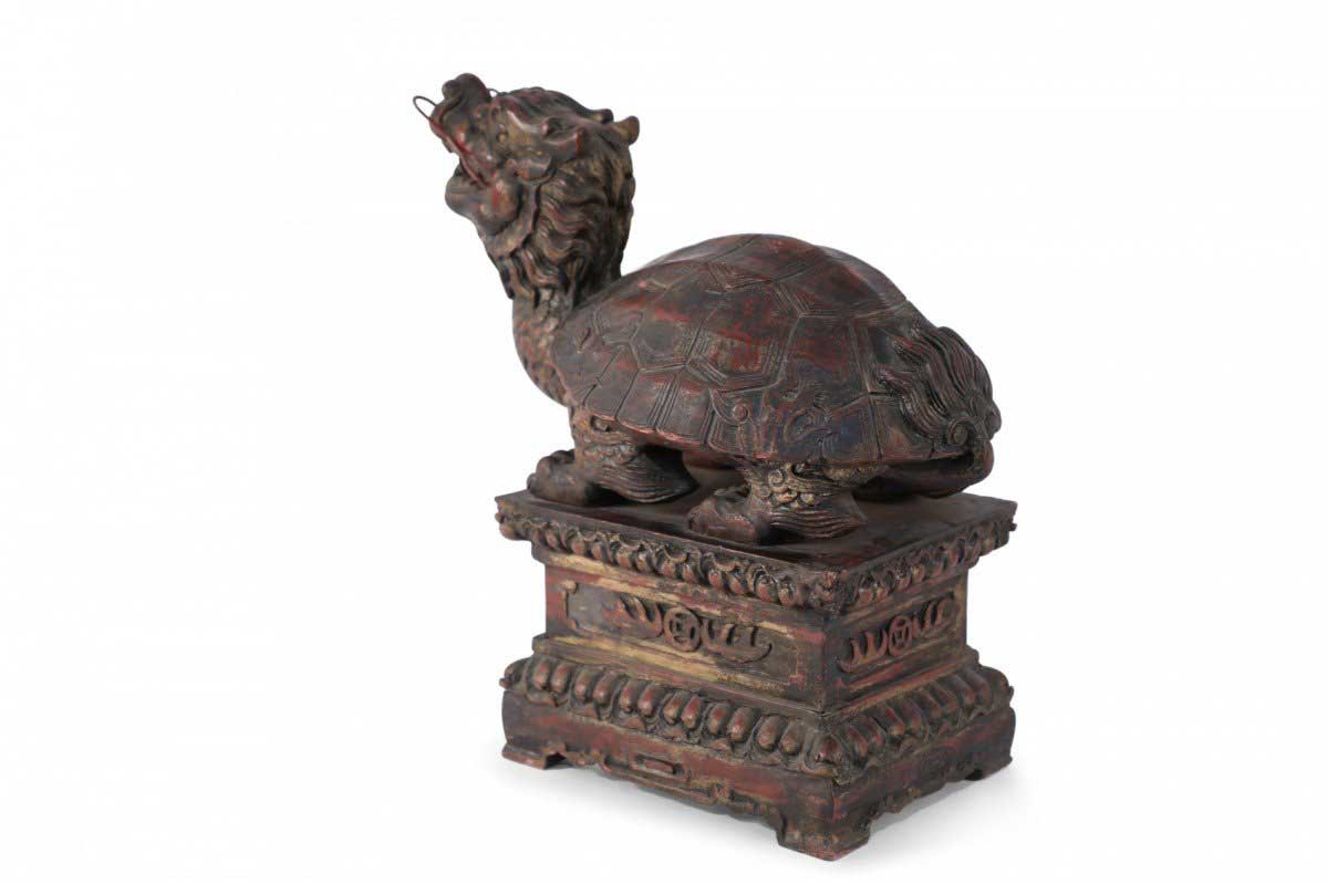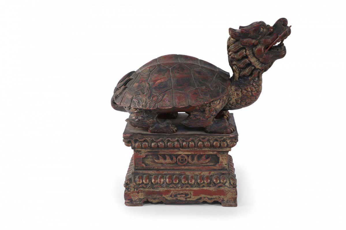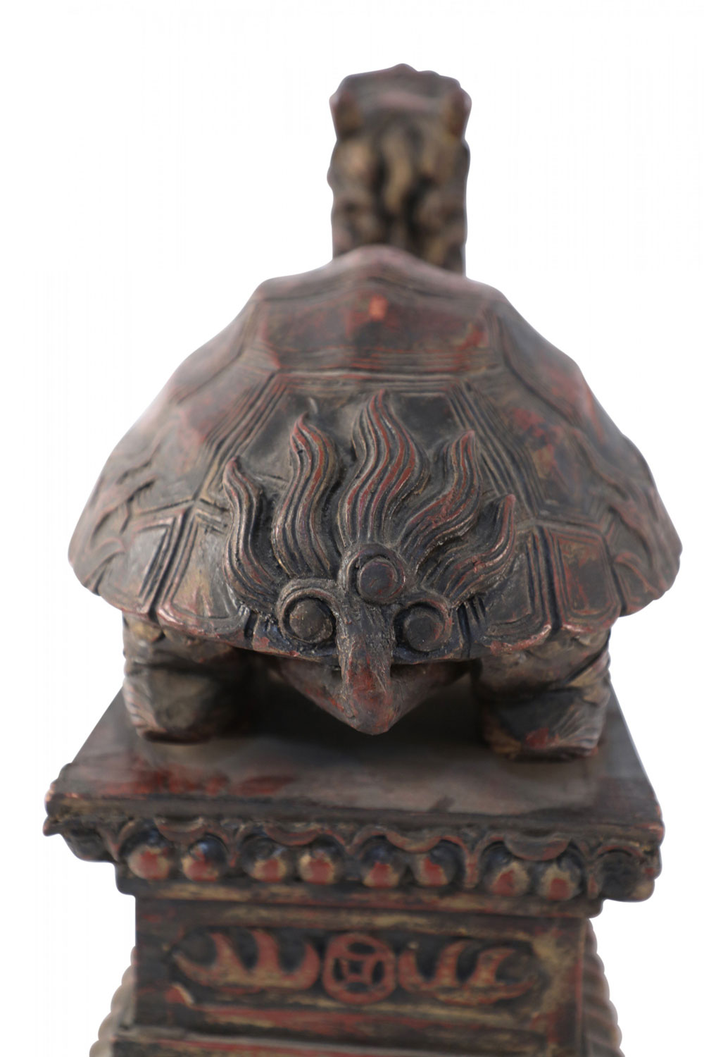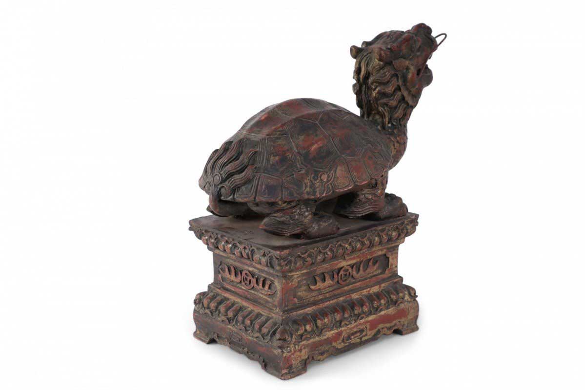 Antique Chinese carved wooden sculpture of a Longgui or (dragon turtle) holding a coin in its mouth on an ornately carved wooden base.