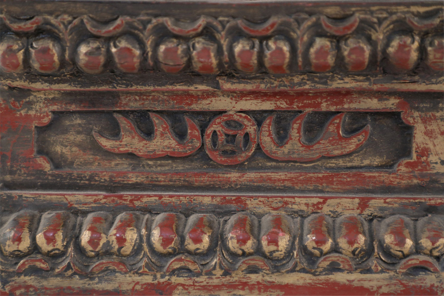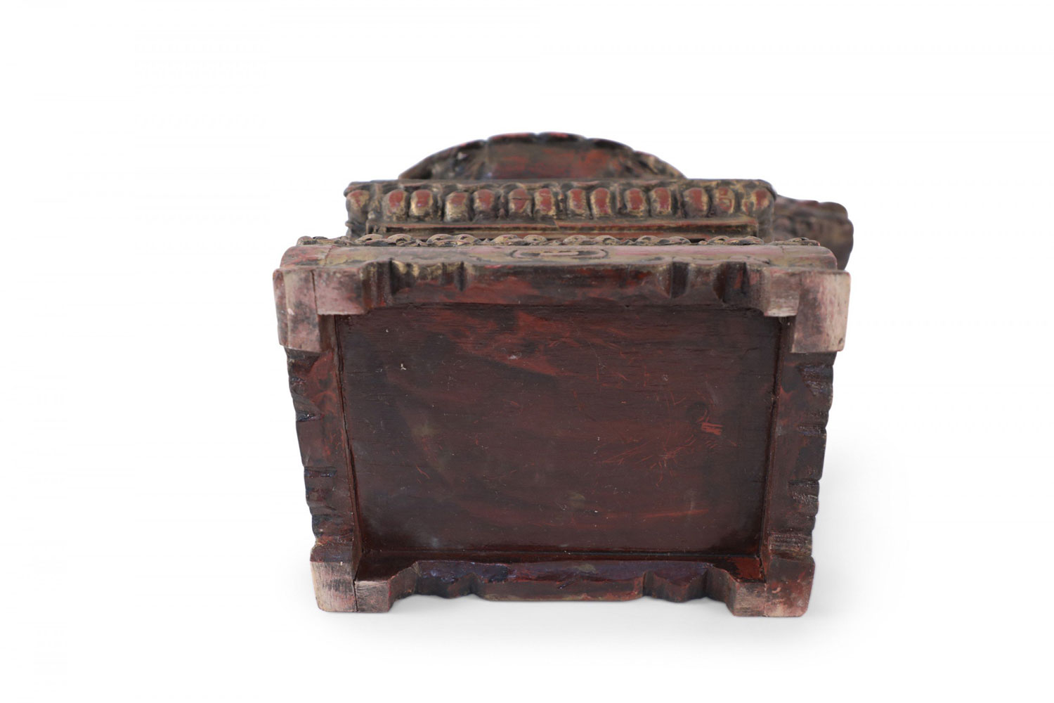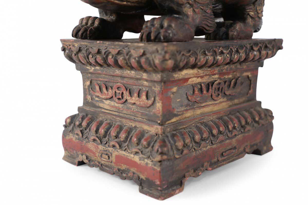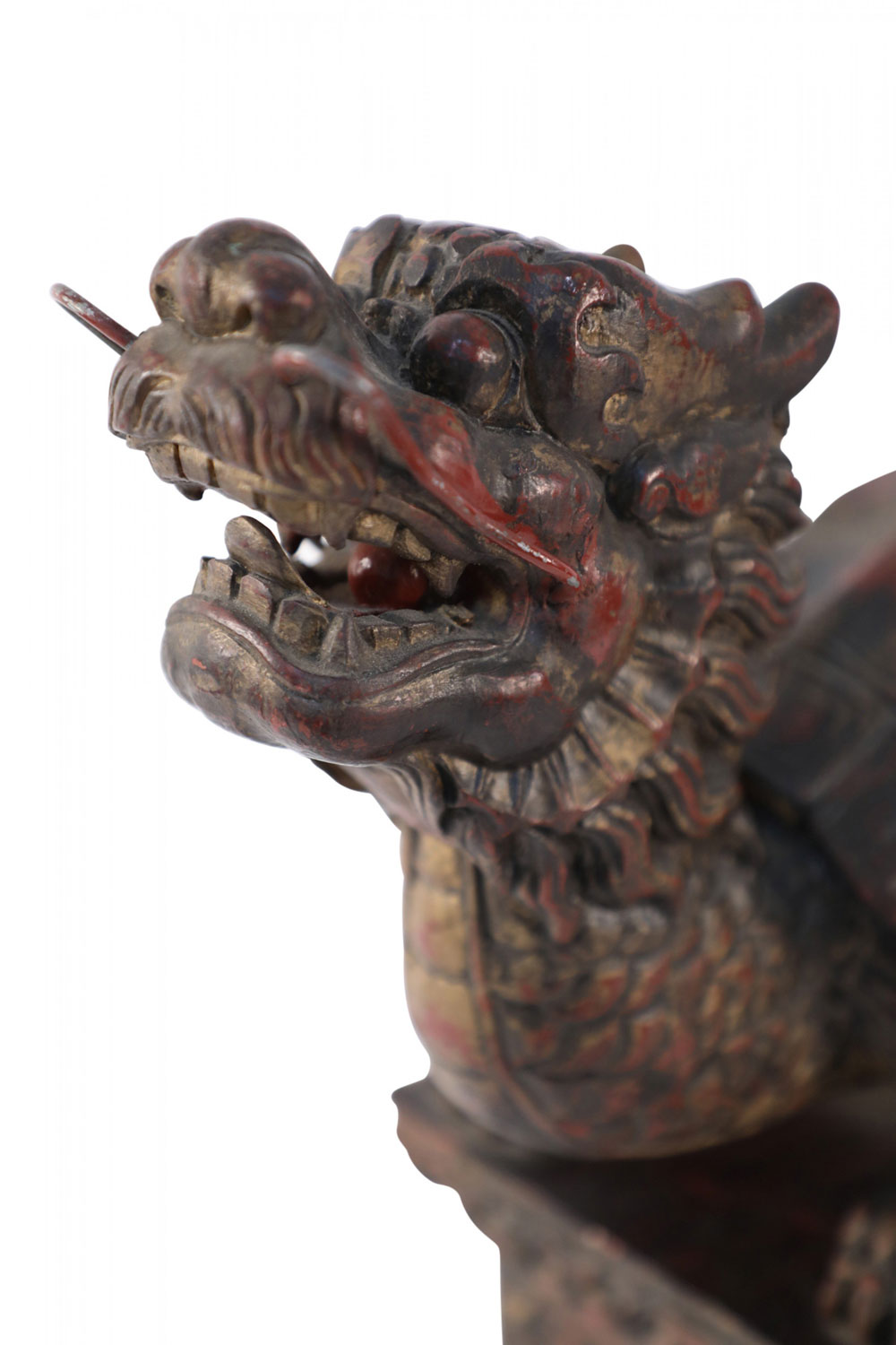 Antique Chinese carved wooden sculpture of a Longgui or (dragon turtle) holding a coin in its mouth on an ornately carved wooden base.