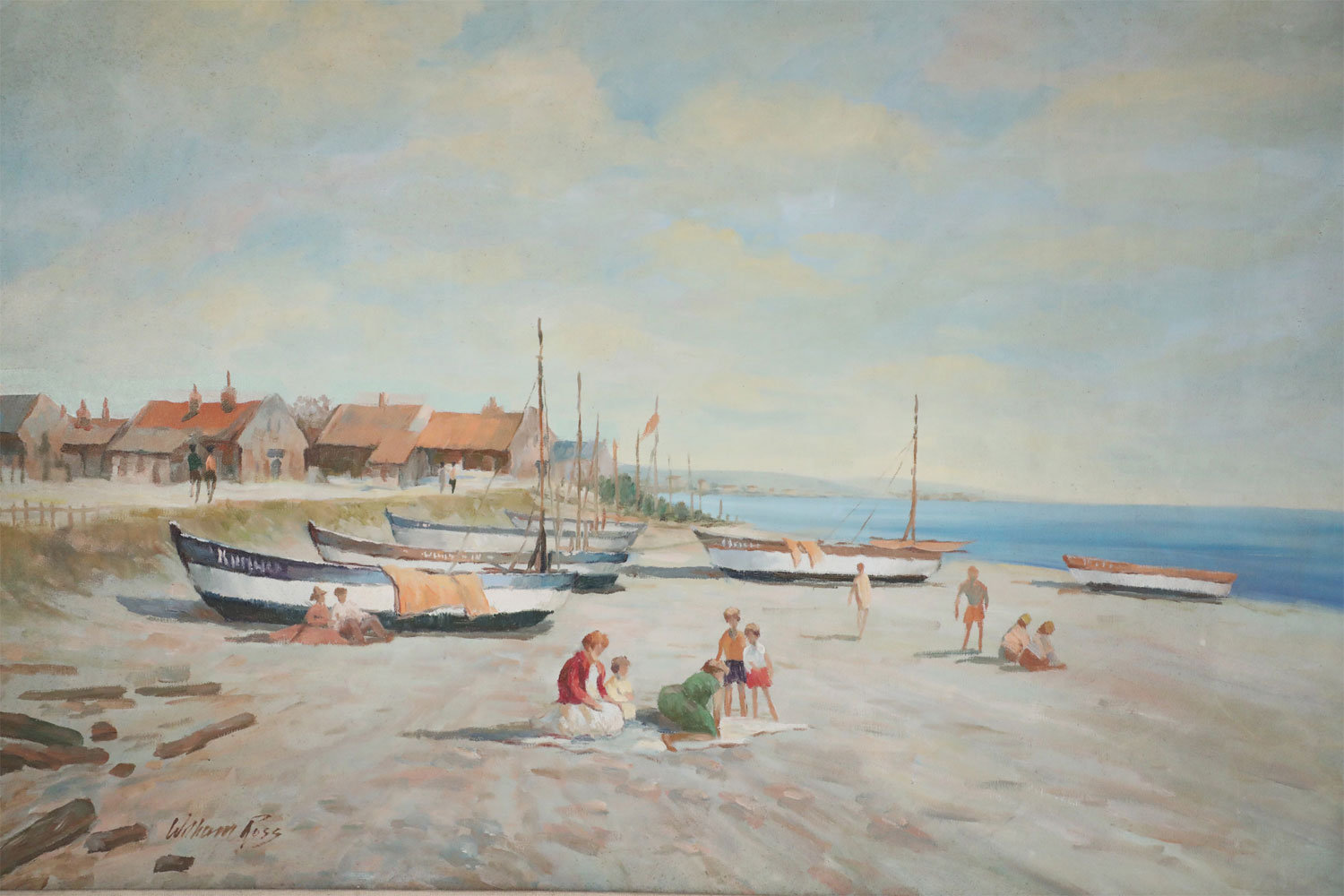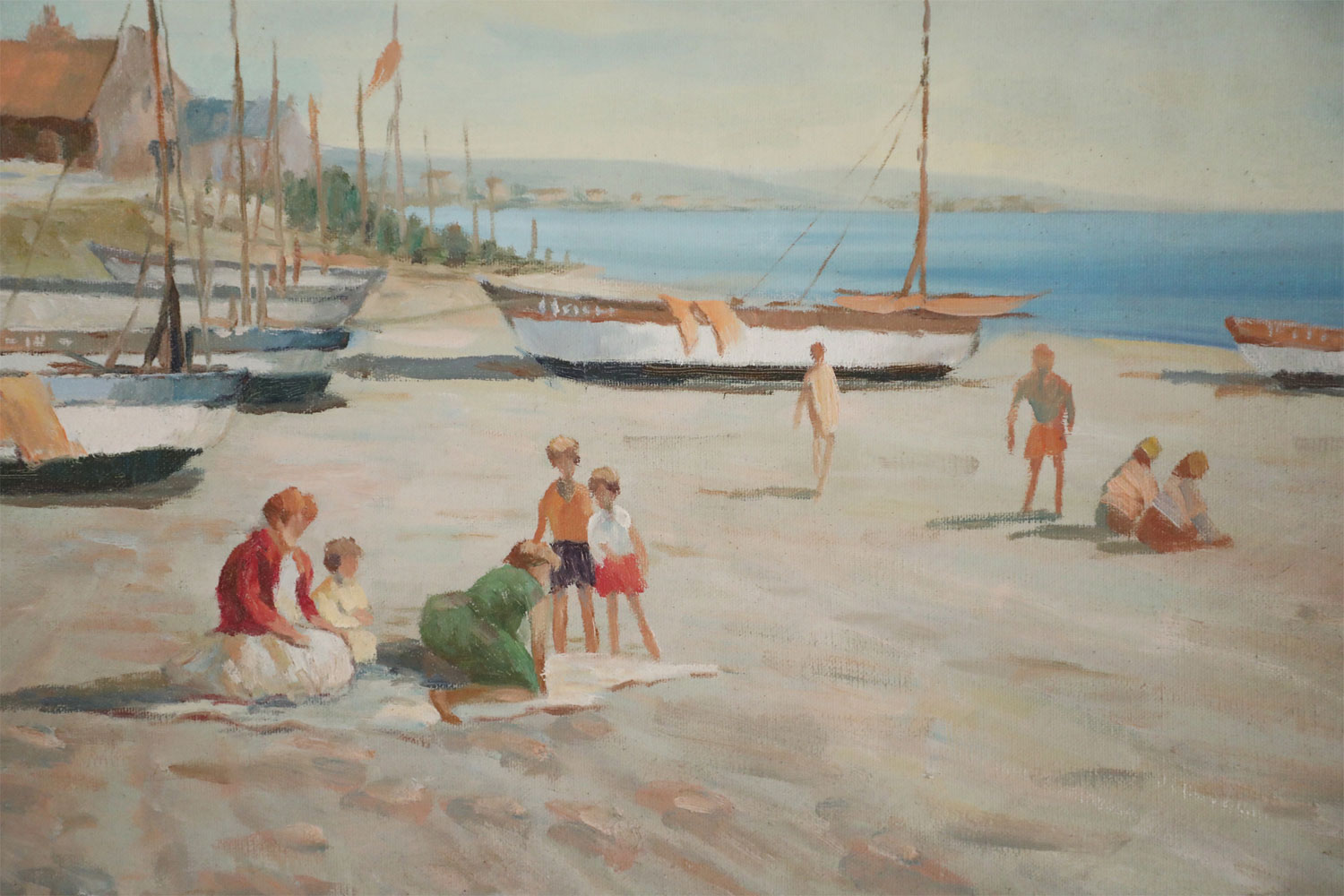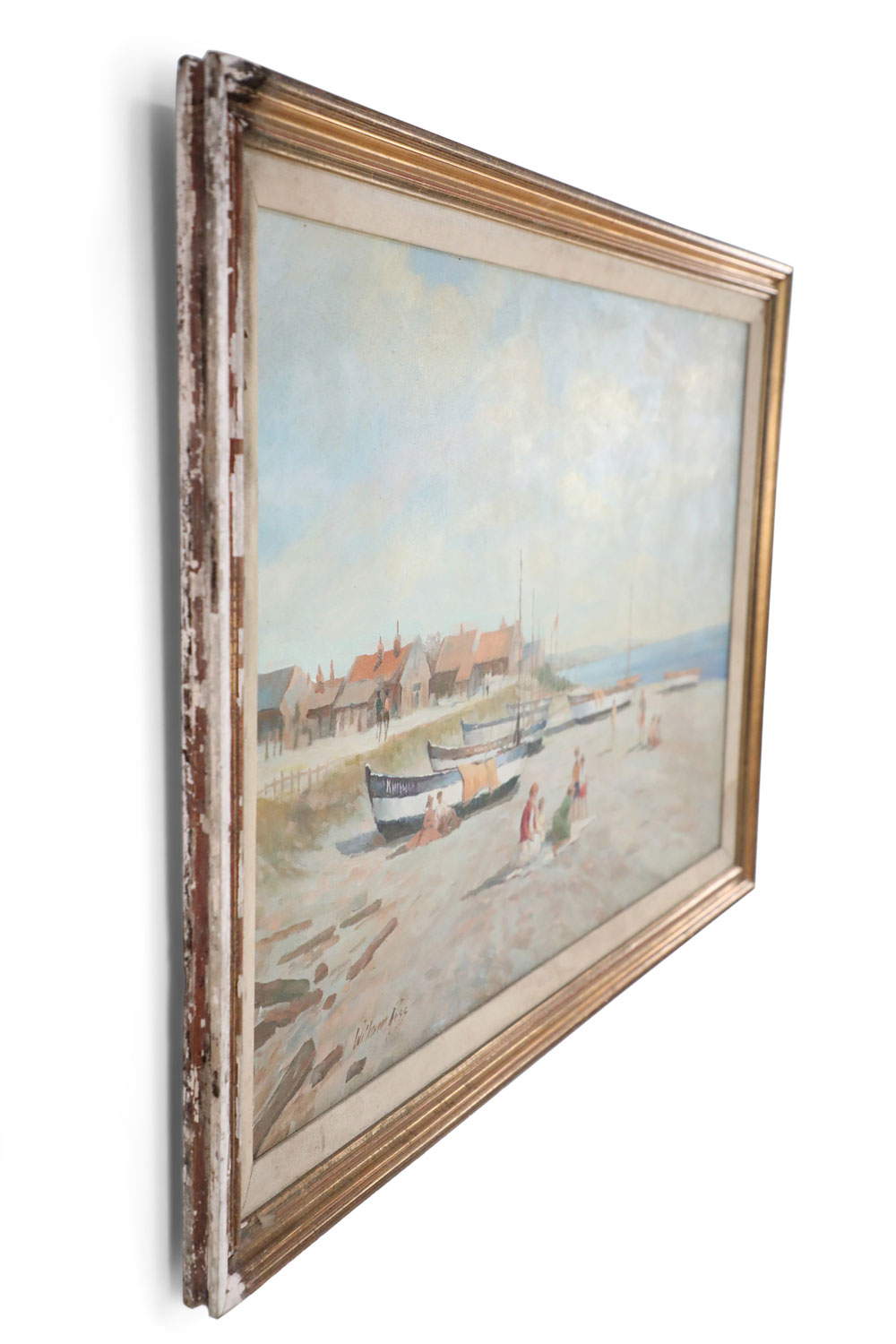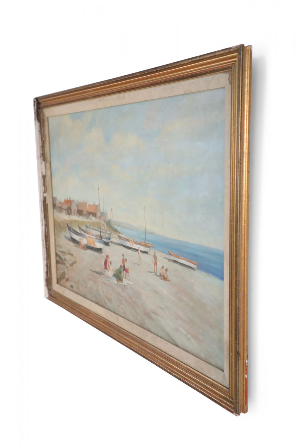 Vintage oil painting depicting boats pulled ashore alongside families in the sand, and a red roofed village in the distance, in a heavily distressed gold frame with a cloth liner.